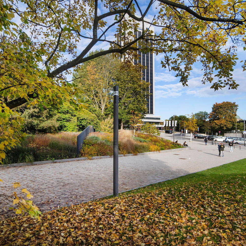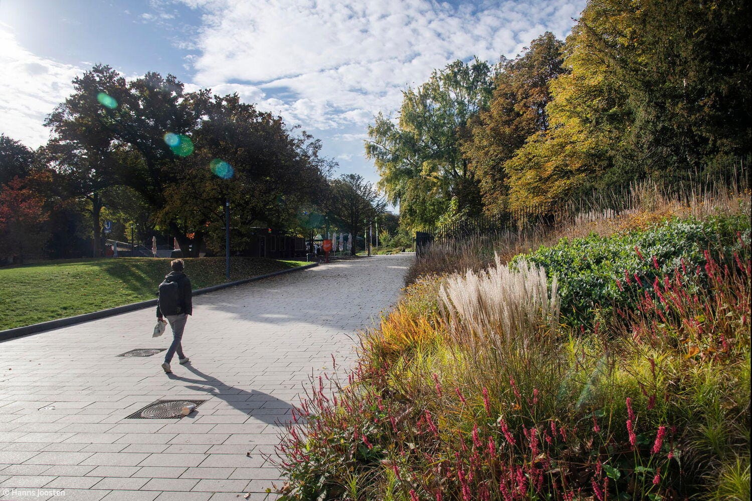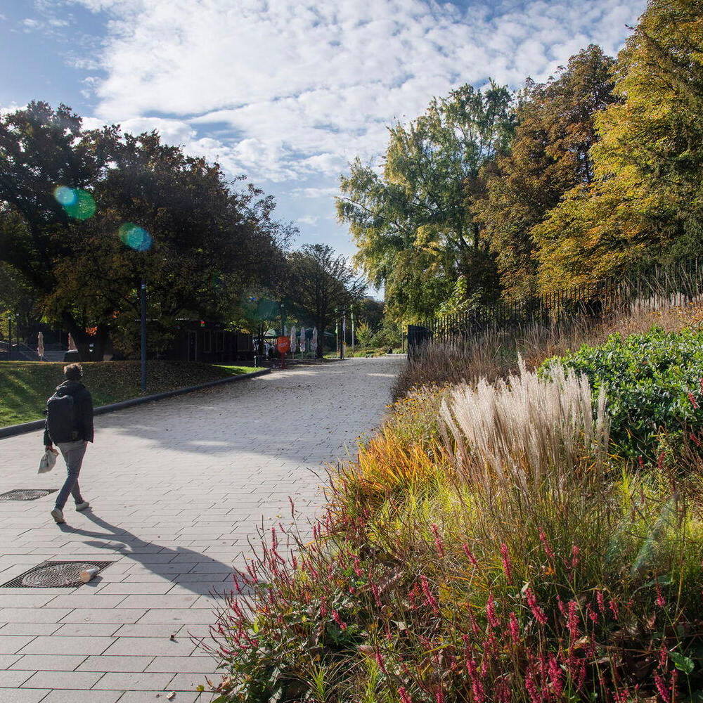 Dort, wo zuvor der dunkle Betontrog der vierspurigen Marseiller Straße die Parkanlage durchtrennt hatte, entstand eine Esplanade zum Flanieren – eine Abfolge heller, einladender Pflanzungen und Plätze, ergänzt durch einen Parkbalkon mit Blick über den neugestalteten Dag-Hammarskjöld-Platz, das neue, hell gepflasterte Vorzimmer zum Alten Botanischen Garten. Die früher dunkle und steinerne Atmosphäre wandelt sich durch sonnige, grüne Terrassen in einen Ort des Lichts und bildet so einen Auftakt nach Maß zu den neuen Parkeingängen und der Marseiller Esplanade. Die neu geschaffene Abfolge verschiedener Plätze und Grünbereiche, gepaart mit der Inszenierung neuer Sichtbeziehungen, formt die Einzelbereiche des Parks erstmalig zu einem harmonischen Ensemble, das mit dem Deutschen Landschaftsarchitektur Preis 2025 in der Kategorie „Pflanzenverwendung“ ausgezeichnet wurde.