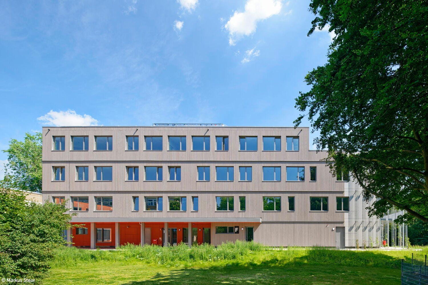 Da das Gebäude als Interimsgebäude zur Bundestagswahl 2021 fertig sein musste und wenig Zeit zur Verfügung stand, entschieden sich die Architekten für eine Holzmodulbauweise. Die einzelnen Bauteile wurden fertig angeliefert. Werkseitig wurden sie bereits mit Fensterelementen, einem Holzrahmen mit Wärmedämmung und integrierter Sonnenschutzanlage sowie einer Unterkonstruktion für die Fassadenbekleidung aus farbigem Glas ausgestattet. Die Holzmodule sind schnell auf- und abbaubar und können an anderer Stelle wieder verbaut werden. Jedes der Module misst 3,20 mal 6,75 Meter. Sie sind in den vier Gebäudeflügeln jeweils an einem zentral liegenden Flur angeordnet und bestehen fast vollständig aus nachhaltig produzierten Vollholz-Elementen. Gefertigt wurden sie in Berlin, was kurze Transportwege und geringe Emissionen einschloss. Die Bodenplatte, Technikräume und das zentrale Atrium wurden aus Stahlbetonfertigteilen errichtet.