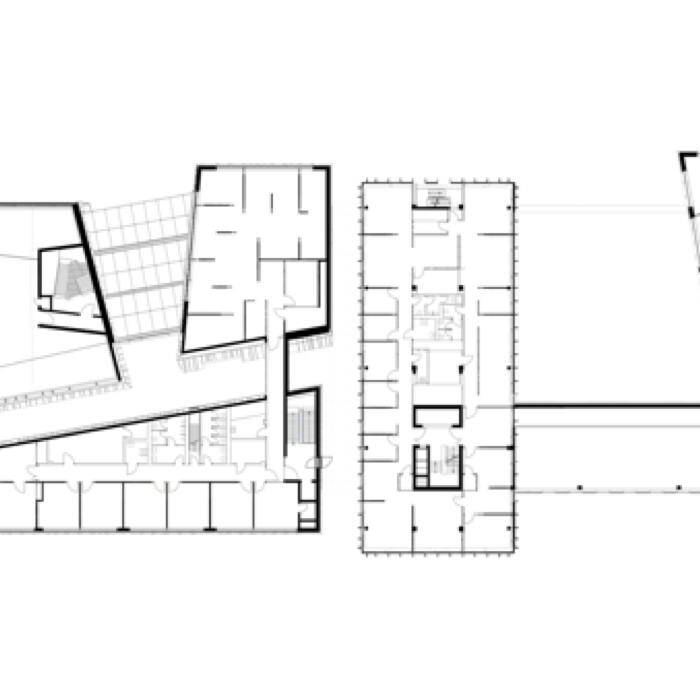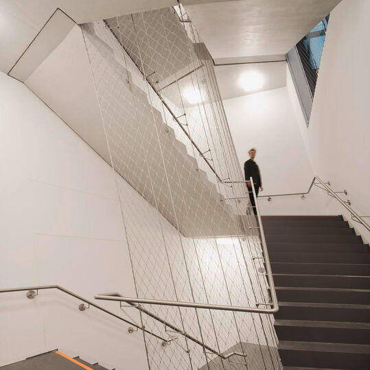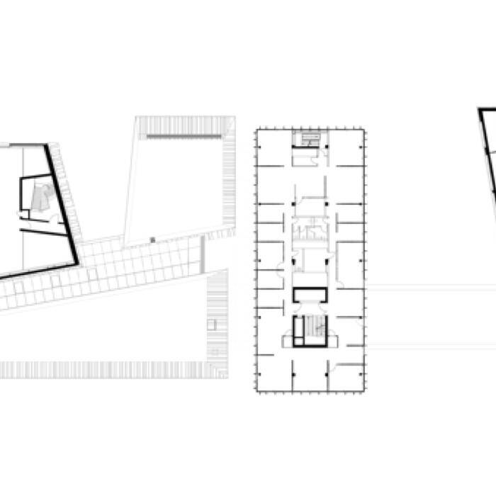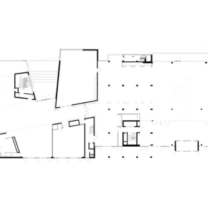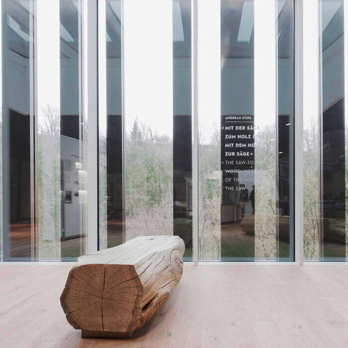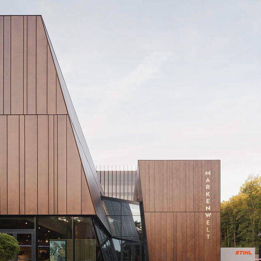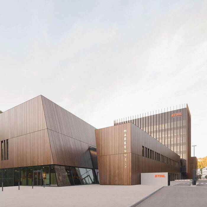 Das Entwurfskonzept der neuen Markenwelt am Stammsitz des weltweit agierenden Unternehmens Stihl basiert auf der Idee, die Hauptfunktionen des Raumprogramms mit Ausstellungs-, Konferenz- und Büroflächen in ablesbaren Baukörpern zu integrieren. Westlich des Hochhauses positioniert, entwickelt sich die Kubatur auf dem Untergeschoss des bisherigen Produktvorführzentrums. Schräg geführte Einschnitte „zersägen“ sinnbildlich den Baukörper, verleihen ihm eine skulpturale Anmutung und verweisen auf das weltbekannte Produkt des Bauherrn. Der große Längsschnitt öffnet eine zentrale Erschließungsachse und leitet Besucher:innen in die Ausstellung. Die Ausstellungsflächen erstrecken sich über drei Ebenen, die an drei tragenden Betonelementen aufgehängt stützenlos zu schweben scheinen. Blickbeziehungen zu den jeweiligen Themenfeldern der Schau erlauben eine gute Orientierung und geben dem Innenraum seine spannungsreiche und unverwechselbare Charakteristik.