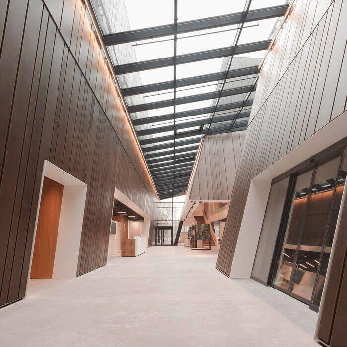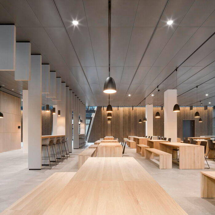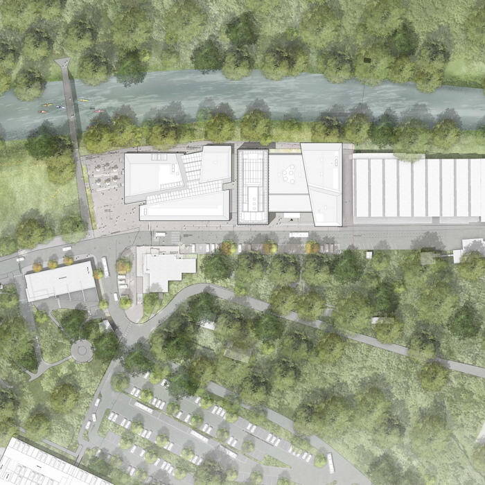 Das zu allen Seiten verglaste Erdgeschoss erzeugt einen unmittelbaren Bezug zum Landschaftsraum der Flussaue und des Flussufers. Im Bereich des Cafés und Fanshops verstärkt die dem Geländeverlauf zur Rems folgende Abtreppung der Raumzonen den Eindruck der einfließenden Landschaft. Auch die vorgehängte, hinterlüftete Fassade in patiniertem Messington bettet die Baukörper in den Naturraum des eng geschnittenen Tals. Formgebung und Materialität der Markenwelt finden sich auf der anderen Seite des Hochhauses im zweiten neuen Baukörper mit Büros in den Obergeschossen und dem neuen Betriebsrestaurant im Erdgeschoss wieder. Durch den sich zum Remsufer verbreiternden Gebäudekörper wurden an der attraktiven Uferseite zusätzliche Büroarbeitsplätze geschaffen.