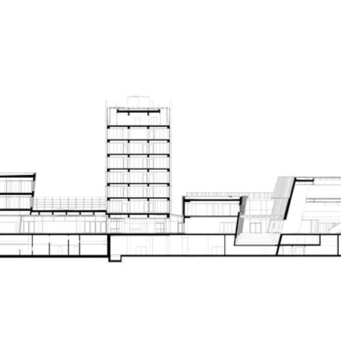 Ergänzt wird das Ensemble der beiden Neubauten durch das Bestandshochhaus aus den 1970er-Jahren, das umfassend saniert wurde. Auf sechs Etagen sind moderne Arbeitsplätze, Besprechungsräume und Aufenthaltsbereiche entstanden. Ein repräsentatives Foyer empfängt Mitarbeitende und Gäste. Vertikale Lamellen prägen die Fassade, die die Farbe und das Material der Markenwelt aufgreift. Durch die Tiefe der Lamellen von 20–40 Zentimetern und deren Anordnung in einem Abstand von ca. 140 Zentimetern erscheint die Fassade in der perspektivischen Ansicht als geschlossene Fläche und bindet das Hochhaus in das Erscheinungsbild des neuen Gebäudeensembles der Markenwelt und des Betriebsrestaurants ein. Da für die Verglasung der Hochhausfassade elektrochromes Glas verwendet wurde, konnte auf einen außenliegenden Sonnenschutz verzichtet werden.