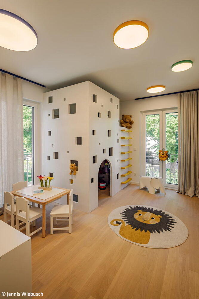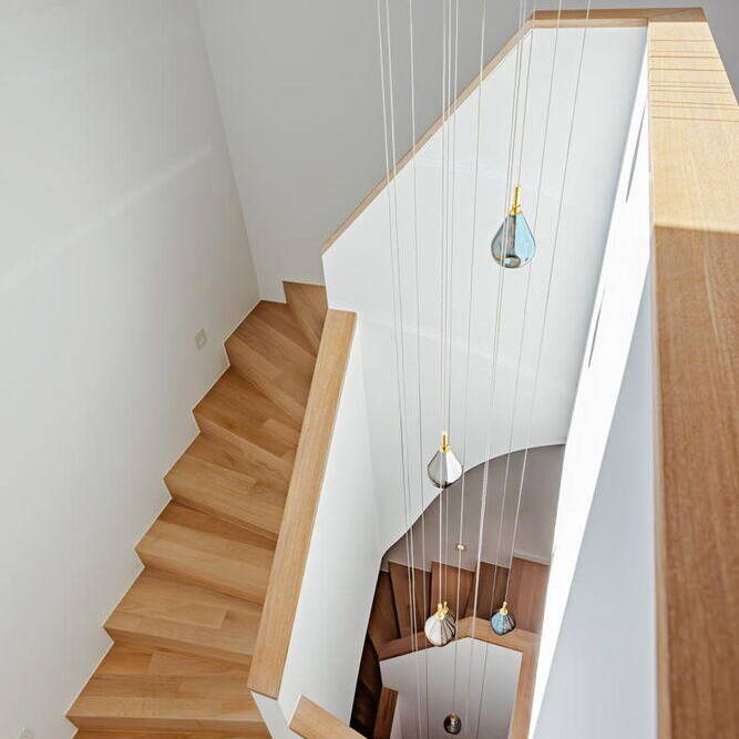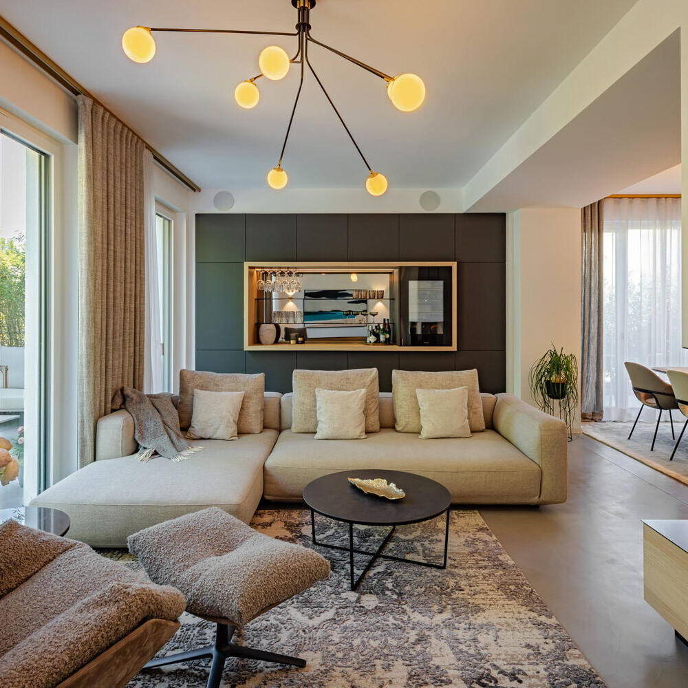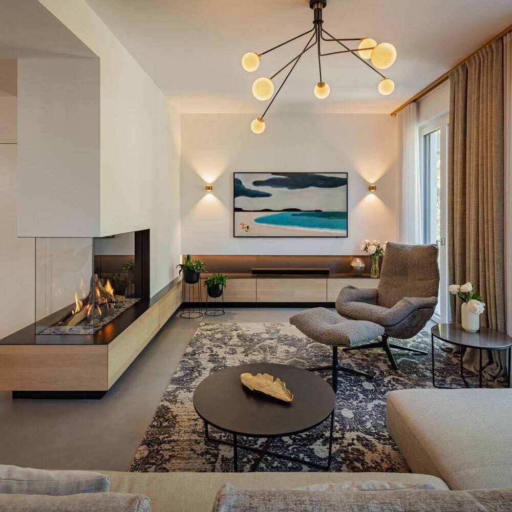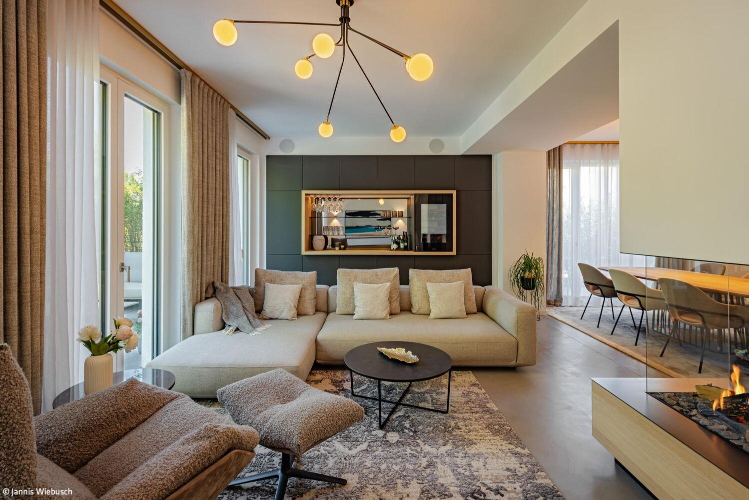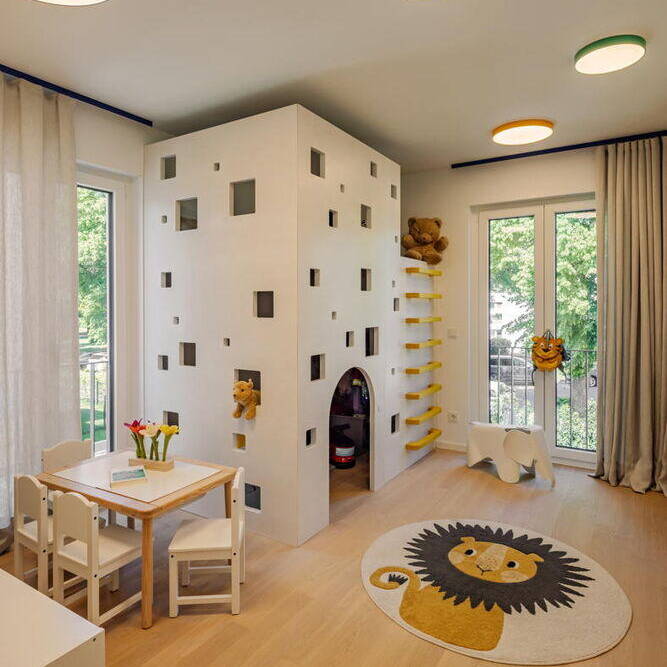 Der ursprüngliche Neubau, den der Bauträger auf diesem Grundstück errichtet hatte, entsprach nicht den persönlichen Vorstellungen der Familie. Gemeinsam mit dem Architekturbüro OneContact wurde das Projekt grundlegend überarbeitet, um den Bedürfnissen der Bewohner:innen gerecht zu werden. Das Ergebnis ist ein maßgeschneidertes Zuhause, das in jedem Detail auf die Wünsche und den Alltag der Familie abgestimmt ist. Im Erdgeschoss öffnete sich durch den Rückbau zweier tragender Wände der Raum: Eine großzügige Sichtachse verbindet nun Küche, Essbereich und Wohnzimmer. Bodentiefe Fenster öffnen den Blick auf den liebevoll gestalteten Stadtgarten. Der dreiseitig einsehbare Gaskamin fungiert als subtiler Raumteiler und schafft Atmosphäre. Ergänzt wird das Ensemble durch einen maßgefertigten Einbauschrank mit integrierter Bar und Weinkühlschrank. Der Keller wurde ebenfalls neu konzipiert. Hier entstand neben praktischem Stauraum für die Familie ein Fitnessraum mit fließendem Übergang in einen Wellnessbereich mit Sauna und großzügiger Dusche. Eine Lüftungsanlage mit Wärmerückgewinnung ergänzt das technische Konzept. Gestalterisch dominiert ein zurückhaltender Industrielook, der dem Sport- und Erholungsbereich eine klare, zeitgemäße Atmosphäre verleiht. Ein besonderes gestalterisches Element bildet das neu konzipierte Treppenhaus, das die Etagen in Weiß und Eiche verbindet. Highlight ist eine Pendelleuchte mit unterschiedlich langen Lichttropfen, die sich vom Dachgeschoss bis ins Erdgeschoss erstreckt. Dieses Lichtobjekt verleiht dem Treppenraum eine skulpturale Qualität und setzt einen markanten Akzent im Inneren. Das erste Obergeschoss ist dem Nachwuchs gewidmet: Zwei Kinderzimmer, ein Spielzimmer mit integriertem Holzspielhaus und Kletterleiter sowie ein kindgerechtes Bad schaffen hier ein echtes Kinderparadies. Ein Gästezimmer rundet die Etage ab. Das Dachgeschoss ist der private Rückzugsort der Eltern. Der optimierte Grundriss führt vom Badezimmer über das Schlafzimmer bis in den begehbaren Kleiderschrank. Ergänzt wird die Etage durch ein lichtdurchflutetes Homeoffice mit zwei Arbeitsplätzen und individuell gefertigter Möblierung. Technologisch ist das Haus voll vernetzt: Eine umfassende Smart-Home-Steuerung sorgt für Komfort und Effizienz. Die Terrasse erweitert den Wohnraum ins Freie. Das Lichtkonzept inszeniert jeden Raum auf subtile und doch wirkungsvolle Weise. Die Neugestaltung des Neubaus zeigt, wie aus einem standardisierten Entwurf durch architektonisches Feingefühl und individuelle Planung ein maßgeschneidertes Zuhause entstehen kann.