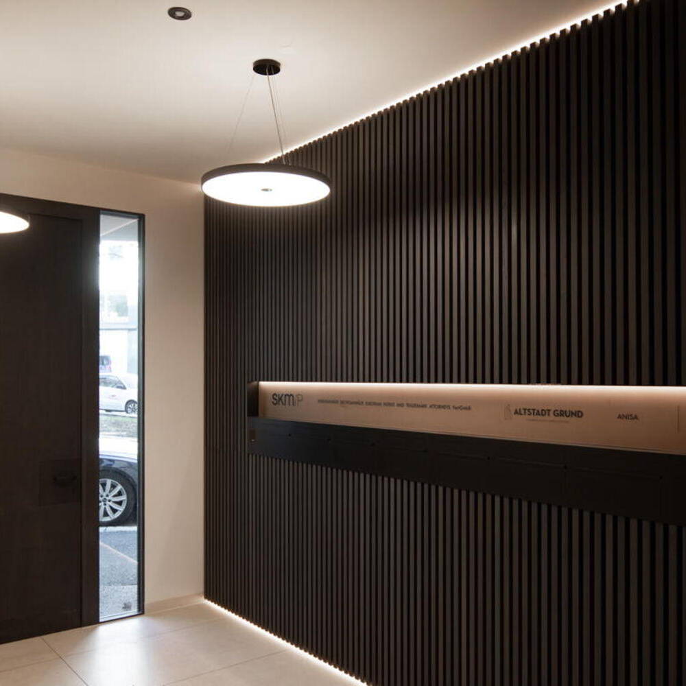 Besonderes Augenmerk wurde auf die Gestaltung des Eingangsbereichs gelegt: Eine mit Natursteinlamellen verkleidete, schräg gestellte Wand leitet Besucher:innen zur zurückversetzten Haustür. Die Lamellenstruktur wird im Gebäudeinneren bei der hinterleuchteten Briefkastenwand aus dunklem Holz fortgeführt.