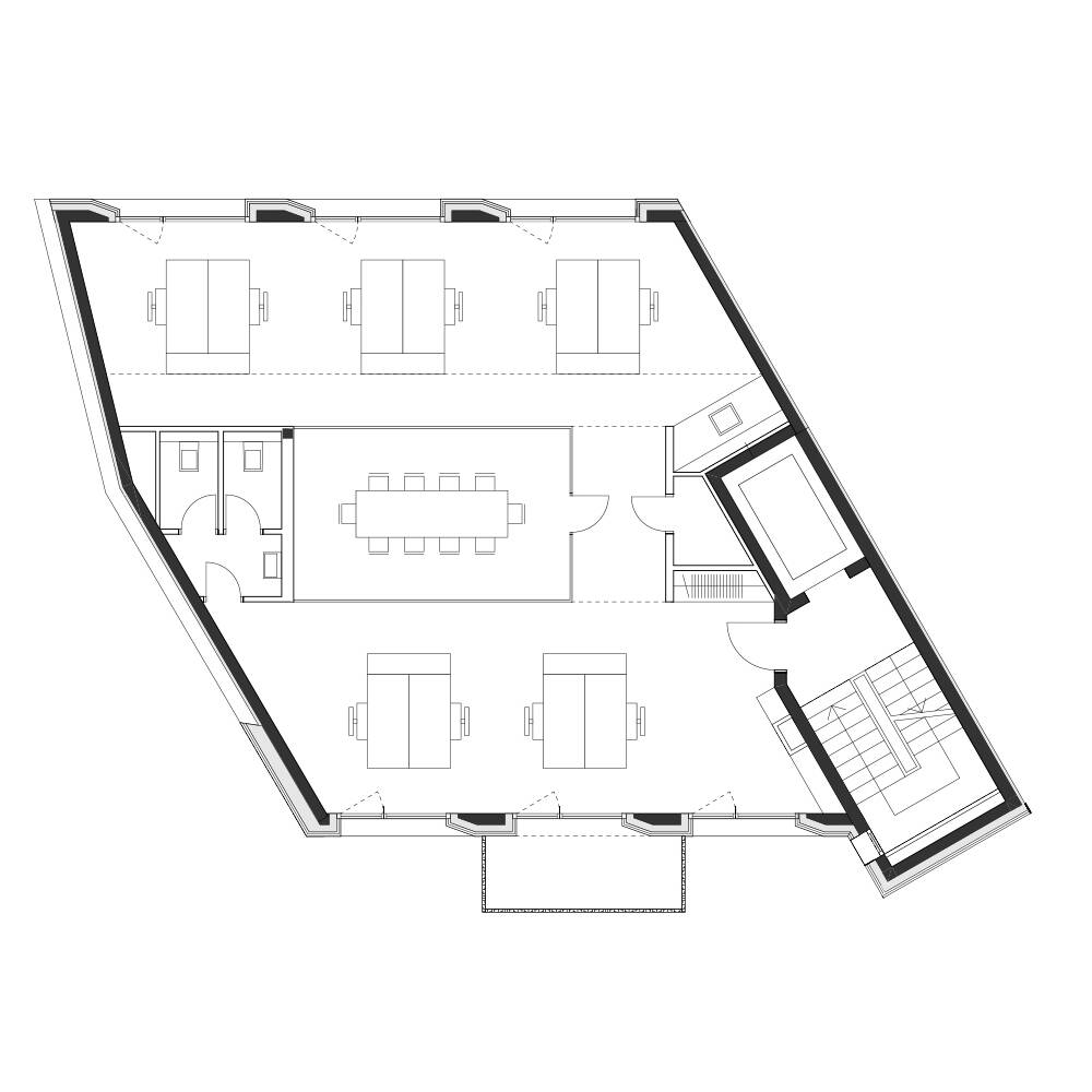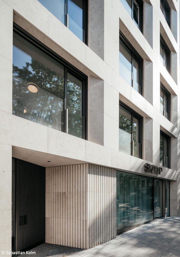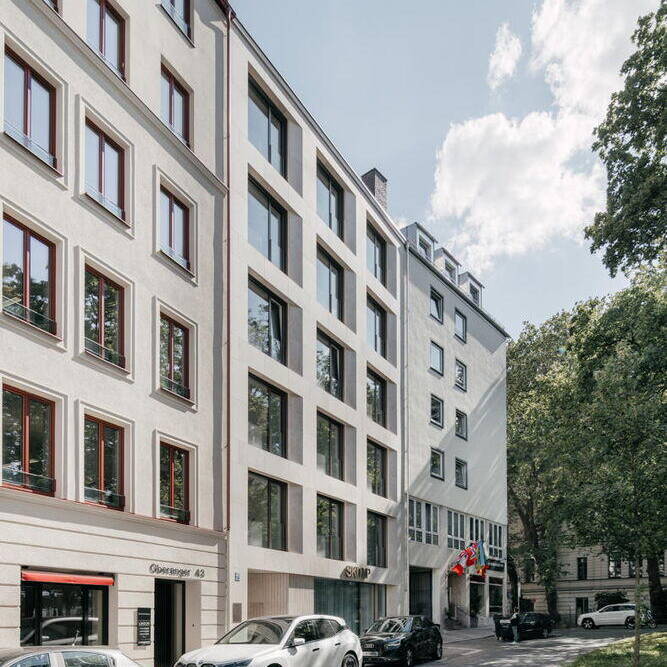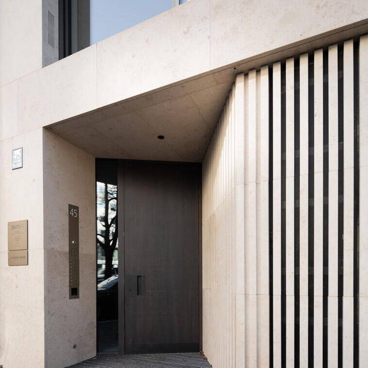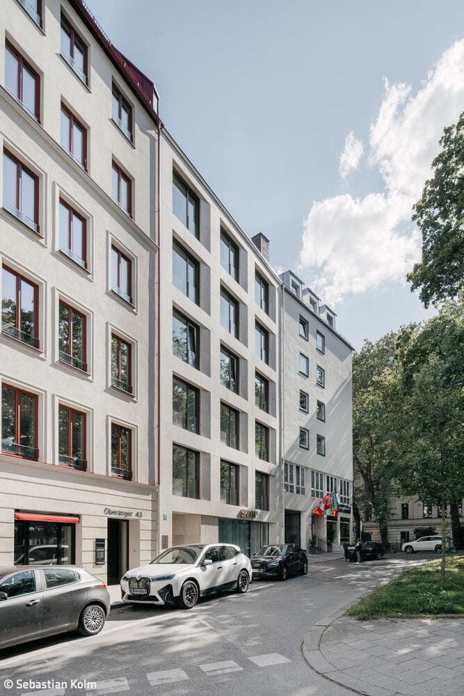 Die Planer des neuen Gebäudes sind Neufeldt.Voigt Architekten aus München, die einen ganzheitlichen Ansatz durch alle Leistungsphasen verfolgen. Konsequent kommen hochwertige, aufeinander abgestimmte Materialien zum Einsatz. Durch einen kreativen Dialog mit der Bauherrschaft werden deren Bedürfnisse und Wünsche so präzise wie möglich berücksichtigt. Bei dem Neubau handelt es sich um ein Mixed-Use-Gebäude mit einer Gewerbeeinheit im Erdgeschoss, vier Büroetagen und einer Maisonettewohnung im 5. und 6. Obergeschoss mit großer Dachterrasse und einem Panoramafenster mit Blick auf die historische Altstadt. Mit seiner zurückhaltenden Architektursprache fügt sich das Haus dezent in seine Nachbarschaft ein. Dennoch fallen die edle Natursteinfassade aus horizontalen und vertikalen, großformatigen, hellen Juraplatten sowie die bronzefarbenen Fensterrahmen mit breiten Laibungen ins Auge, die sich qualitativ von den Nachbarhäusern abheben. Die leichte Schrägstellung der rahmenlosen Fenster in der dreiachsigen Lochfassade richtet sich auf den nahegelegenen Sendlinger-Tor-Platz aus. Auf der rückwärtigen Hofseite verfügen die Etagen über weit auskragende Balkone.