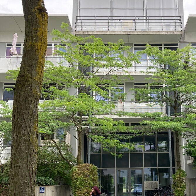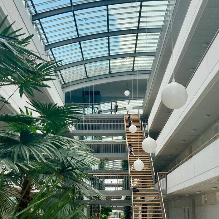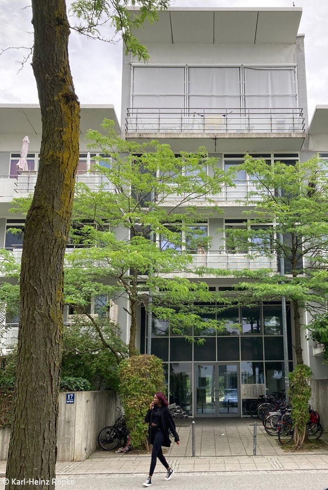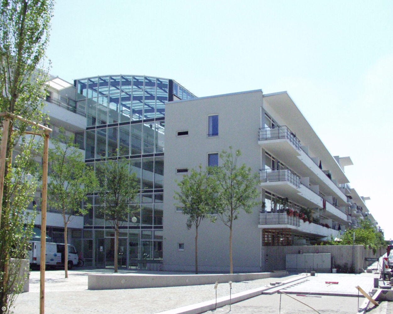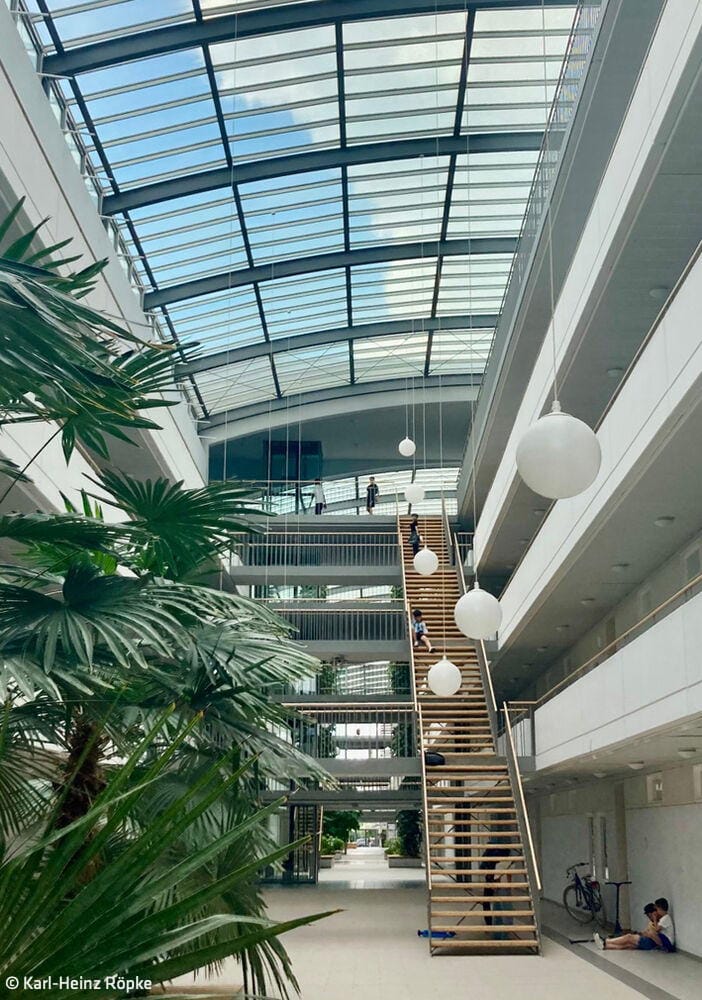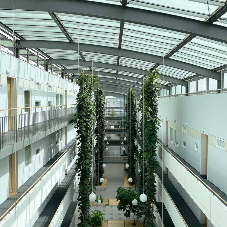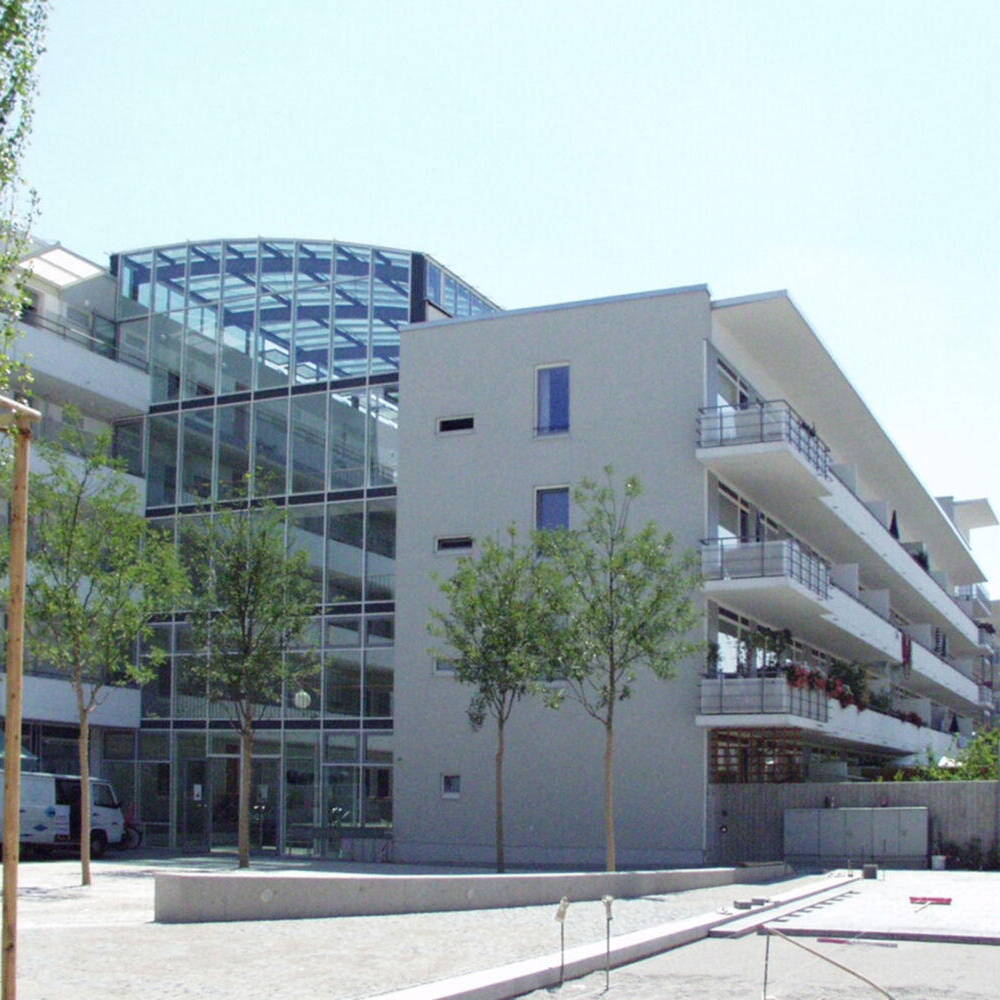 25 Jahre später: Im legendären Galeriahaus in Riem findet eine Jubiläumsfeier zum 25. Geburtstag des Hauses statt, mit „Urhebern“, Bewohner:innen und prominenten Gästen. Alt-Oberbürgermeister Christian Ude hält eine humorige, aber sachkundige Rede. Das Wohngebäude war 1999 eines der ersten, die nach der Verlegung des Flughafens und dem Bau der Messehallen den Auftakt für den neuen Stadtteil Riem bildete. Der geniale Entwurf stammt vom Münchner Architekten Karl-Heinz Röpke. Bei einer exklusiven Führung wird er ständig von Mieter:innen der ersten Stunde gegrüßt – wer hier wohnt, zieht nie wieder weg. Ermöglicht wurde das Bauvorhaben durch den großzügigen Bauherrn Max Aicher, dem das Gebäude bis 2013 gehörte. Danach ging es in den Besitz der GWG Stuttgart über. Das 200 Meter lange Wohnhaus besteht aus zwei Riegeln, einem vier- und einem fünfgeschossigen, die einander gegenüberstehen. In der Mitte verläuft eine breite „Straße“, als Erschließungsachse, Begegnungs- und Veranstaltungsort verbindendes Element. Das Ensemble wird mit einem Glasdach überspannt. Dies, wie auch die gläsernen Fassaden der Haupteingänge im Süden und Norden schützen den Innenraum und versorgen ihn mit natürlichem Tageslicht. Über zwei lange, in die oberen Geschosse führenden „Himmelsleitern“ können alle Wohnungen erreicht werden. Zwei verglaste Aufzüges sind so angeordnet, dass sie von allen Eingängen aus, auch von den zusätzlichen an den Seiten, leicht zu erreichen sind. Die ursprünglich kleinen Pflanzen, für die im Innern automatisch bewässerte Beete angelegt wurden, sind über die Jahre zu Bäumen, Palmen und riesigen rankenden Hopfenstauden herangewachsen und verwandeln den „Korridor“ in eine begrünte, 150 Meter lange Wandelhalle. Die Anlage umfasst insgesamt 172 unterschiedlich große barrierefreie Wohnungen für circa 500 Bewohner:innen. Alle verfügen über Balkone, auf der Ostseite mit Blick auf einen innenliegenden kleinen Park, auf der Westseite zur Straße hin. Das langgezogene, 1.500 m² große Atrium kommt ohne Klimaanlage aus. Klappfenster in den Glasdächer sorgen für die Durchlüftung. Schächte im Sockelbereich leiten die warme Abluft aus den Wohnungen über Wärmeaustausch ins „Foyer“, sodass im riesigen Luftraum im Innern stets eine angenehme Temperatur herrscht. Bereits damals baute man kostengünstig mit Betonfertigteilen, verwendete ökologische Materialien und verlegte sogar eine Fußbodenheizung. Das Galeriahaus war und ist eine neue Idee des sozialen Wohnungsbaus mit städtischer Förderung. Die Wohnungen sollen sozial schwachen Interessenten helfen, eine bezahlbare Bleibe zu finden. Die kluge und intelligente, bis ins Detail durchdachte Entwurfsidee des Galeriahauses ist bis heute unübertroffen.