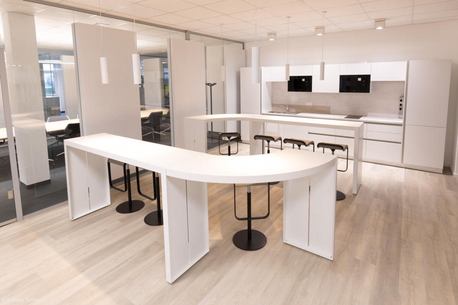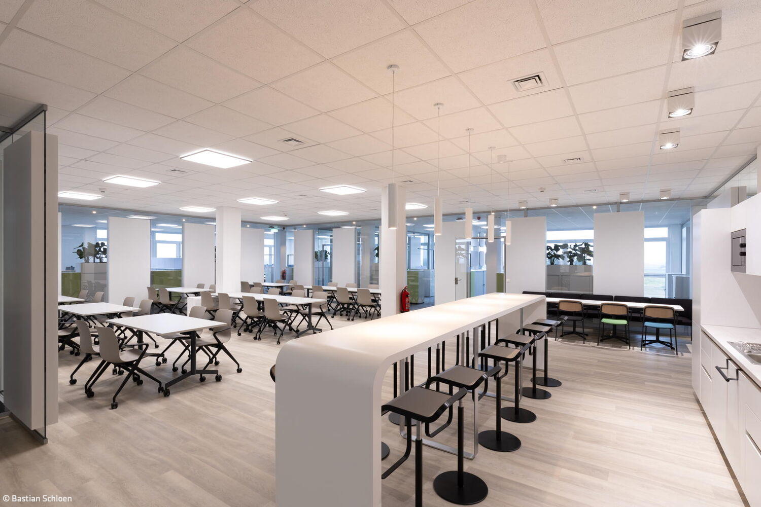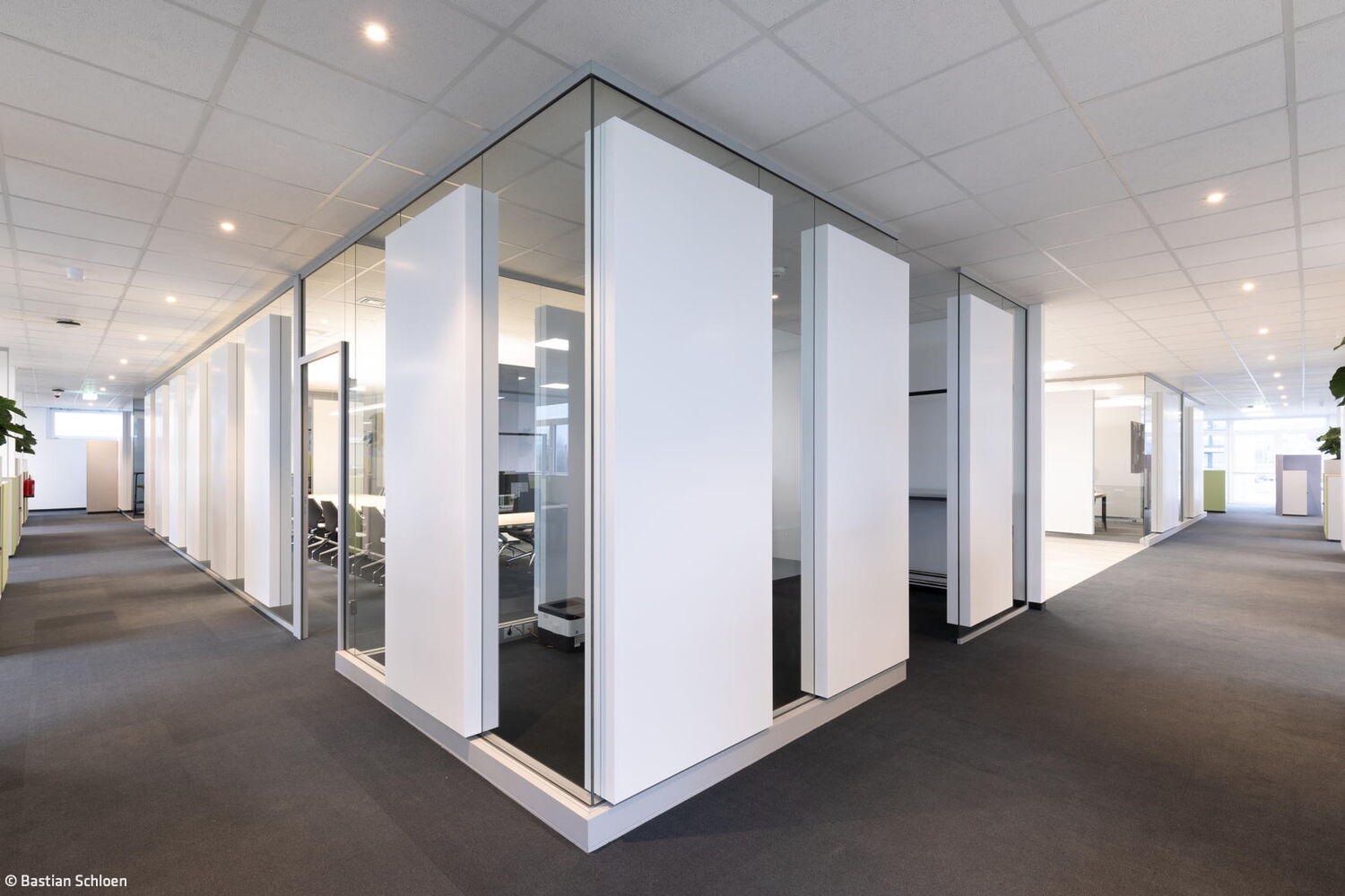Durch das Zusammenspiel der verschiedenen Worksettings entstand eine Arbeitsumgebung mit Wohlfühlcharakter. „Aus unserer Sicht hat die Stadt Bornheim mit der Realisierung des Konzepts als eine der ersten kommunalen Verwaltungen historische Strukturen aufgebrochen“, sagt Adam und fügt hinzu: „Hier konnte etwas entstehen, das alles ist – nur kein klassisches Verwaltungsgebäude mit langen Fluren sowie Einzel- und Doppelbüros.“ Die Bornheimer Stadtverwaltung bezog eine Arbeitsumgebung, die durch eine offene Bürolandschaft geprägt ist. Diese wird durch transparente Glas-Akustik-Wände zoniert, wobei nur kleine Einzelbüros für die Amtsleitungen sowie zentrale Treffpunkte integriert sind. Das Konzept ist konsequent auf die Bedürfnisse der Mitarbeitenden und ihre Arbeitsweise ausgerichtet und fördert eine kollaborative und flexible Arbeitskultur.