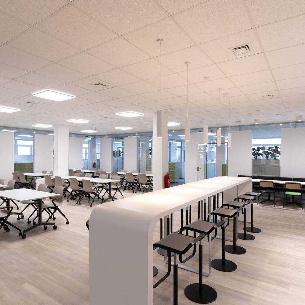 Im Rahmen einer umfassenden Machbarkeitsstudie wurden zunächst die Zonierung der Gesamtfläche analysiert und partizipative Workshops mit den Mitarbeitenden durchgeführt. Dabei stand im Fokus, Unsicherheiten abzubauen und eine positive Erwartungshaltung gegenüber den Veränderungen zu fördern. Analysieren, informieren, planen – darum ging es dem Team von Mensch im Büro. Im Anschluss konnte es an die Entwicklung eines Innenraumkonzepts gehen, das eine moderne, offene und einladende Arbeitswelt mit benachbarten Homezones für die verschiedenen Ämter vorsah. Dazu sollte es Kommunikations- und Meetingbereiche sowie Rückzugsmöglichkeiten für fokussiertes Arbeiten geben. Den Mittelpunkt des Büros bilden die Meet & Eat-Flächen. Abgerundet wurde die Planung durch ein Farb- und Designkonzept sowie eine Akustik- und Beleuchtungsplanung. „Vor allem Licht, Akustik und Temperatur spielen eine essenzielle Rolle, die auf die Anforderungen und Bedürfnisse der Mitarbeiter:innen abgestimmt werden mussten“, so Ralf Adam, Geschäftsführer des Consulting- und Planungsunternehmens.
