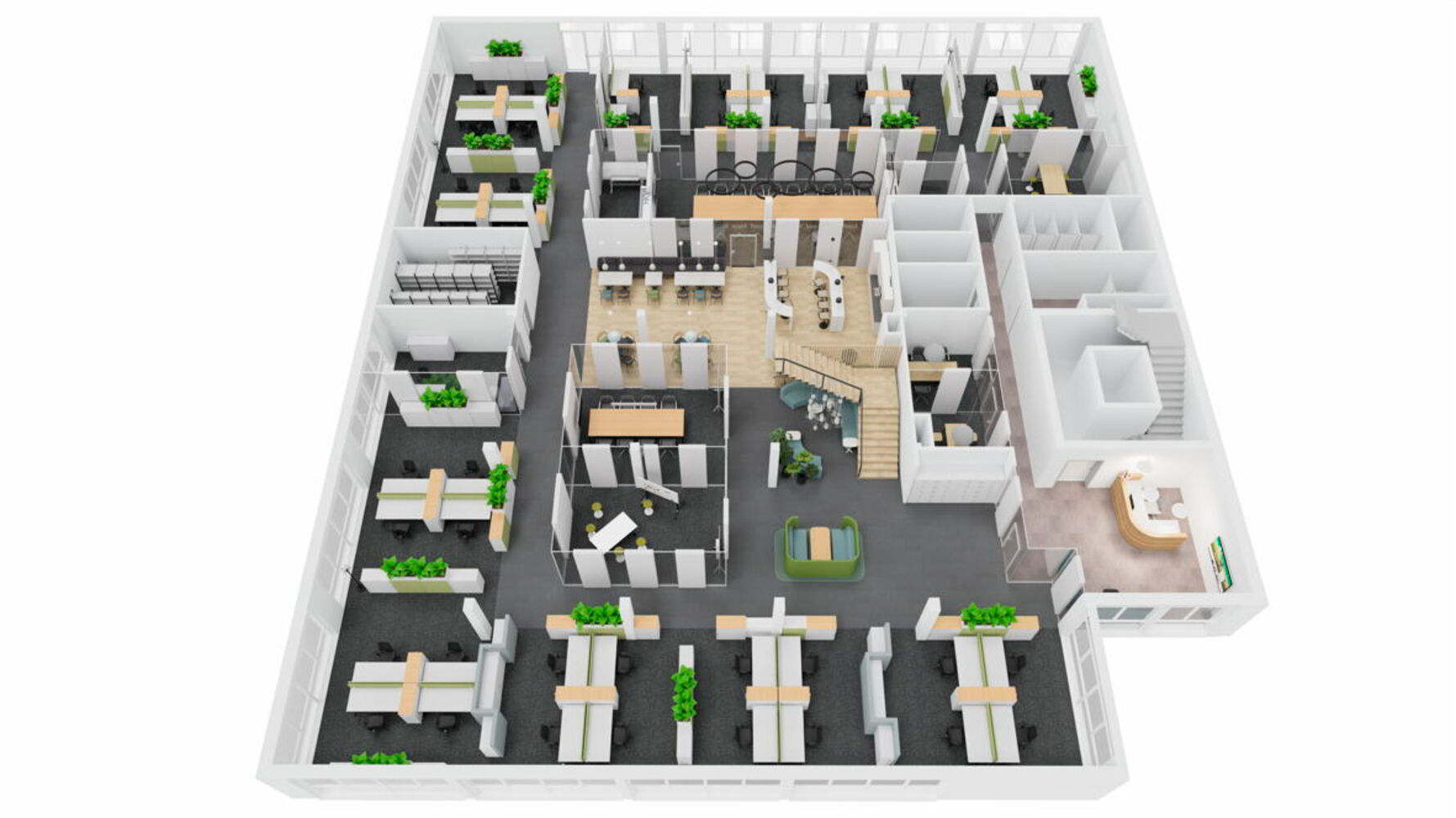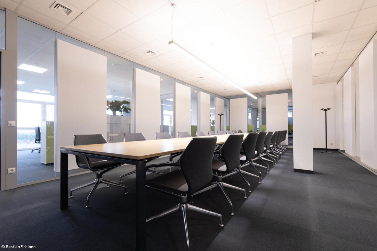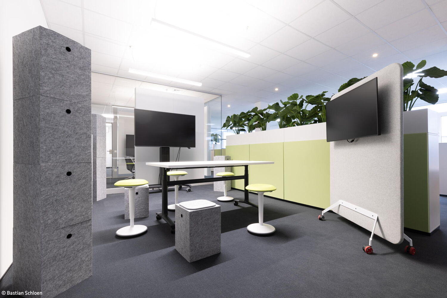 Durch das Zusammenspiel der verschiedenen Worksettings entstand eine Arbeitsumgebung mit Wohlfühlcharakter. „Aus unserer Sicht hat die Stadt Bornheim mit der Realisierung des Konzepts als eine der ersten kommunalen Verwaltungen historische Strukturen aufgebrochen“, sagt Adam und fügt hinzu: „Hier konnte etwas entstehen, das alles ist – nur kein klassisches Verwaltungsgebäude mit langen Fluren sowie Einzel- und Doppelbüros.“ Die Bornheimer Stadtverwaltung bezog eine Arbeitsumgebung, die durch eine offene Bürolandschaft geprägt ist. Diese wird durch transparente Glas-Akustik-Wände zoniert, wobei nur kleine Einzelbüros für die Amtsleitungen sowie zentrale Treffpunkte integriert sind. Das Konzept ist konsequent auf die Bedürfnisse der Mitarbeitenden und ihre Arbeitsweise ausgerichtet und fördert eine kollaborative und flexible Arbeitskultur.