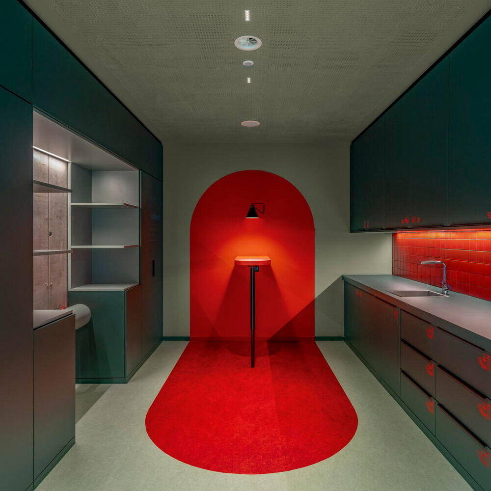 Rollbare Stehtische und Whiteboards eignen sich vor allem für kreative Teamarbeit sowie agile Workshops, die auf Methoden wie Design Thinking basieren. Platz für ungestörte Gespräche in privater Atmosphäre findet sich in der Telefonbox. Akustisch wirksame Decken dämpfen die Geräuschkulisse. Der Raum ist in vier Bereiche unterteilt, darunter drei flexible Workshopbereiche mit Stehtischen sowie ein Eventbereich, der sich mit einer rollbaren Tribüne und variabler Bestuhlung vielseitig nutzen lässt. In die Teeküche mit angenehm ruhiger Beleuchtung und einem Stehtisch trifft man sich gerne zu einer Pause mit informellen Gesprächen. Auch in diesem Bereich spielt das Rot eine wesentliche Rolle. Eine gemütliche Sitzmöglichkeit fördert den spontanen Austausch.