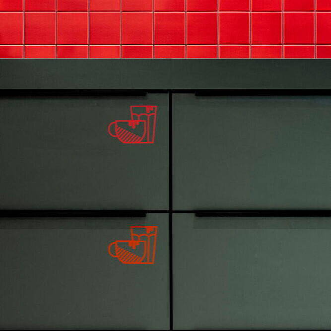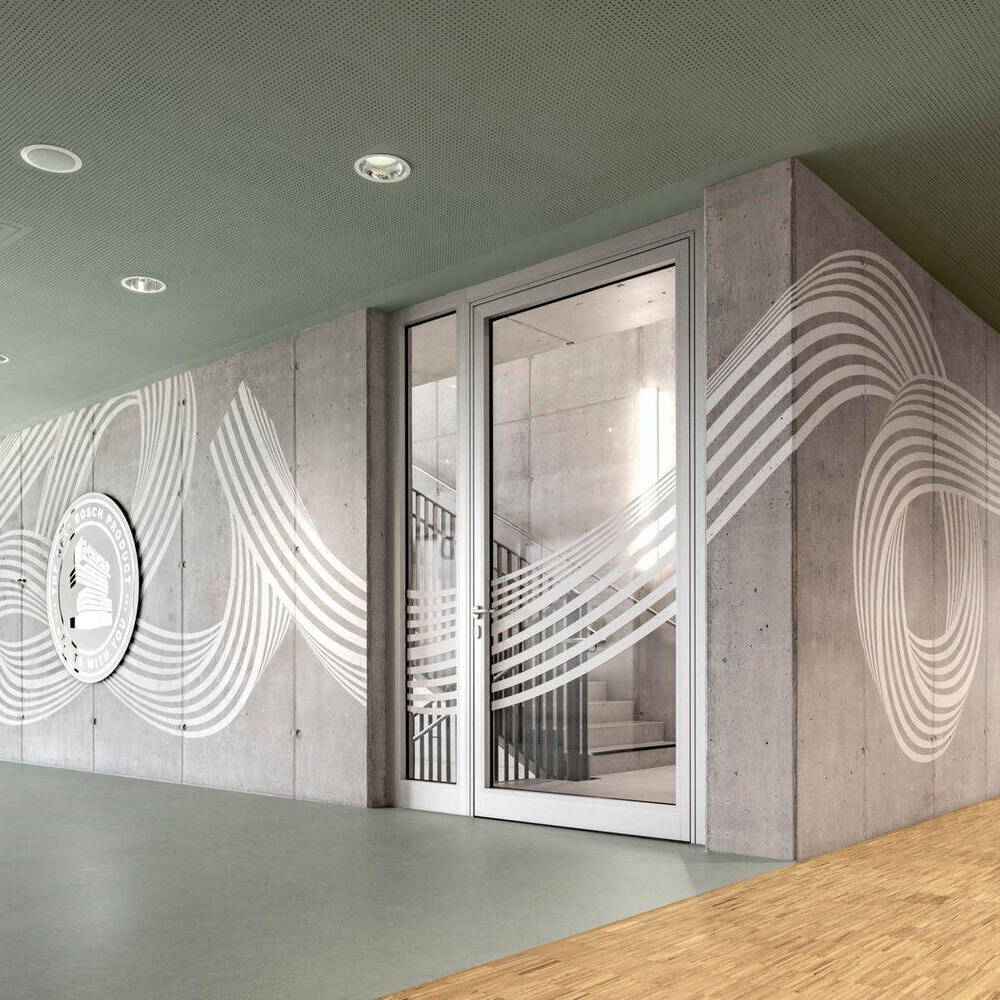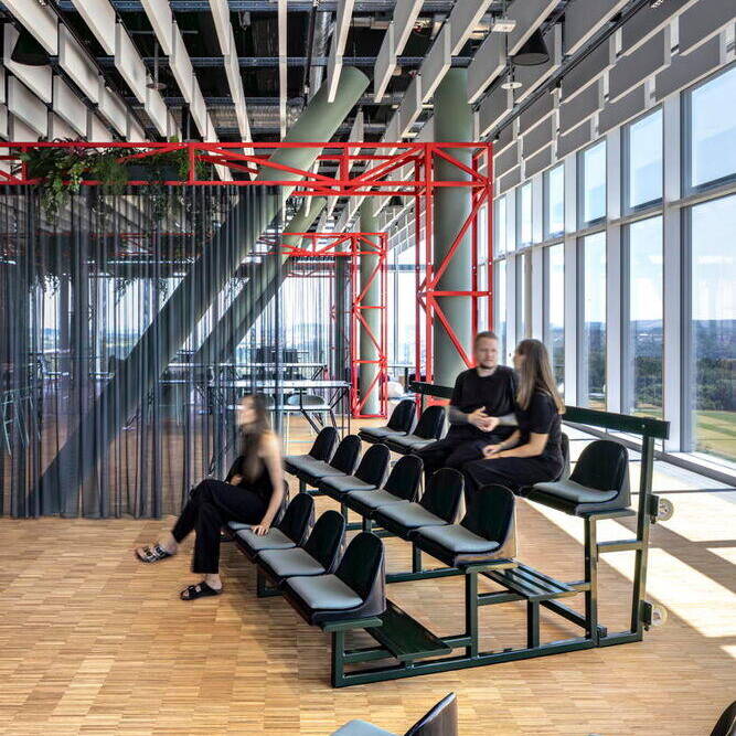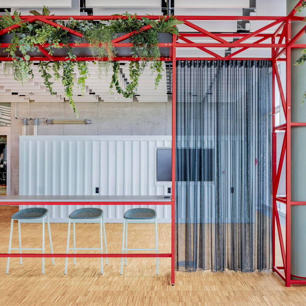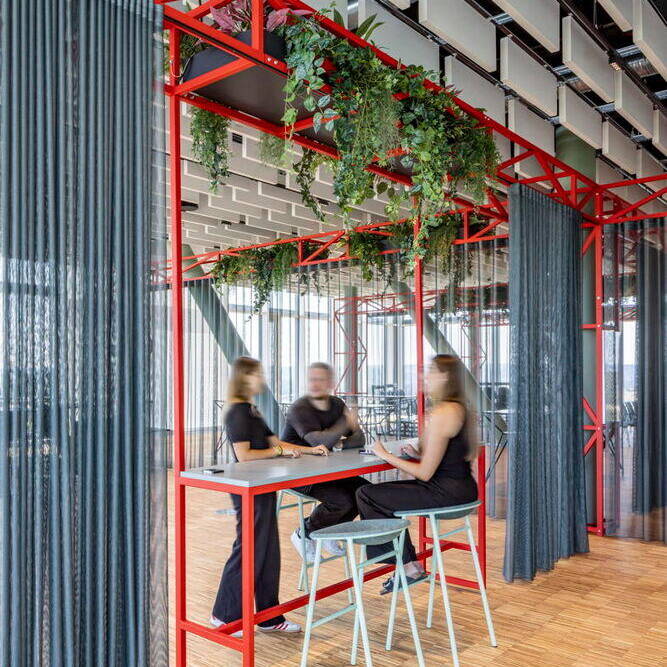 Prägendes Element der Kreativfläche sind die bodentiefen Fenster mit Fernblick in die Umgebung. Sie bringen nicht nur viel Tageslicht in den Raum, sondern vermitteln auch ein Gefühl von Offenheit und Weite. Begrünte Bereiche erzeugen in ihrer natürlichen Frische einen spannenden Komplementärkontrast zu den klar strukturierten Metallrahmen, lackiert in der Unternehmensfarbe Rot. Diese Rahmenelemente integrieren neben der Begrünung auch Vorhänge, mit denen sich die Fläche flexibel und bei Bedarf in Bereiche zonieren lässt. Zudem setzen sie auffallende Akzente. Insgesamt werden kräftige Rottöne als Highlights eingesetzt, um entsprechend der Farbwirkung von Rot eine progressive und gleichzeitig einladende Atmosphäre zu schaffen. Intarsien im Linoleum-Boden verstärken, in Verbindung mit den Wandfarben, optisch die Dreidimensionalität im Raum. Schablonierte Grafikelemente „schwingen“ sich entlang der Wände durch die Räume und präsentieren dabei Leitsätze sowie internationale Botschaften des Unternehmens.