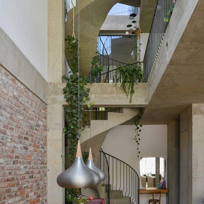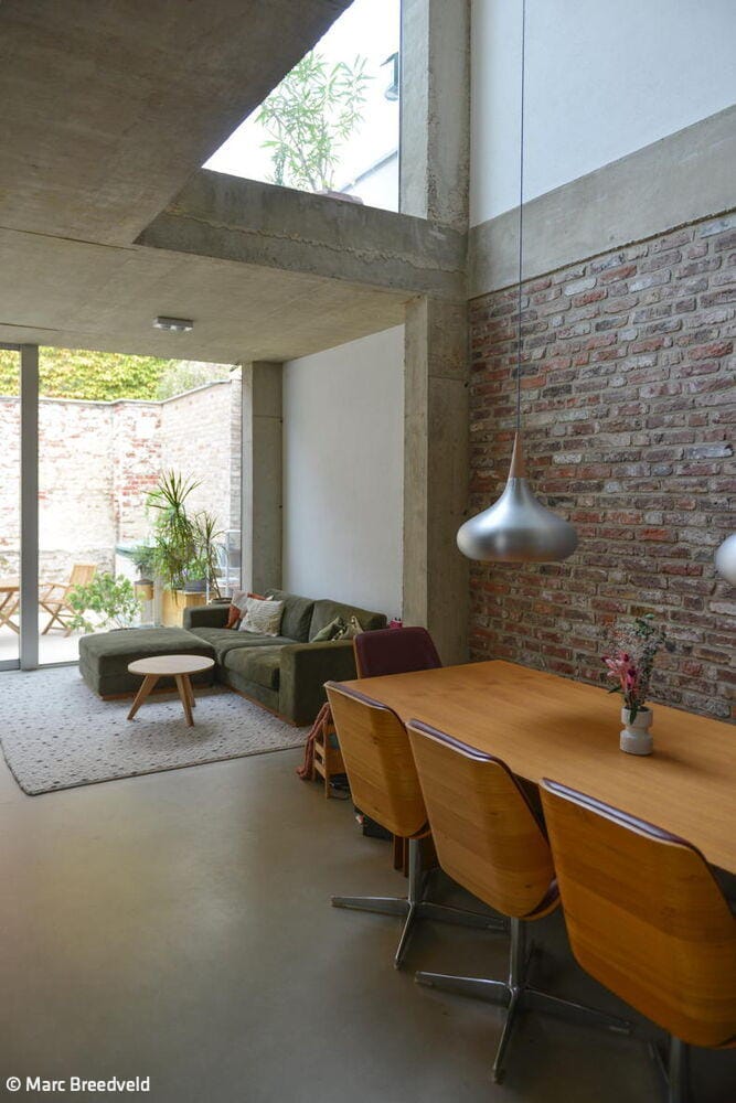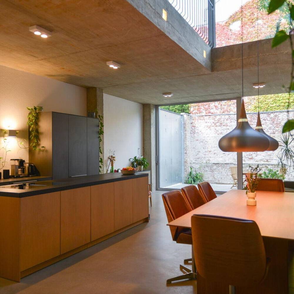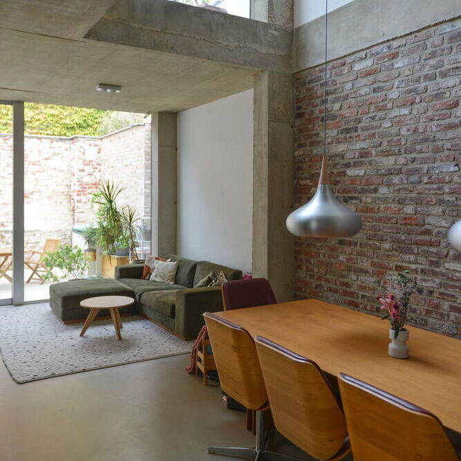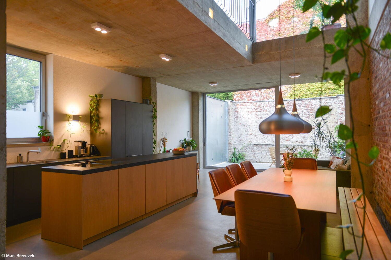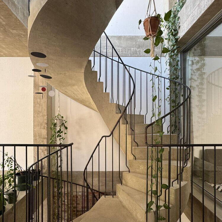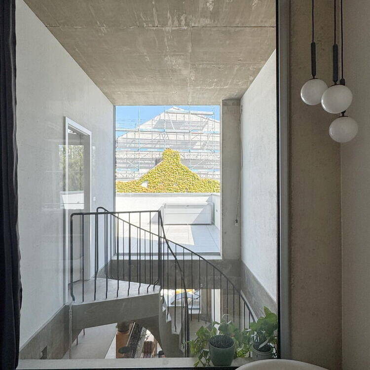 Ausgangspunkt war ein Anbau aus dem frühen 20. Jahrhundert, der an ein Wohn- und Geschäftshaus an der Venloer Straße grenzte: Ursprünglich sollte er saniert werden, doch die marode Bausubstanz – durchhängende Holzbalkendecken, poröse Ziegel und statische Defizite – ließ eine wirtschaftliche Lösung nicht mehr zu. Der Anbau wurde daher überwiegend neu errichtet: Es entstand eine Wohneinheit über drei Etagen, während ein bereits vorhandenes Ladenlokal erweitert wurde. Die Silhouette des Anbaus entspricht – wie von der Bauaufsicht gefordert – der ursprünglichen, dreifach abgestuften Form des Bestands. Im Inneren verfolgt das Stadthaus die Idee eines urbanen Rückzugsortes: Ein großzügiges Raumgefüge öffnet sich über drei Ebenen, die durch eine freitragende elliptische Treppe aus Ortbeton miteinander verbunden sind. Filigrane Rundstahlgeländer kontrastieren in ihrer handwerklich präzisen Form mit der orthogonalen Tragstruktur aus rauem Ortbeton. Der fließende Übergang des Wohnraums im Erdgeschoss in den Außenraum des Hofes setzt sich im Inneren fort: So sind Schlaf- und Kinderzimmer ebenfalls durch raumhohe Verglasungen vom Wohnraum getrennt. Dadurch entstehen verschiedenste Blickbezüge und vielfältige Möglichkeiten zur ebenen- und raumübergreifenden Interaktion der fünfköpfigen Familie. Durch Vorhänge lassen sich Schlaf- und Kinderzimmer jederzeit separieren, um Rückzugsorte und Privatsphäre zu ermöglichen. Jede Etage verfügt zudem über einen eigenen kleinen Außenraum: Großformatige Hebe-/Schiebetüranlagen ermöglichen fließende Übergänge auf die Terrassen, ohne Gefahr der Überhitzung aufgrund der Nordostausrichtung.