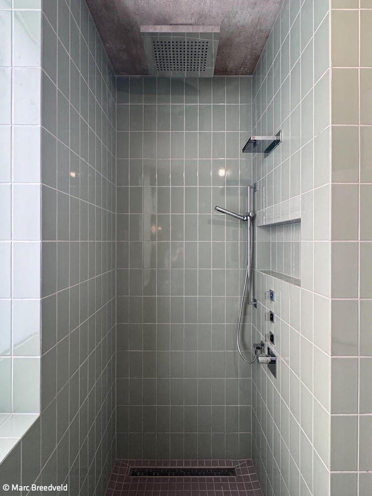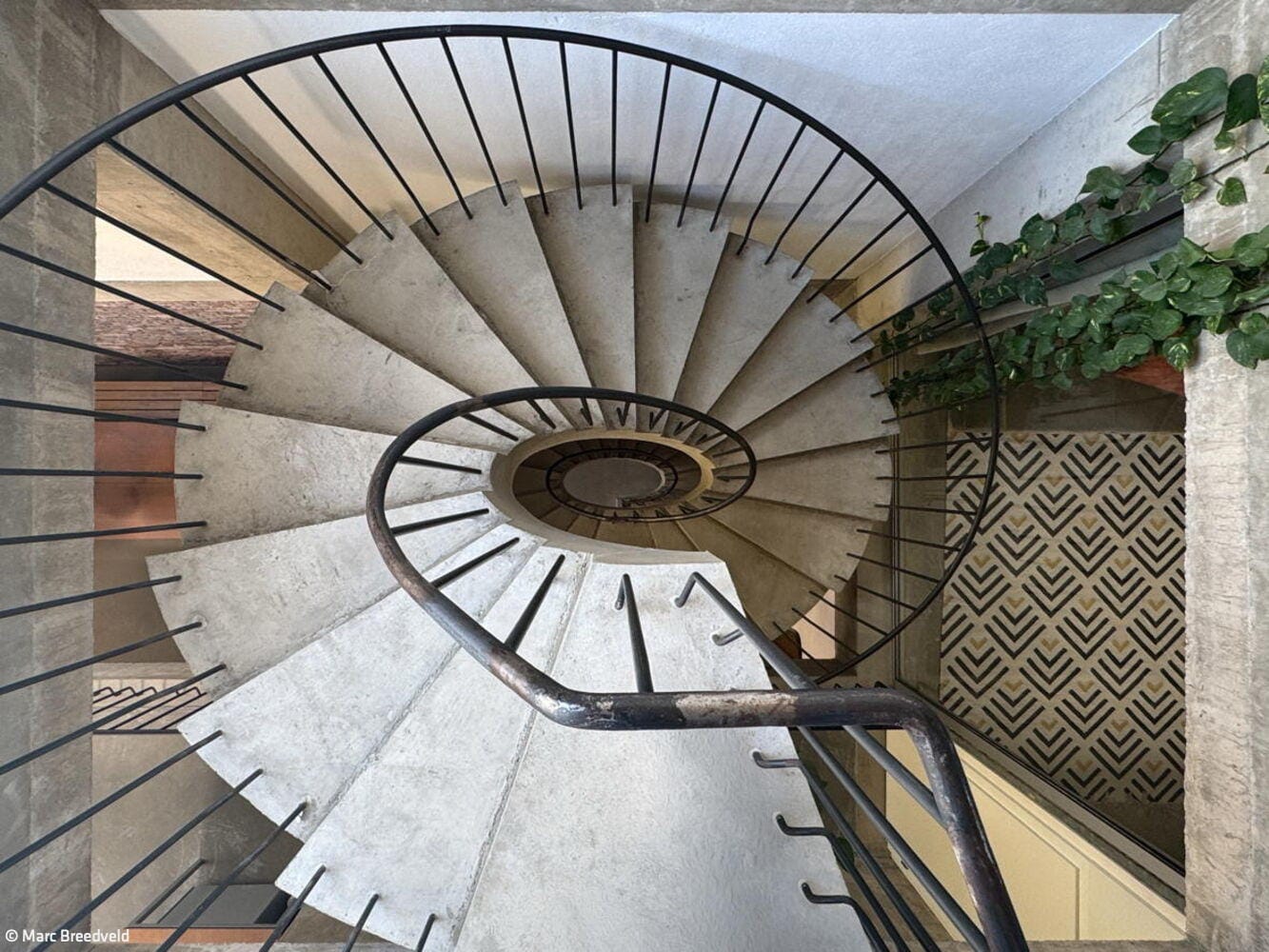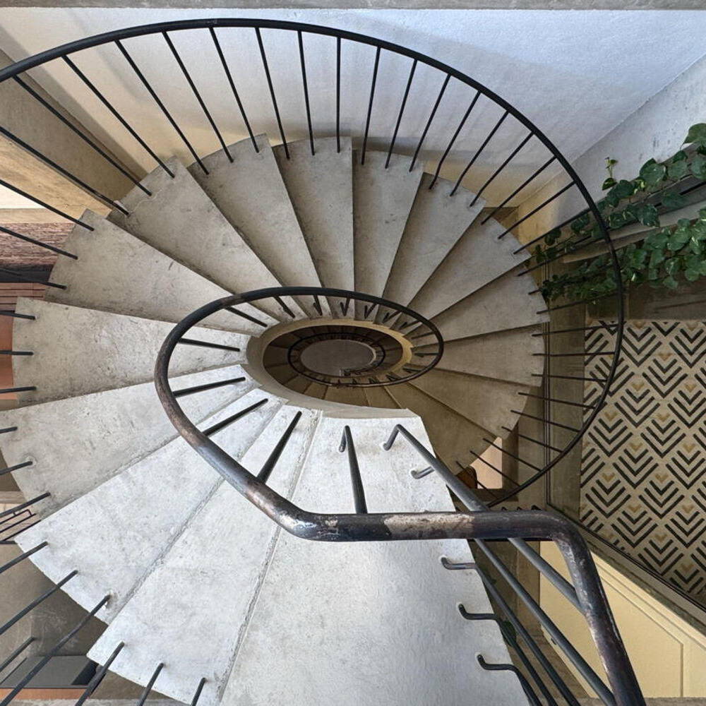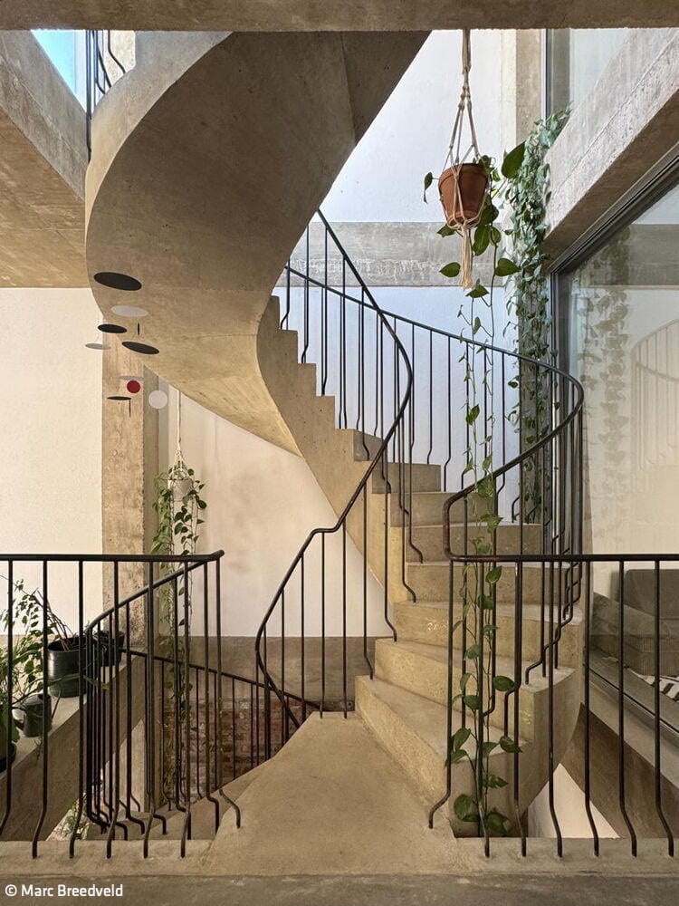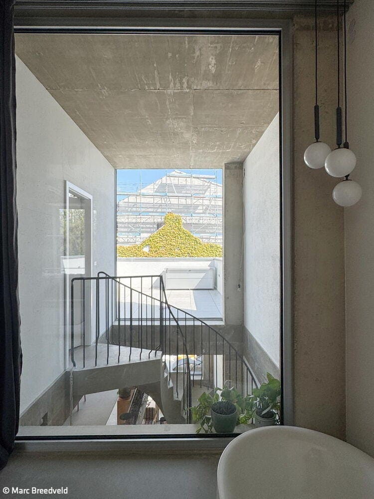Ausgangspunkt war ein Anbau aus dem frühen 20. Jahrhundert, der an ein Wohn- und Geschäftshaus an der Venloer Straße grenzte: Ursprünglich sollte er saniert werden, doch die marode Bausubstanz – durchhängende Holzbalkendecken, poröse Ziegel und statische Defizite – ließ eine wirtschaftliche Lösung nicht mehr zu. Der Anbau wurde daher überwiegend neu errichtet: Es entstand eine Wohneinheit über drei Etagen, während ein bereits vorhandenes Ladenlokal erweitert wurde. Die Silhouette des Anbaus entspricht – wie von der Bauaufsicht gefordert – der ursprünglichen, dreifach abgestuften Form des Bestands. Im Inneren verfolgt das Stadthaus die Idee eines urbanen Rückzugsortes: Ein großzügiges Raumgefüge öffnet sich über drei Ebenen, die durch eine freitragende elliptische Treppe aus Ortbeton miteinander verbunden sind. Filigrane Rundstahlgeländer kontrastieren in ihrer handwerklich präzisen Form mit der orthogonalen Tragstruktur aus rauem Ortbeton. Der fließende Übergang des Wohnraums im Erdgeschoss in den Außenraum des Hofes setzt sich im Inneren fort: So sind Schlaf- und Kinderzimmer ebenfalls durch raumhohe Verglasungen vom Wohnraum getrennt. Dadurch entstehen verschiedenste Blickbezüge und vielfältige Möglichkeiten zur ebenen- und raumübergreifenden Interaktion der fünfköpfigen Familie. Durch Vorhänge lassen sich Schlaf- und Kinderzimmer jederzeit separieren, um Rückzugsorte und Privatsphäre zu ermöglichen. Jede Etage verfügt zudem über einen eigenen kleinen Außenraum: Großformatige Hebe-/Schiebetüranlagen ermöglichen fließende Übergänge auf die Terrassen, ohne Gefahr der Überhitzung aufgrund der Nordostausrichtung.