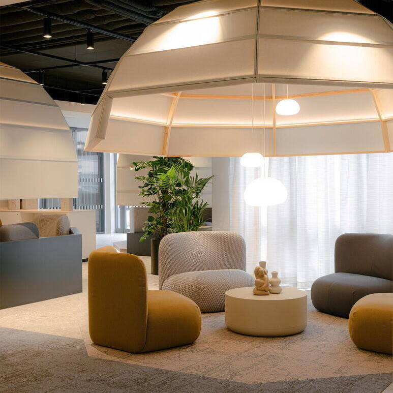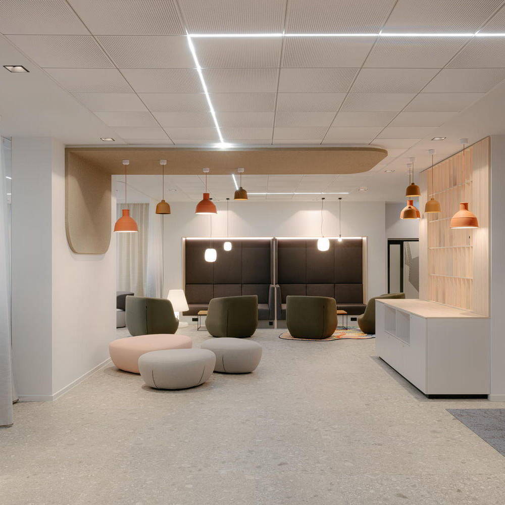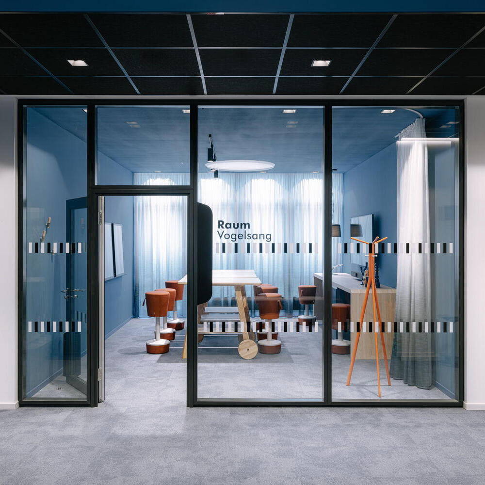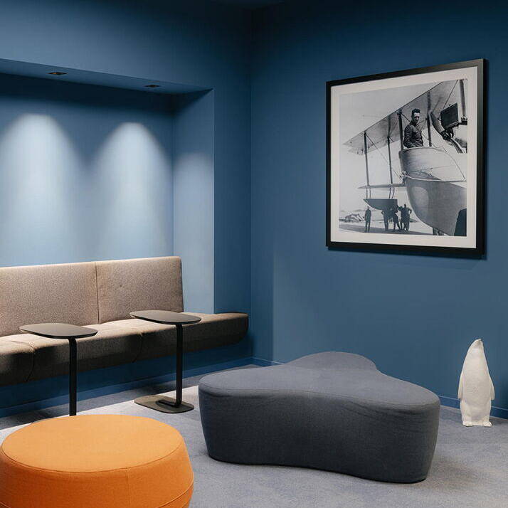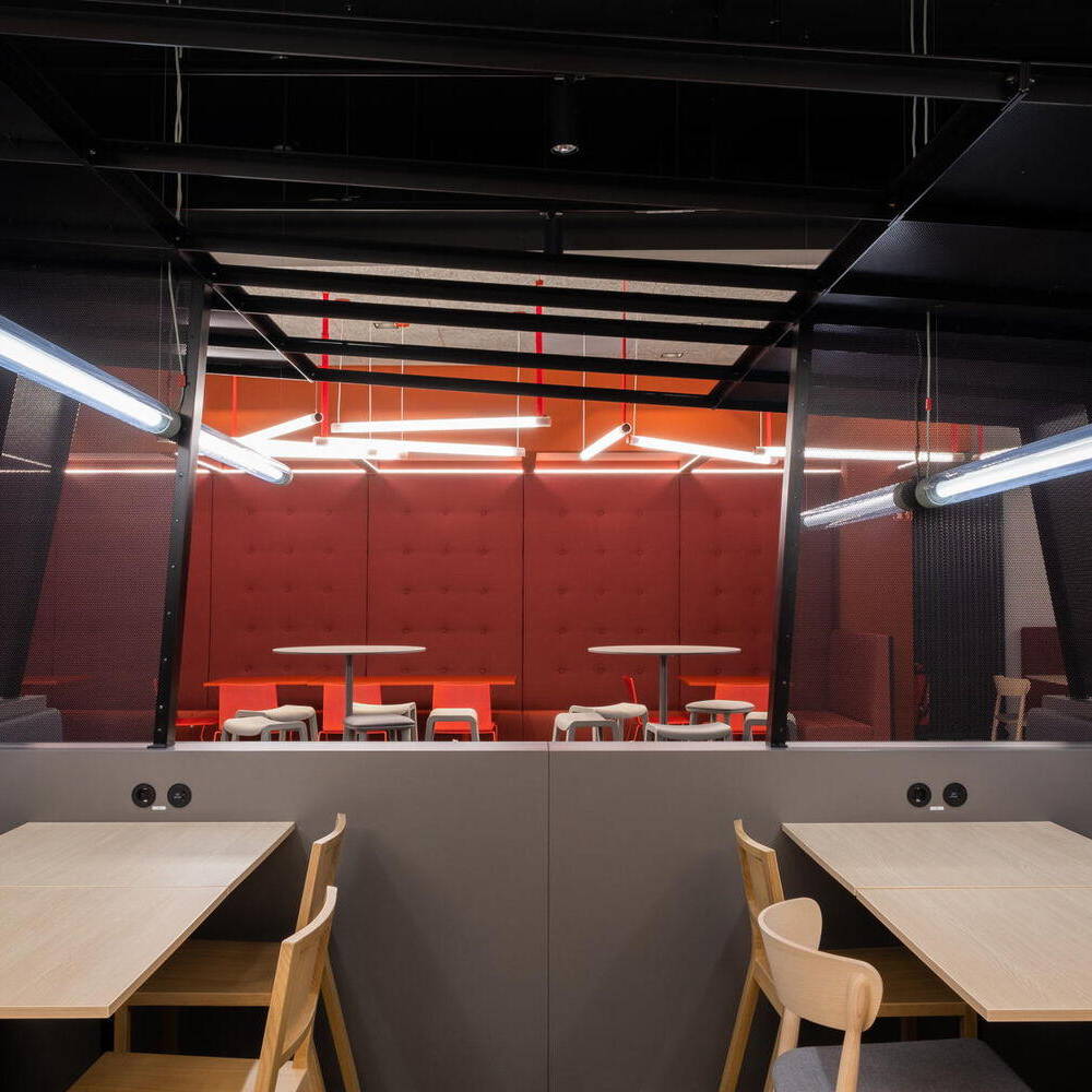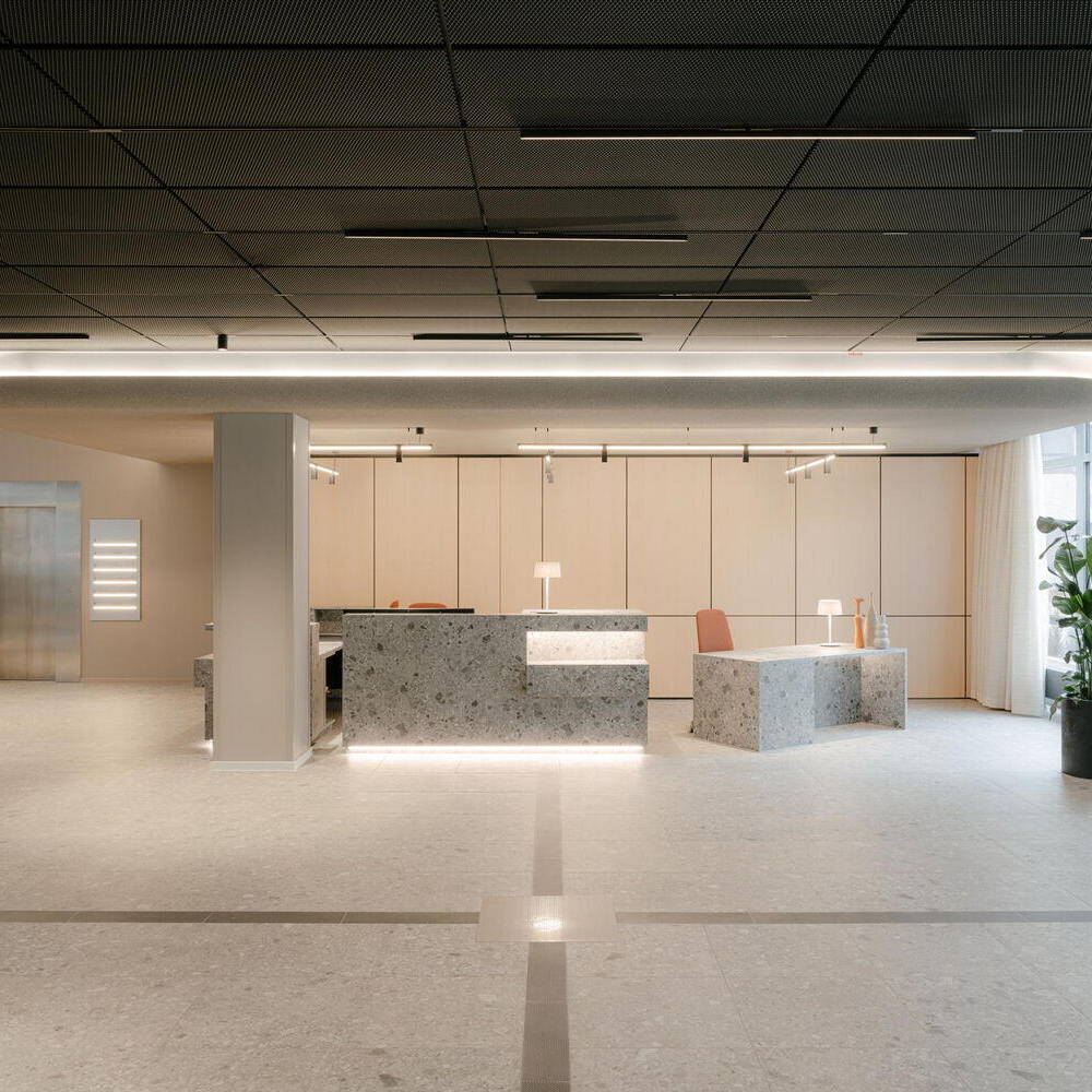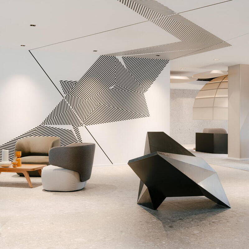 „Zu Projektbeginn mussten wir uns der Frage stellen, wie wir Bestand- und Neubau verbinden, sowie die Wegeführung neu definieren“, erläutert die Architektin Viki Kitzig, Geschäftsführerin Kitzig Interior Design, die besondere Herausforderung des Projektes. Zum Innenhof und dem Neubau des Parkhauses konnte zunächst eine großzügige Öffnung der Fassade geschaffen werden, die die Erschließung von der Straße aus sinnvoll ergänzt. Der anschließende Umbau wurde in vier Abschnitten vollzogen, um die Mieter während des Umbaus so wenig wie möglich in ihren Wegen in und aus dem Gebäude einzuschränken. Im ersten Abschnitt wurde die Gastronomie neugestaltet, um wieder eine kulinarische Versorgung des Campus und seiner Umgebung zu ermöglichen. Das Campus-Restaurant präsentiert sich in einem modernen Design und setzt auf ein Speisenangebot, das frisch in der neu gestalteten Küche zubereitet wird. Neben der Lounge, die auch über die Servicezeiten der Gastronomie hinausgehend für informellen Austausch und zum Chillen genutzt werden kann, laden die zahlreichen Grünflächen im Innenhof zum Entspannen und Wohlfühlen ein. Die zentrale Lobby folgt einem offenen Konzept, ist sowohl repräsentativer Empfangsbereich als auch Ort für agiles Arbeiten und geselliges Beisammensein. Eine Teilfläche kann durch Vorhänge abgetrennt und mit kleiner Bühne als Veranstaltungsbereich genutzt werden. Neben sogenannten „Iglus“, die Rückzugsmöglichkeiten für spontane Gespräche bieten, können auch verschiedene Meetingräume von den Mietern über eine App flexibel gebucht werden. Die Board- und Konferenzräume sind mit Videokonferenztechnik für Hybridveranstaltungen und Konferenzen ausgestattet. Es gibt aber auch einen Kreativraum, klassische Vortrags- und Schulungsräume sowie helle und intime Meetingbereiche, die alle über vielfältige Pre-Function-Bereiche miteinander verbunden werden. Von Beginn an stellten der Eigentümer und das Projektteam einen sehr hohen Anspruch an die Qualität der Materialien und Gestaltung in den Vordergrund. Zudem waren als Künstler Tape-Art, Johannes Leidenberger und Kunst Raum Konzepte in den Gestaltungsprozess einbezogen. Ihre Kunstobjekte gehen einen direkten Dialog mit dem Interior ein.