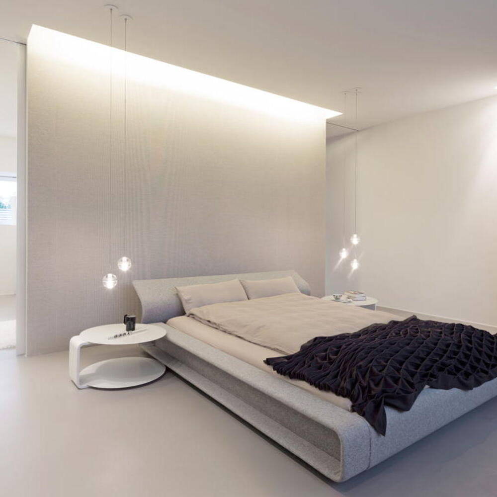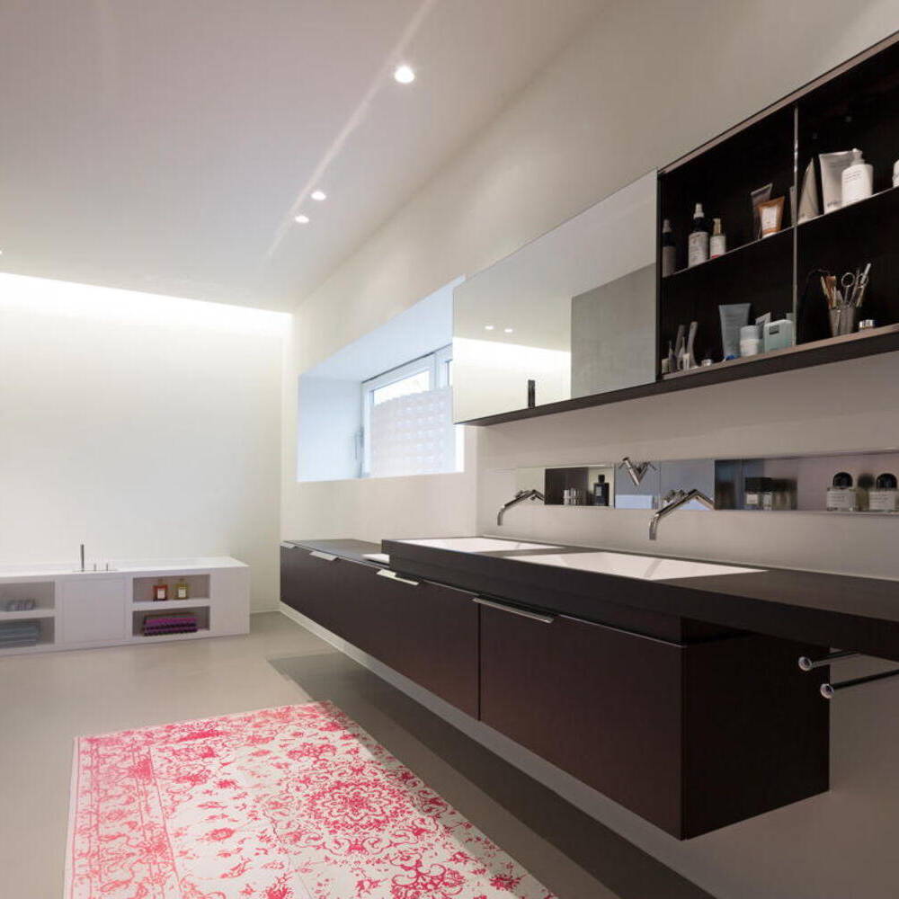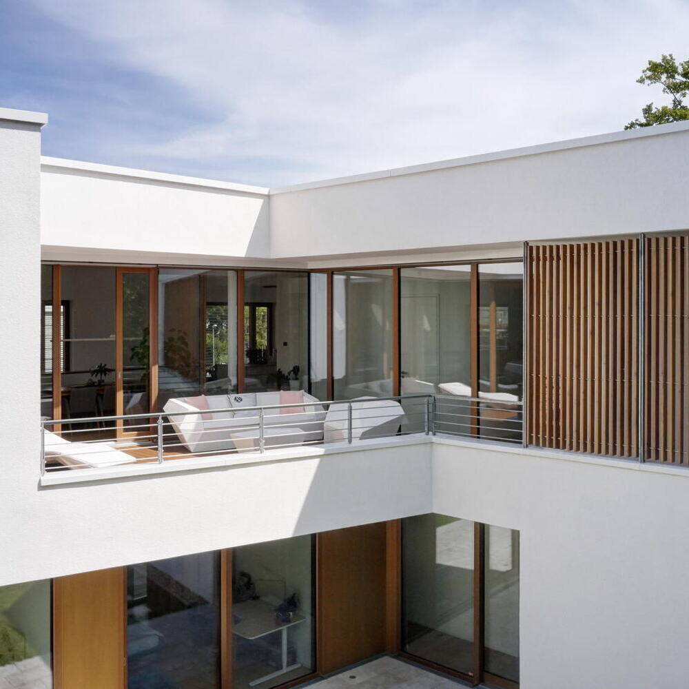 Bereits von der Straße aus wird die Besonderheit des Entwurfs spürbar. Die Front zeigt sich in reduzierter Geste und erinnert an einen Bungalow. Doch dahinter entfaltet sich das Haus in die Tiefe: Über eine großzügige Treppenanlage werden die einzelnen Ebenen erschlossen, wodurch spannende Raumbezüge entstehen. Ein Spiel mit Höhenversprüngen und Lichteinfällen erzeugt eine abwechslungsreiche Atmosphäre. Das Gebäude ruht in sich – sowohl gestalterisch als auch konstruktiv. Die Massivbauweise vermittelt eine gute Erdung, insbesondere in der Hanglage. Die Materialien spiegeln das rationale Gestaltungskonzept des Hauses: Naturstein, Eichendielen, weißer Putz und dazu viel Licht durch die großen Öffnungen. Das Element aus vertikalen Holzleisten zur Verschattung der Pergola im 1. Obergeschoss bildet ein stimmiges Pendant zu den Holzrahmen der raumhohen Fenster in beiden Geschossen und zum Eingangsbereich mit der Garage. Im Innenwinkel des L-förmigen Grundrisses bildet sich ein geschützter Freibereich mit Blick in das üppige Grün. Großzügige Sanitärbereiche, maßgefertigte Einbauschränke und klug genutzte Speicherflächen sorgen für eine effiziente Raumnutzung, die den Alltag erleichtert. Downlights und indirekte Beleuchtung reflektieren die weißen Wandflächen zugunsten der Helligkeit in den Räumen.