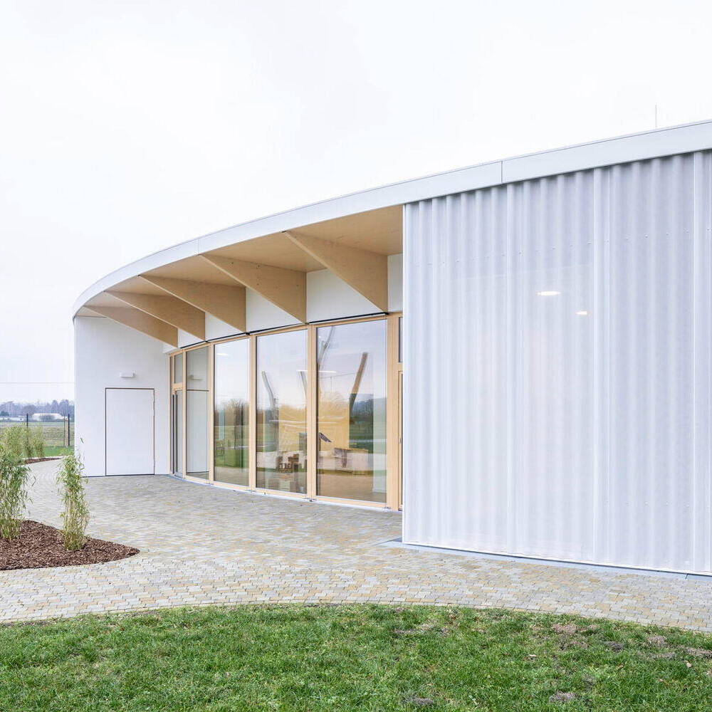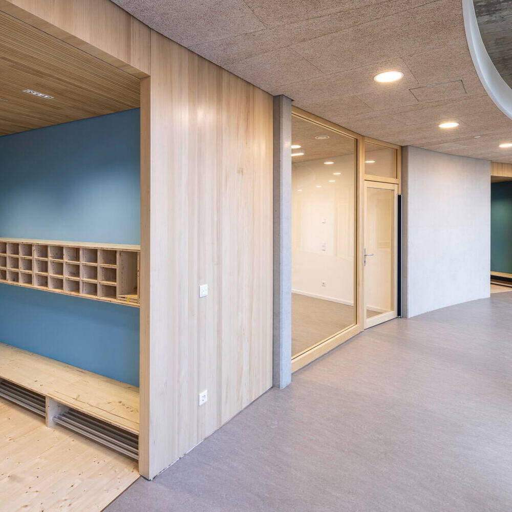 In Gießen entstand eine vierzügige Kita mit angeschlossenem Familienzentrum, bei der die Integration mit der Form beginnt. So unterstützt sie die pädagogische Mission nicht nur, sondern übersetzt sie in Raum. Die Stadt Gießen hatte sich als Bauherrin vom Frankfurter Architekturbüro dirschl.federle_architekten nämlich kein konventionelles Kita-Gebäude gewünscht, sondern einen Ort, der Eltern, Kinder und Fachpersonal gleichermaßen einlädt, einbezieht und inspiriert. Die Architekt:innen antworteten mit einem runden Baukörper, der um einen offenen Hof organisiert ist. Alle Nutzungen – ob Gruppenraum, Mehrzweckfläche oder Elterntreff – ordnen sich hierarchiefrei um diesen Innenhof, während ein umlaufender Flur die Bereiche verbindet. Die klare, ringförmige Struktur schafft Übersichtlichkeit und erleichtert die Orientierung. Gleichzeitig fördert sie Begegnung und Kommunikation unter Kindern, Eltern und Pädagog:innen.