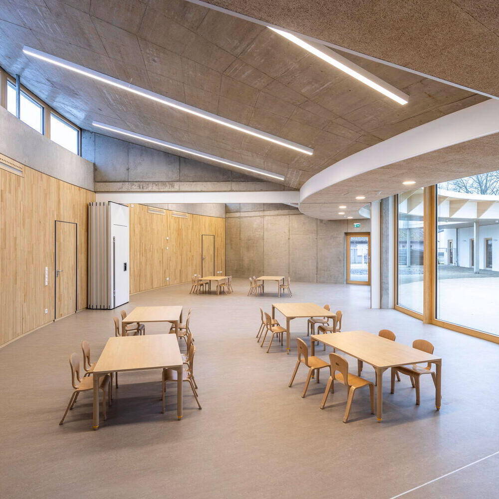 Natürliches Licht spielt bei dem auch energetisch nachhaltigen Gebäude eine zentrale Rolle: Bodentiefe Verglasungen sorgen für maximale Tageslichtnutzung – sowohl von der Gartenseite als auch vom Hof aus. In Schlafräumen übernehmen gelochte Metallpaneele die Rolle des feststehenden Sonnenschutzes, in innenliegenden Kinder-WCs sorgen Skylights für natürliche Belichtung. Der Speise- und Mehrzweckraum hebt sich mit seinem aufgefalteten Dach und Oberlichtband deutlich von den übrigen Räumen ab – und betont sowohl architektonisch als auch atmosphärisch die besondere Funktion.