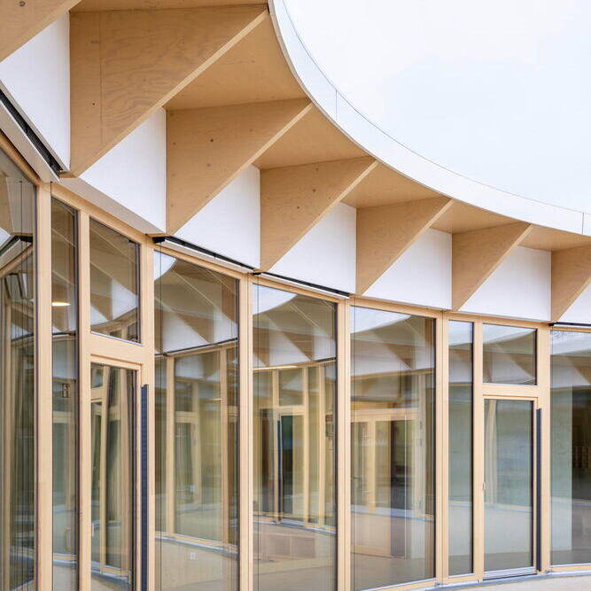 Der Innenhof ist das lebendige Zentrum des Gebäudes. Er dient nicht nur als Spiel- und Aufenthaltsfläche, sondern auch als sozialer Raum: wandelbar, lebendig, einladend. Hier finden Sommerfeste, Flohmärkte oder Weihnachtsaktionen statt – aber auch der spontane Austausch auf einer Bank im Schatten. Drei große Schirme schützen vor Sonne und Regen und verwandeln die Mitte so in einen Ort, der zum Verweilen einlädt. Jeder Funktion ist außerdem ein eigener Garten zugeordnet. Im Gegensatz zum zentralen Hof sind diese Außenräume spezifisch gestaltet – als Spiel-, Ruhe- oder Aktionszonen. Sie schaffen Rückzugsräume, fördern Bewegung und geben jeder Nutzung eine eigene Ausdrucksform im Grünen. Die Übergänge zwischen Innen und Außen sind dabei fließend umgesetzt, mit überdachten Terrassen und großzügigen Glasflächen. Auch konstruktiv zeigt sich der Entwurf flexibel und zukunftsorientiert. Die tragende Struktur besteht aus Stahlbeton, Fassaden und Innenausbau erfolgten in Holz- und Trockenbauweise. Das ermöglicht langfristige Umnutzungen und Anpassungen. Die äußere Hülle – eine Mischung aus Ganzglasfassaden, semitransparenten und geschlossenen Fassaden – unterstützt die dahinterliegenden unterschiedlichen Nutzungen, bei denen sich introvertierte und offene Räume abwechseln.