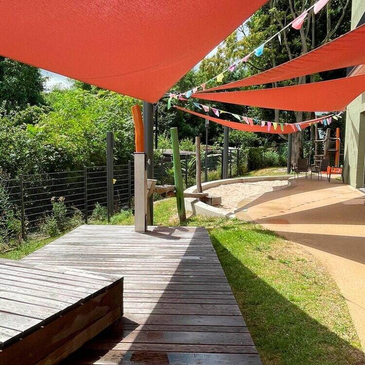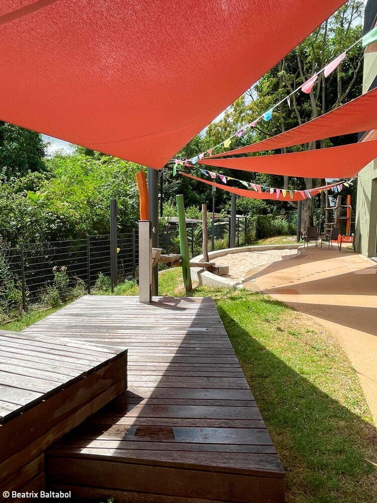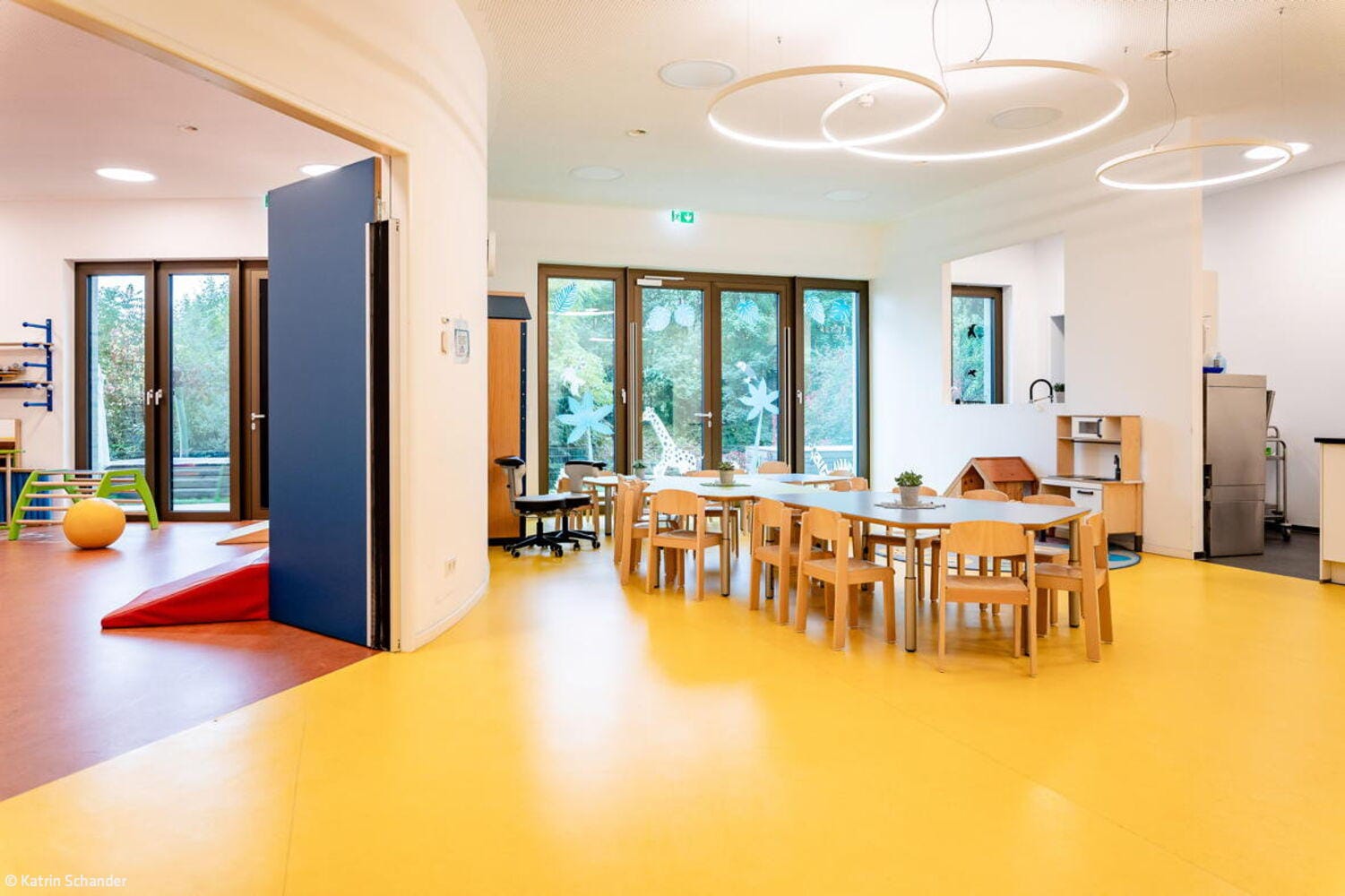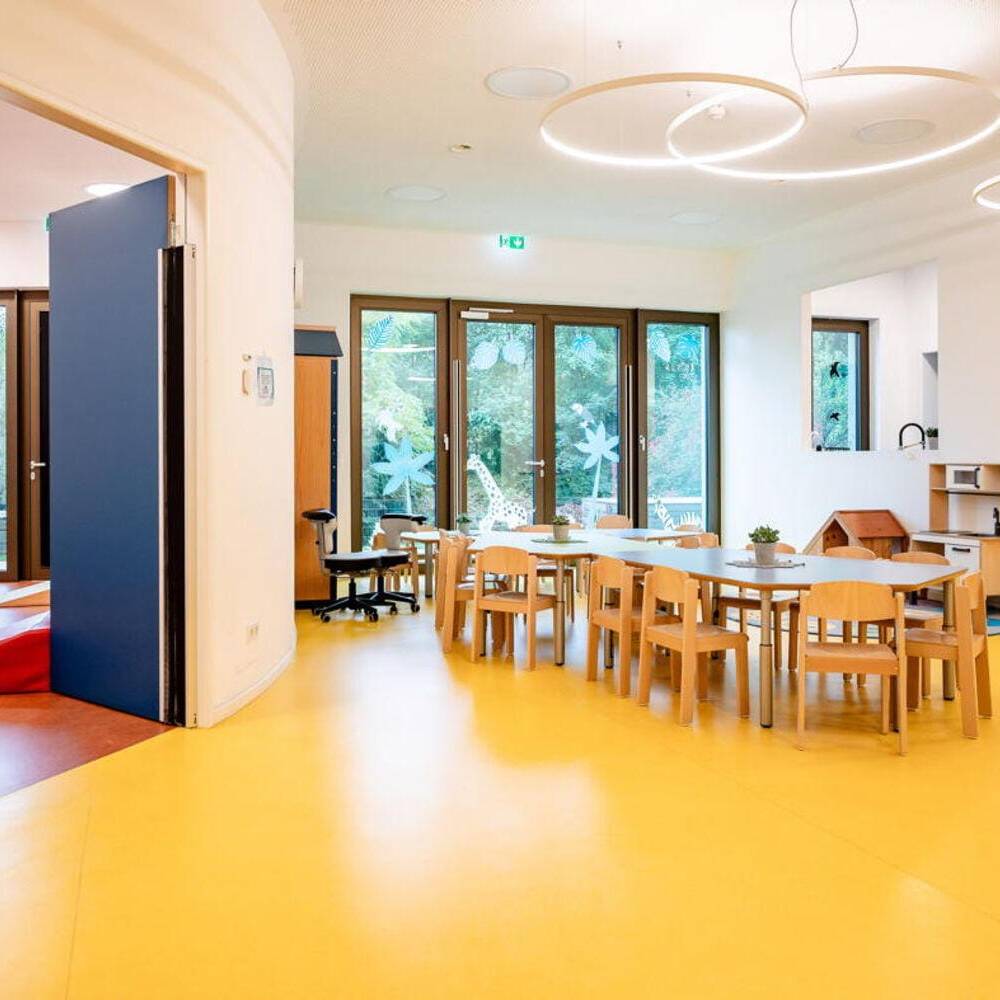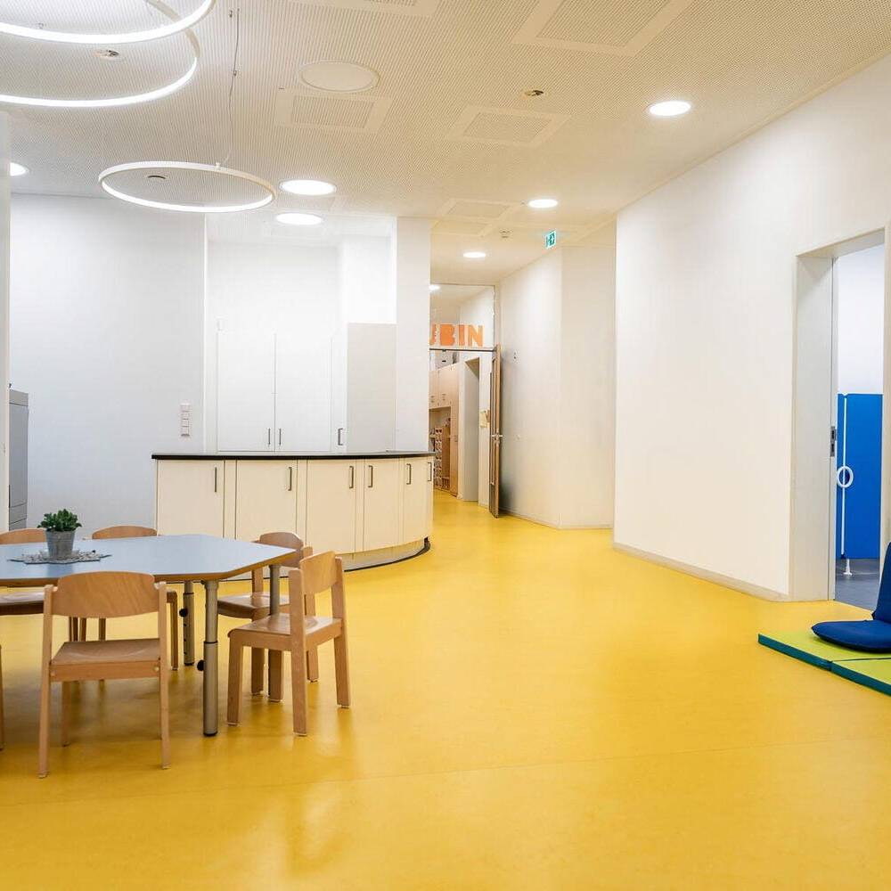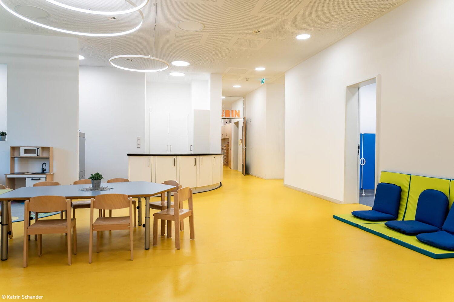 Im Erdgeschoss öffnet sich das Haus zur Nachbarschaft: Die Kindertagesstätte verbindet sich mit den bestehenden Kita-Räumen zu einer umlaufenden Erschließung. Ein offener Bistro- und Mehrzweckbereich schafft eine lebendige Mitte, in der Kinder spielen, lernen und sich begegnen. Große Fensterflächen lassen den Außenraum Teil des Alltags werden – im Sommer verschmelzen Spiel und Bewegung drinnen wie draußen.