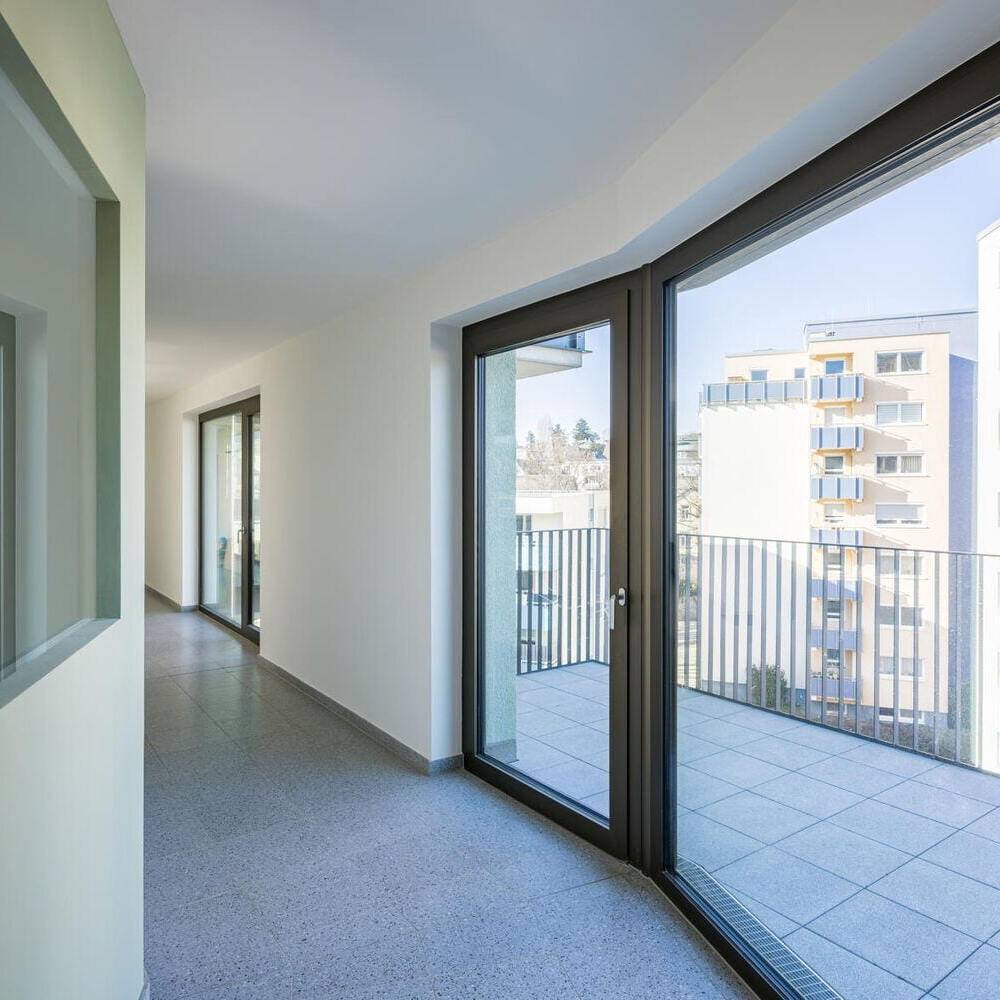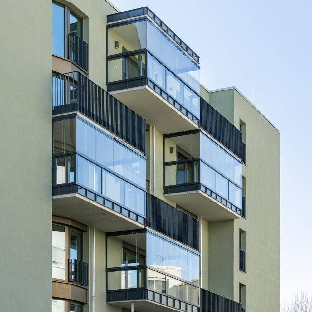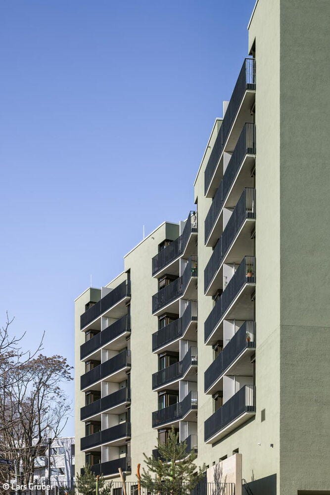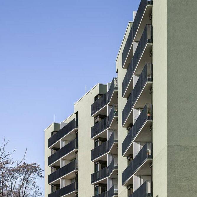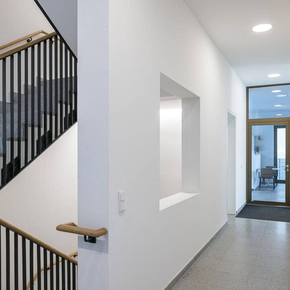 Der Neubau ersetzt ein Wohnheim aus den 1960er-Jahren und schließt zugleich an einen 2018 errichteten Kita-Anbau an. Der Übergang von Alt zu Neu ist dabei nicht nur baulich, sondern auch programmatisch gedacht: Das neue Haus fügt sich als Baustein in das soziale Gefüge des Hufeland-Hauses ein, das Menschen in unterschiedlichen Lebensphasen begleitet. Nach außen zeigt sich das Gebäude ruhig und geordnet. Loggien zur Südseite öffnen die Wohnungen in die Sonne, während nach Norden verglaste Gemeinschaftsloggien den Blick in die Umgebung freigeben. Zwischen Innen und Außen entstehen Orte des Austauschs, die den Bewohner:innen eine Balance zwischen Rückzug und Gemeinschaft bieten.