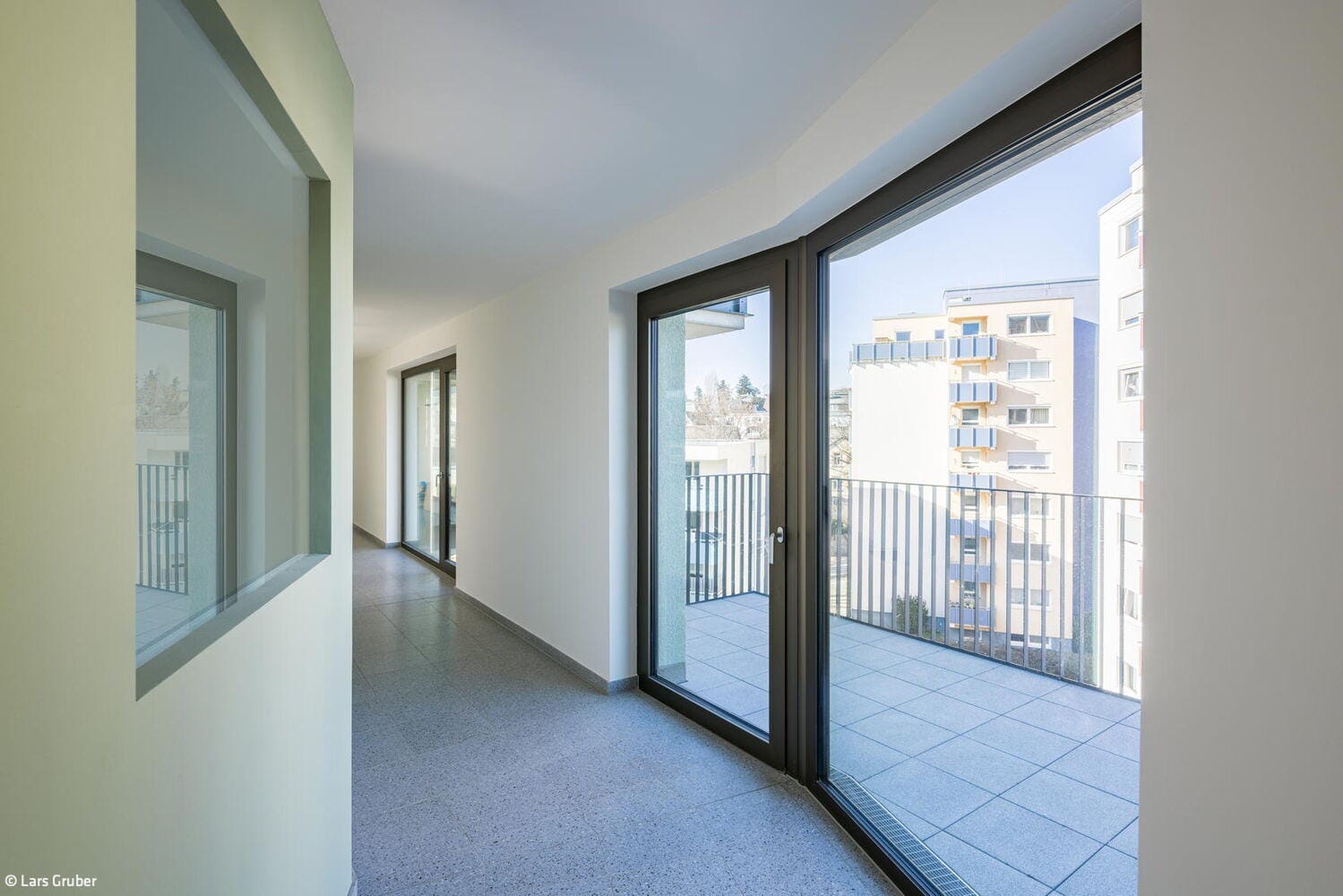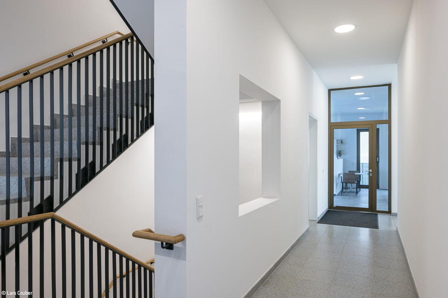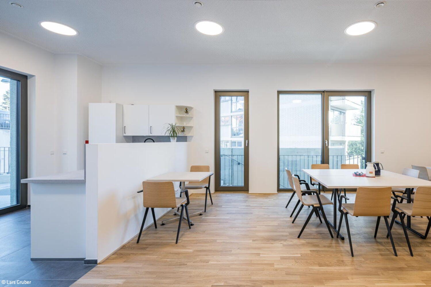 Die oberen Etagen sind dem Wohnen gewidmet. Hier dominieren Zweizimmerwohnungen mit einer Loggia und zurückhaltend gestalteten Grundrissen, die Selbstständigkeit und Sicherheit gleichermaßen ermöglichen. Alle Wohnungen sind barrierefrei und seniorengerecht ausgeführt. Ein Gemeinschaftsraum im Erdgeschoss, der die Idee des Zusammenlebens stärkt, ergänzt das Angebot. Besondere Sorgfalt galt auch der Gestaltung der Außenräume, da die Außenanlagen sowohl funktional als auch atmosphärisch Teil des Gesamtkonzepts sind und Lebensqualität und Teilhabe fördern sollen. Die Grünflächen und Wege sind barrierefrei gestaltet und bieten den Bewohner:innen Sitzgelegenheiten. Der nördliche Eingangsbereich ermöglicht Raum für Begegnung und Bewegung, für Fahrräder, Kinderwagen und Gespräche. Im Süden und Westen entfalten sich die Spielflächen der Kita.
