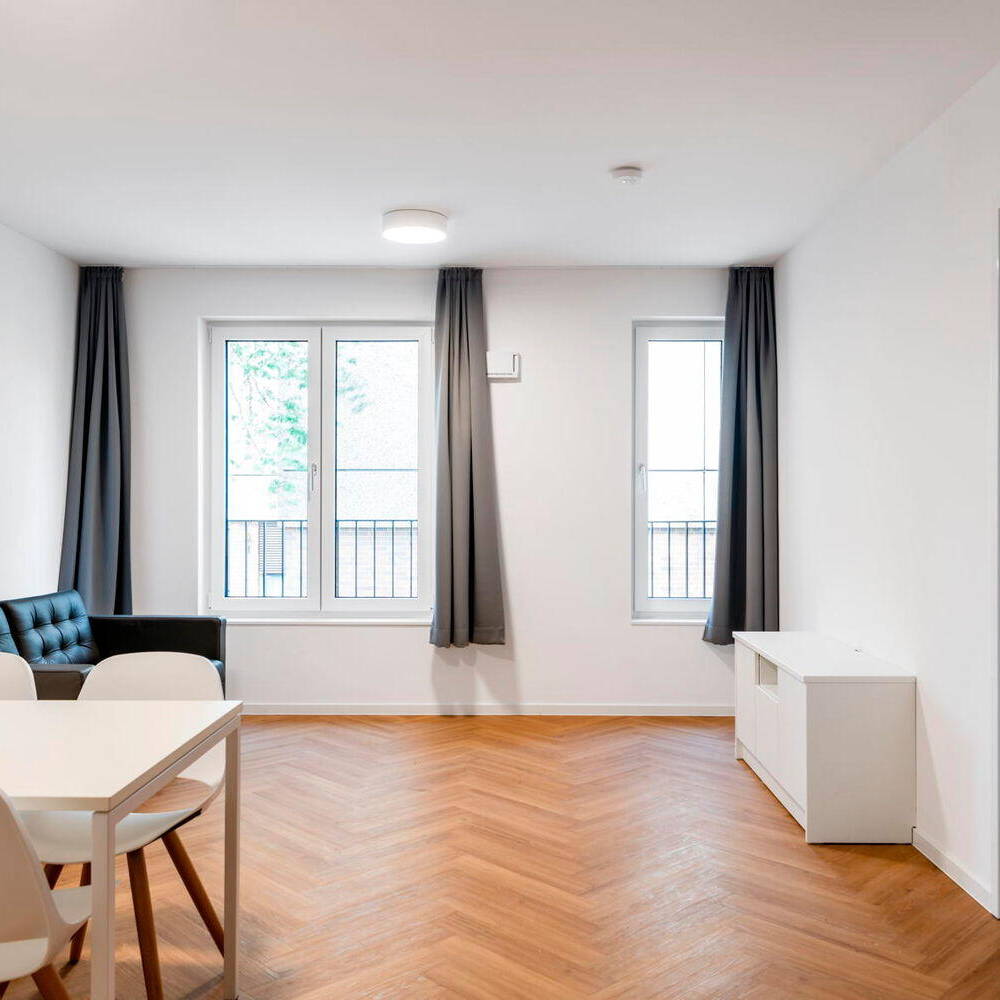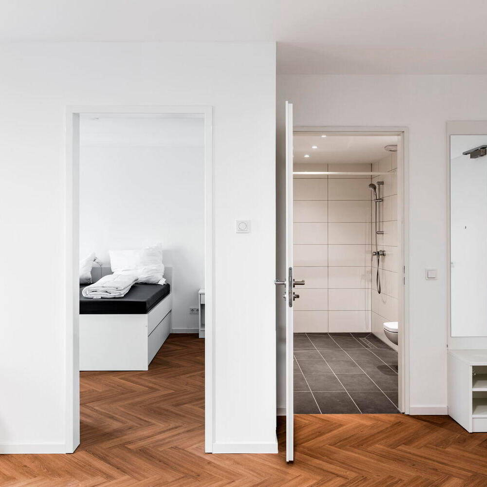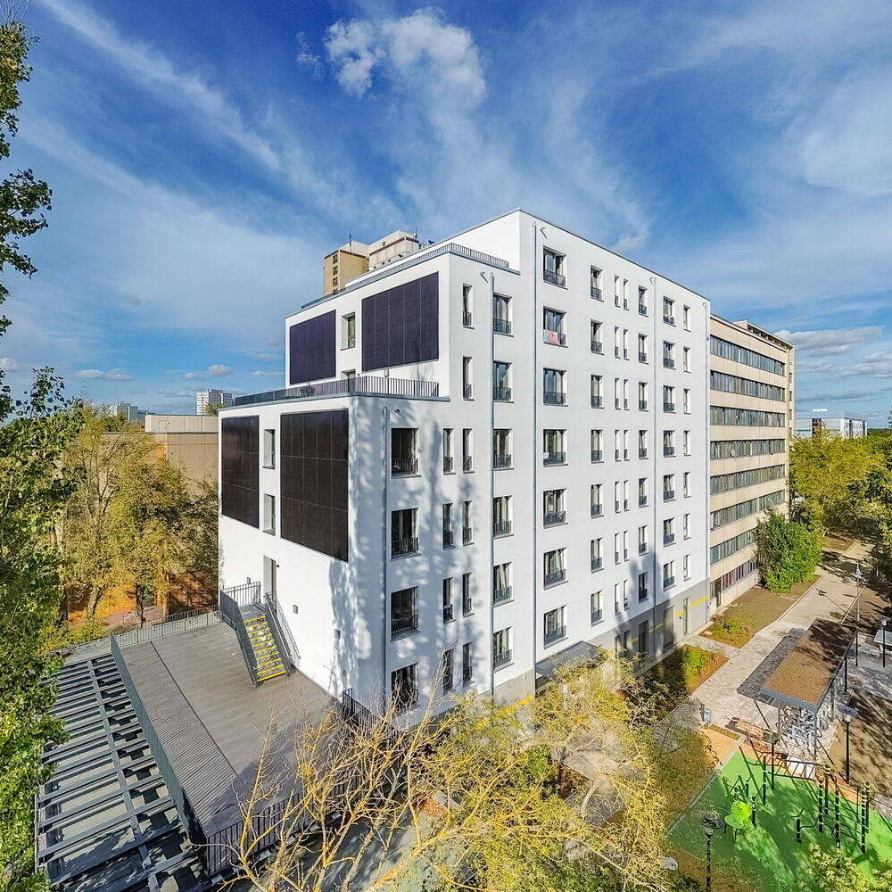 Der Innenausbau ist einfach und kostensparend ausgeführt, um günstige Mieten zu ermöglichen. Für eine optimale Energieversorgung per vertikaler Photovoltaik- und einer solarthermischen Anlage auf dem Dach wurde die Effizienzhausstufe 40 erreicht. Das Wohngebäude passt sich zwischen zwei Bestandsbauten ein, wobei der nordöstliche Nachbar direkt an der Straße liegt und einen Eingang in zweiter Reihe erforderlich machte. Die vorhandene Bebauung der Umgebung, ein Wohnhochhaus, ein paar Geschäfte und Büros sowie eine Tankstelle, ist sehr heterogen, fügt sich jedoch durch den neuen Stadtbaustein zu einer Einheit zusammen. Die generelle Orientierung des Quartiers ist zu den S-Bahn-Gleisen hin ausgerichtet – sozusagen zu der Lebensader des Viertels. Südlich sind ganz in der Nähe die berühmten Sportstätten wie das Velodrom des französischen Architekten Dominique Perrault und die Schwimmhalle des Europasportparks verortet.