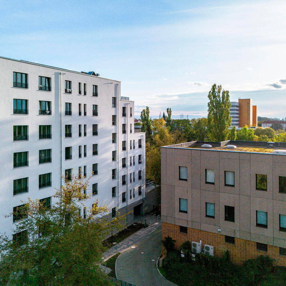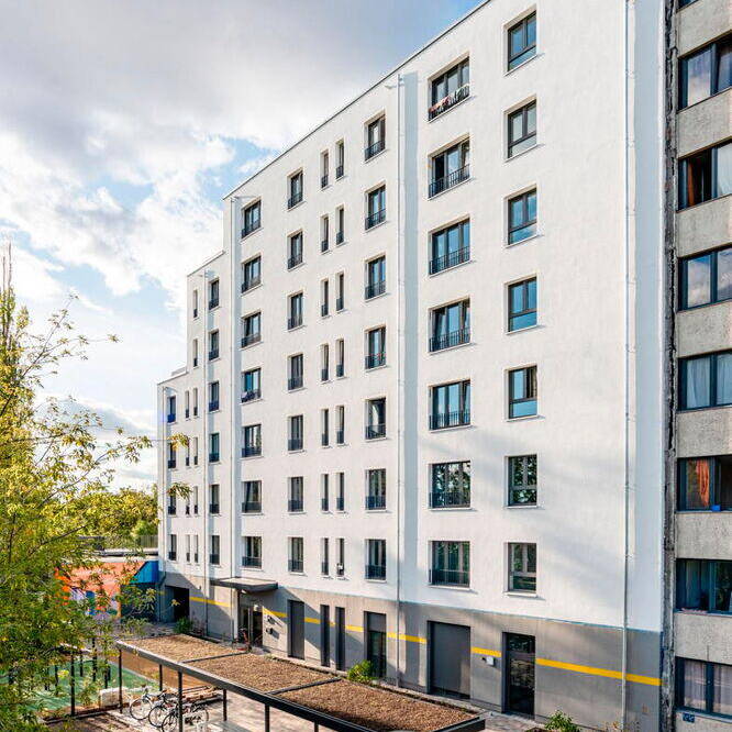 Die Idee der Architekten, hier Baugrund zu schaffen, wurde tatsächlich Realität. Als die landeseigene Berlinovo Immobiliengesellschaft beschloss, den neu entstandenen Grund zu bebauen, erteilte sie den Ideengebern verdientermaßen den Auftrag, die Planung für das dort vorgesehene Gebäude zu übernehmen. Heute steht hier ein siebengeschossiges Wohngebäude mit 76 Ein- bis Zweizimmerwohnungen. Der Auftrag an die Architekten lautete, möglichst viele Apartements auf der Grundfläche von 465 m² zu planen und dringend benötigte Pflegekräften der Charité unterzubringen. Im Herbst 2023 konnte es an seine neue Bewohner:innen übergeben werden. Die Kubatur des Siebengeschossers ist ungewöhnlich: Dieser verläuft im rechten Winkel zur Storkower Straße mit seiner Höhe von 22 Metern und treppt sich in drei Stufen zu den Gleisen der Ringbahn hin ab, sodass der Baukörper an ein Schiff mit gestaffelten Decks erinnert. Der Entwurf sah von vornherein großzügige Gemeinschafts-Dachterrassen für die Bewohner:innen vor. Das Haus ist in Massivbauweise mit weißer Putzfassade errichtet. Die Architekten generierten eine Gesamtwohnfläche von 1.944 m². Das Gebäude ist somit mit seinen über 70 Wohnungen extrem effizient. Nach dem Kriterienkatalog für Gebäude gilt es als Sonderbau der Gebäudeklasse 5, zu der Mitarbeiterwohnen zählt.