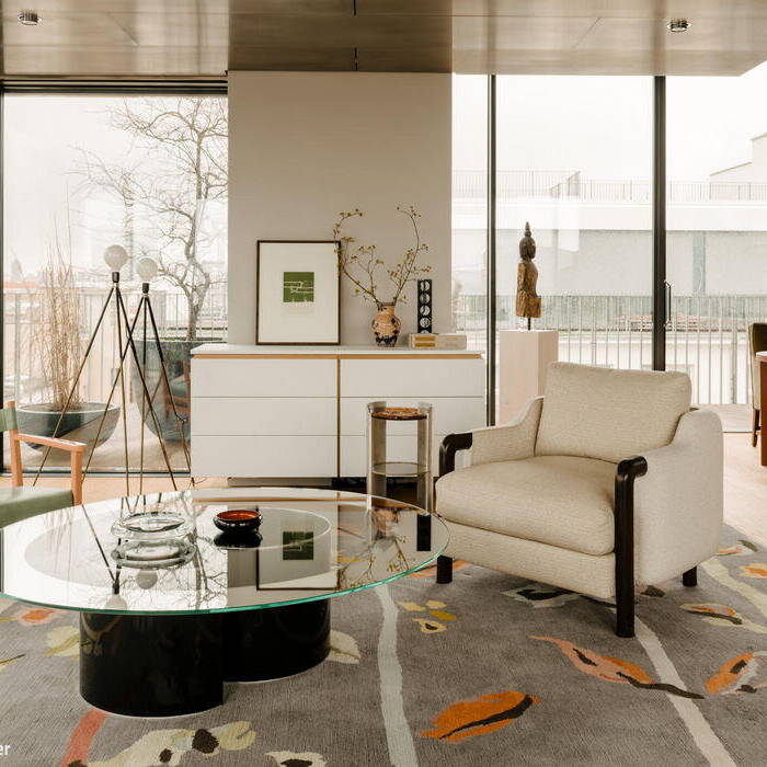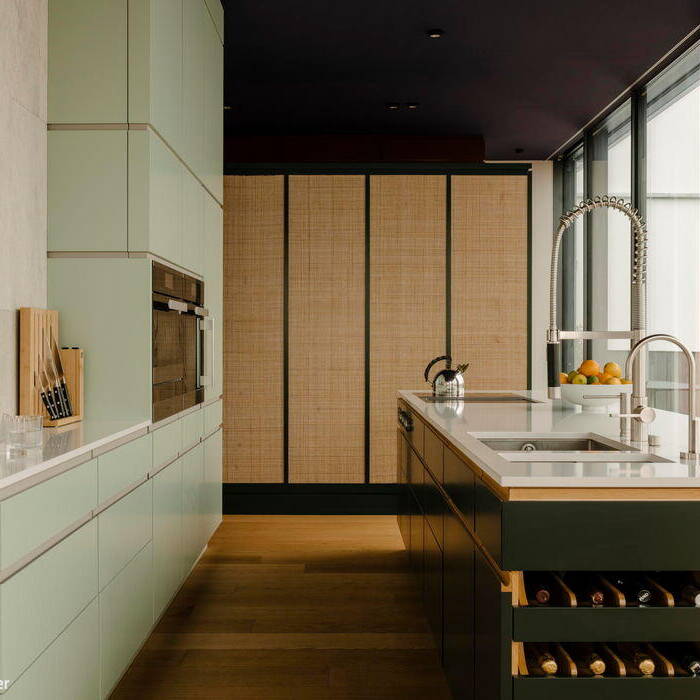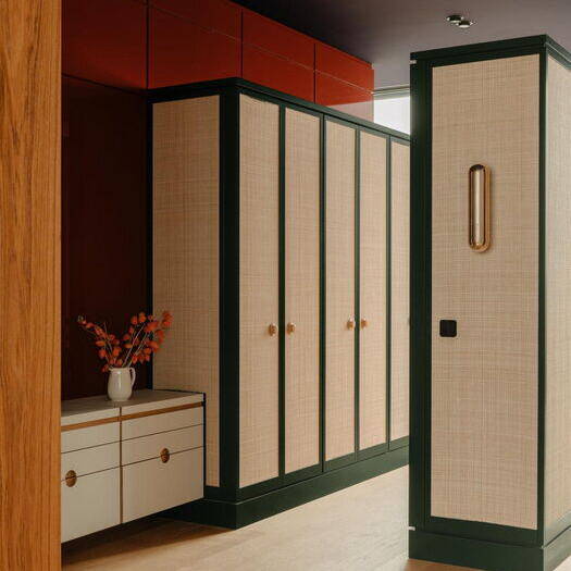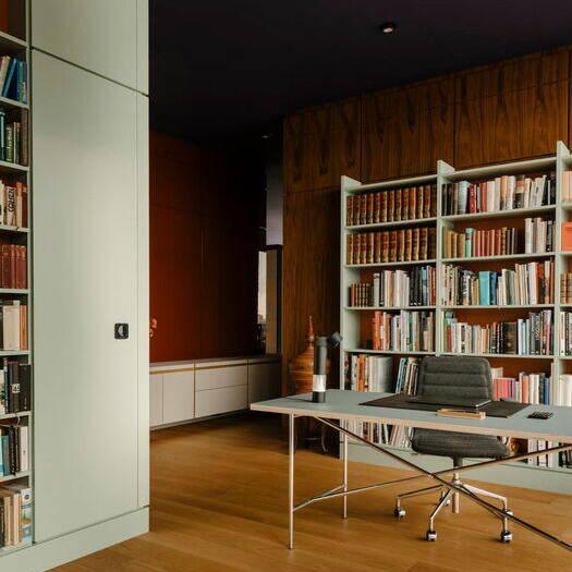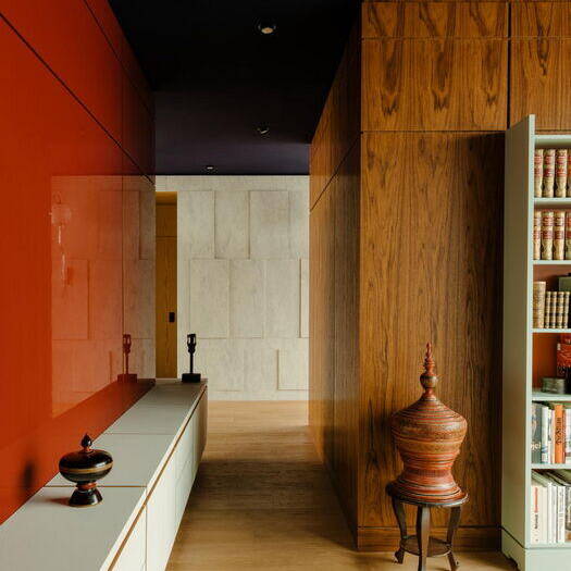 Die Entwurfsidee von Gisbert Pöppler, derzeit einer der angesagtesten Interiordesigner, war so einfach wie brillant: Den Grundriss so zu gestalten, dass ein Großteil der Fläche offen bleibt und drei scheinbar beliebig angeordnete „Boxen“ mit opaken Wänden hineingestellt werden. Das Ergebnis nach dem erfolgreichen Umbau: Eine großzügige Wohnfläche, die man gemäß des eigenen Geschmacks gestalten konnte. Hier oben, im 7. Obergeschoss, gibt es keine neugierigen Nachbar:innen – daher können die Wände bis auf die tragenden Teile aus Glas sein. So entstand ein dreiseitig verglaster Pavillon. Durch die Umgestaltung haben die zwei Schlafräume und ein Badezimmer etwas mehr Intimsphäre und Ruhe erhalten. Gisbert Pöppler nennt diesen Entwurf „The Village“: Eine Dorfstraße, an der kleine Häuser aber auch offene Gemeinschaftsflächen liegen. Ausserhalb des lichtdurchfluteten „Dorfes“ kommen noch zwei Terrassen hinzu. Pöppler und sein Team entwickelen das Konzept in enger Abstimmung mit dem Auftraggeber. Erst als eine Vertrauensbasis bestand, waren der Kreativität Tür und Tor geöffnet. So einigte man sich sukzessiv auf verschiedene Materialien mit unterschiedlichen Texturen und Farben. Ein dunkelrot getäfelter Eingang, ein weißes Kalksteinrelief als Überleitung zum Wohnbereich, massives Eichenholzparkett und eine dunkel-auberginefarbene Decke geben der Wohnung ein behagliches Raumgefühl.