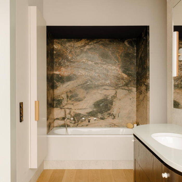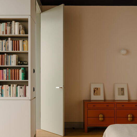 Die übrigen Farbtöne der Möbel sind eher blass, gedeckt sowie elfenbeinfarben und ergeben so ein harmonisches Ganzes. Auch Möbelentwürfe des Innenarchitekten kommen hier zum Zuge: Die Ambassador Chaiselongue, der Junior Armchair und der Tisch Otto – um nur einige zu nennen. Das Bad aus Lavastein, maßgefertigte Schränke, ein Teil der Decke mit Edelstahl verkleidet: Ein perfektes Zuhause für zwei Personen – vornehm zurückhaltend und elegant, mit diskret luxuriöser Grundnote.