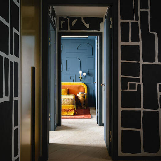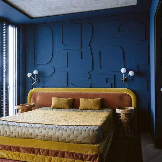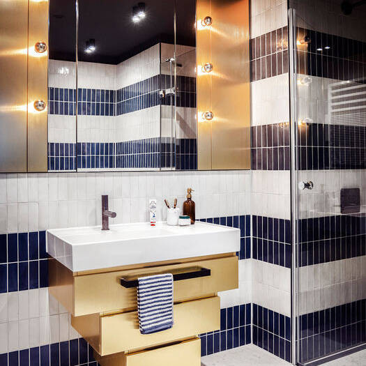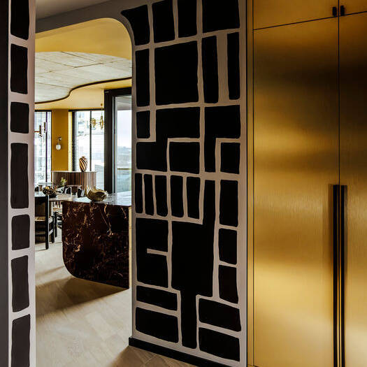 Das Apartment vereint unterschiedliche Stile sowie Kontraste: Vintage trifft Contemporary. Im Wohnraum dominieren edle Töne wie Gelb und Gold, im Kontrast dazu steht die in schwarz gehaltene Küche mit einer Kochinsel aus „Cherry Red“ Marmor. Sichtbetonflächen bilden einen Gegensatz zu den warmen, harmonischen Farben und goldenen Metallflächen der Schränke, die sich in allen Räumen wiederfinden. Dabei sind die goldenen Oberflächen nicht nur dekorativ: Sie reflektieren das Umfeld sowie Lichtstimmungen, tauchen die Räume in eine warme Atmosphäre und spielen mit den Lichtquellen. Je nach Tageszeit und Blickpunkt ergibt sich ein anderer Effekt. Individuelle, von Fabian Freytag handbemalte Wände im Flur unterstreichen die Einzigartigkeit des Apartments. Der Architektur setzen im Inneren Vintage Möbel einen Bruch entgegen. Das Barmöbel neben der Loggia aus Nussbaum ist aus der Fabian Freytag Kollektion und komplettiert das Gesamtkonzept. Die Badezimmer überzeugen durch den Kontrast aus hochwertig glasierten Fliesen in Blau-Weiß, Badezimmermöbel aus gebürstetem Metall in Gold-Optik sowie einem Boden aus keramischem Plattenwerkstoff.