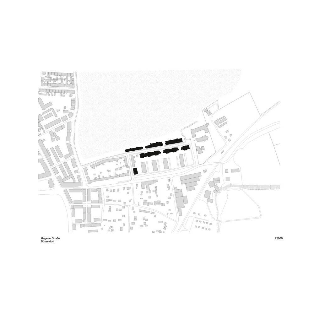 Der Wohnungsbestand in der Hagener Straße in ruhiger Waldrandlage war nicht mehr zu sanieren und musste rückgebaut werden. Unter Beteiligung der Mitglieder der Düsseldorfer Wohnungsgenossenschaft Wogedo und der Anwohnenden wurde im Rahmen eines Werkstattverfahrens die Neubebauung auf beiden Straßenseiten entwickelt. Das am Ende des aufwändigen Verfahrens mit dem Auftrag betraute Frankfurter Architekturbüro Stefan Forster hat ein umfängliches Ensemble von Wohngebäuden geschaffen, das wie aus einem Guss wirkt und doch einige Gestaltungsnuancen aufweist.