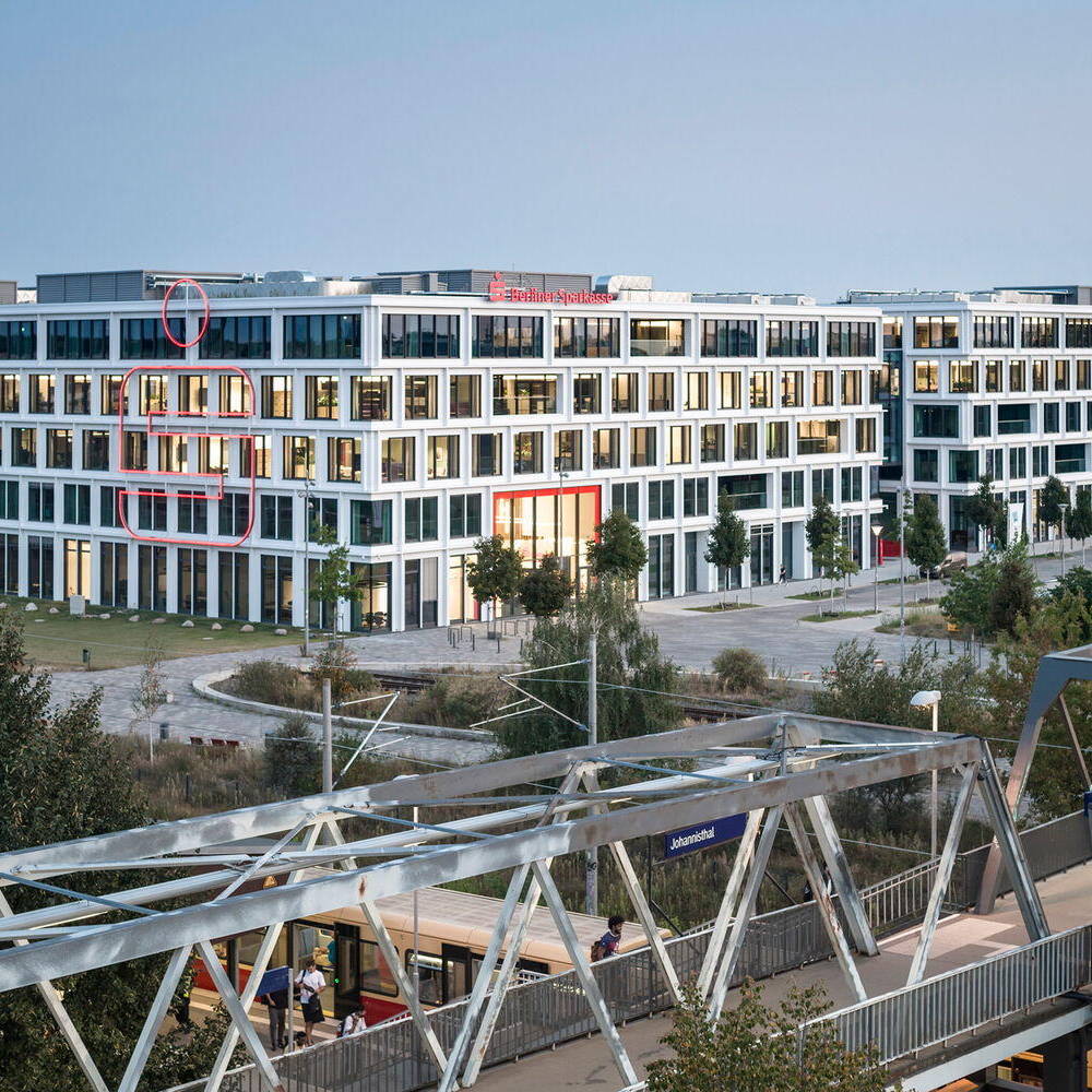 Nicht nur ein Bürogebäude, sondern der Neubau eines Bürokomplexes wurde 2024 in Johannisthal fertiggestellt. Weit außerhalb möchte man meinen – doch weit gefehlt: Der Büro-Campus liegt unweit der Zukunftsstandorte Technologiepark und Medienstandort in Adlershof und ganz in der Nähe des denkmalgeschützten Bahnbetriebswerk Schöneweide jenseits der B96. Bei dem Neubau handelt es sich um einen zweigeteilten Fünf-Geschosser, der künftig der Berliner Sparkasse als Hauptsitz dienen wird. Der Entwurf stammt von Tchoban Voss Architekten.