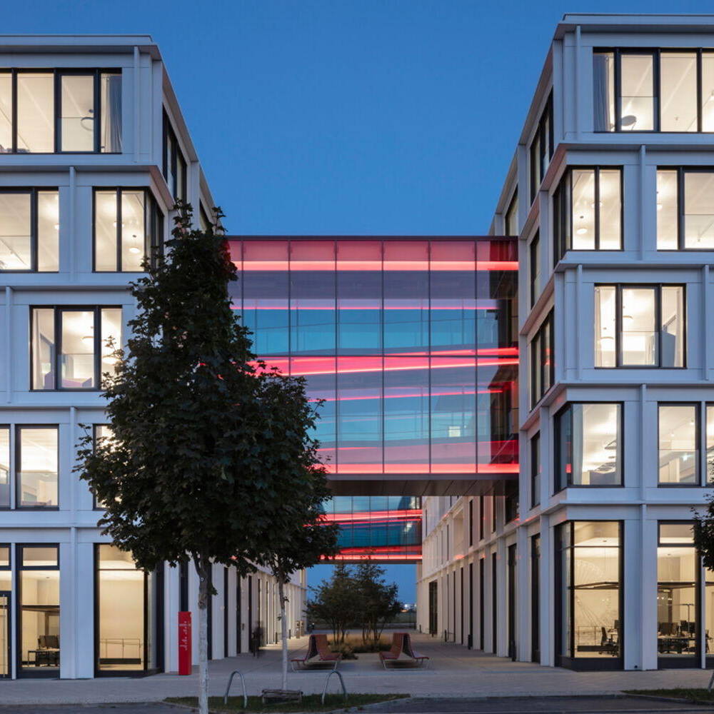 Die beiden Gebäude, B1 und B2, sind der Startschuss für einen umfangreichen Campus, der hier entstehen soll. Die beiden Quader können an getrennte Mieter vergeben oder zusammengeschaltet werden. Sie sind durch Glasbrücken im zweiten und im dritten Obergeschoss miteinander verbunden. Beide Gebäude verfügen über Innenhöfe sowie intensiv begrünte Dachterrassen auf der Höhe des 3. Obergeschosses mit der Größe von je 265 m², als Aufenthaltsorte für die Beschäftigten. Zudem gibt es, über die vier Geschosse verteilt, 20 überdachte Loggien, die – witterungsabhängig – als zusätzliche Arbeitsplätze im geschützten Außenbereich genutzt werden können. Auf dem Pfosten-Riegel-Erdgeschoss sitzen die drei Obergeschosse mit einer vorgehängten Fassade als Raster aus weißen Aluminiumelementen. Das Raster verspringt von Stockwerk zu Stockwerk. Im vierten Obergeschoss gibt es großflächige, sechsteilige Panoramafenster, die den Gesamteindruck auflockern. An allen Fenstern und Loggien gibt es Glasbrüstungen, was sich positiv auf den Lichteinfall im Gebäude auswirkt. Selbstverständlich ist der gesamte Gebäudekomplex barrierefrei ausgeführt.