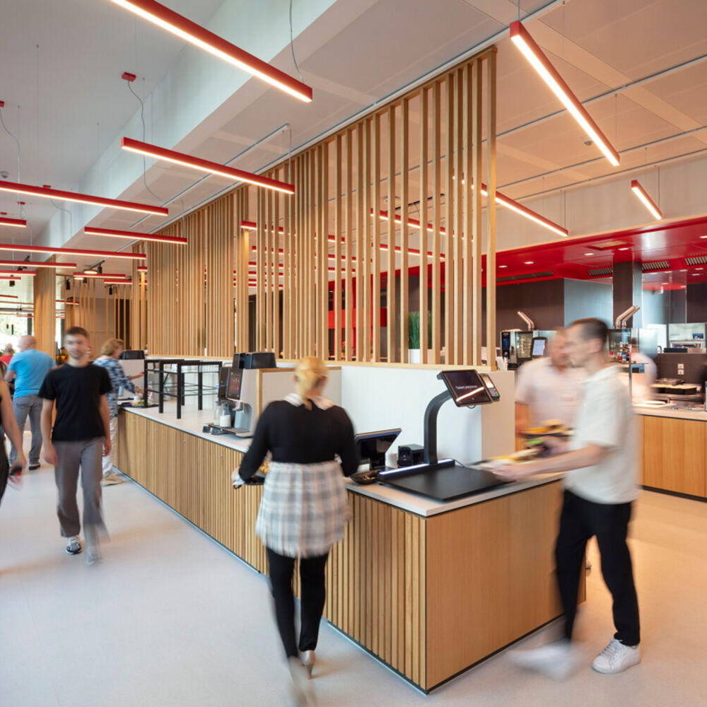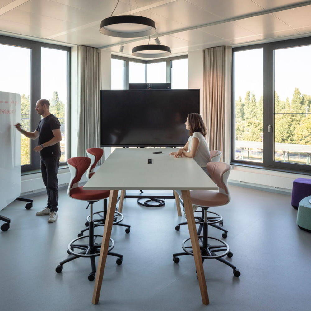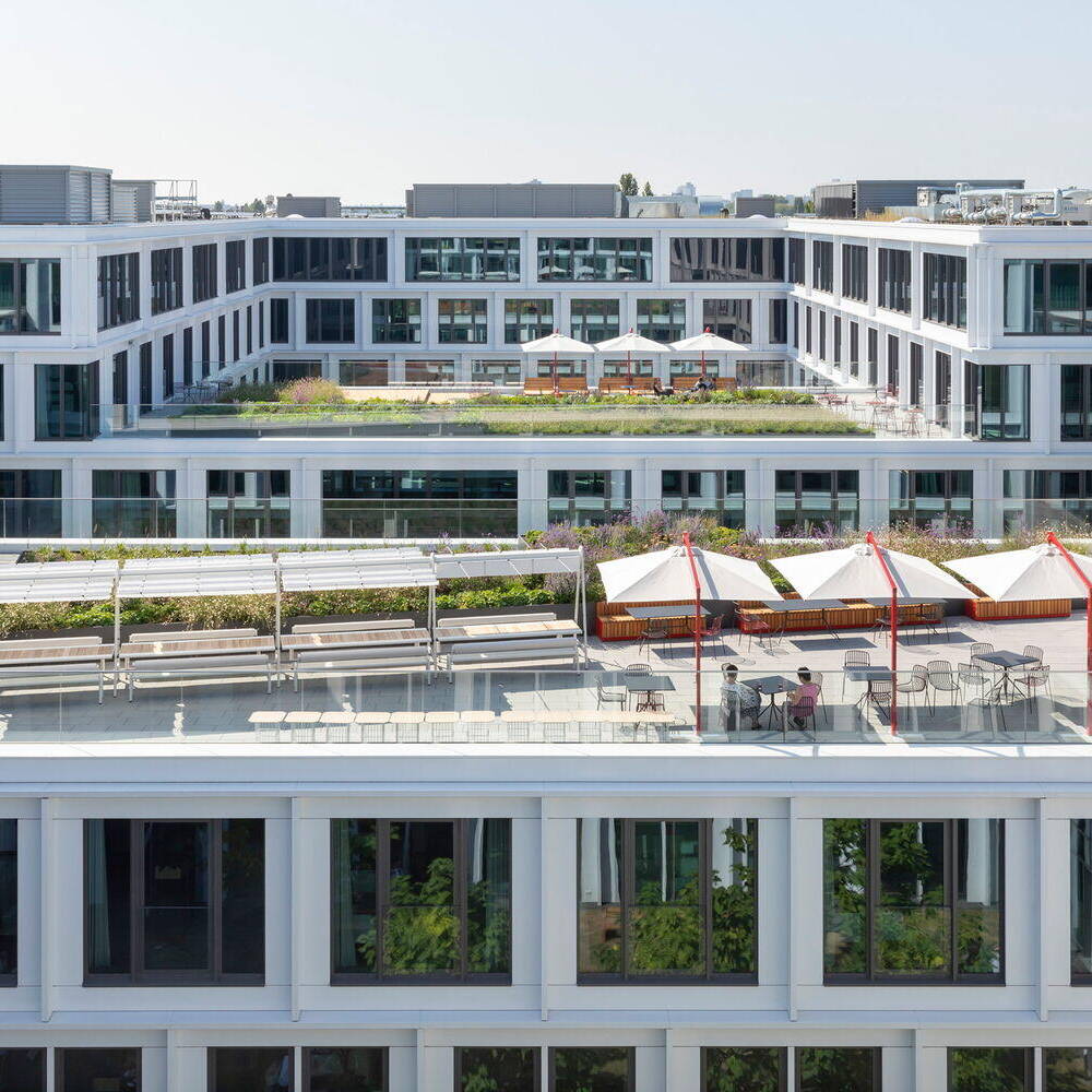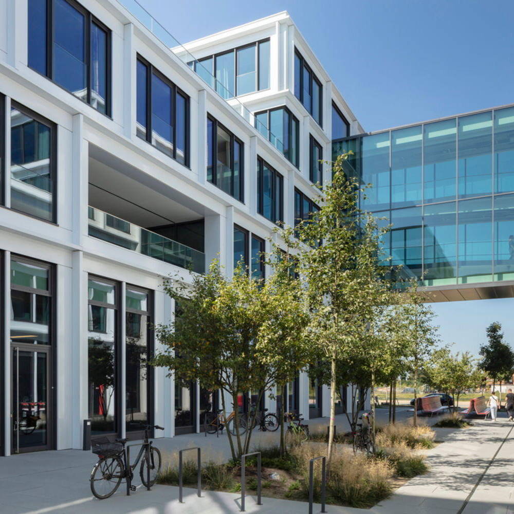 Gebäude B1 betritt man durch einen großen, repräsentativen Eingang. Von Haus B2 führt eine Durchwegung zu den Innenhöfen, von denen aus Konferenz- und Schulungsräume sowie eine Kantine zu erreichen sind. Die Gebäude werden mit Fernwärme geheizt. Die Betonkerne sind mit Heiz- und Kühlsegeln ausgestattet, um den Energieverbrauch so effizient wie möglich zu gestalten und ein angenehmes Raumklima zu schaffen. Die Außenanlagen, die Begrünung der Innenhöfe sowie der Dachterrassen wurden von Topotek 1 Landschaftsarchitekten und von Holzwarth Landschaftsarchitektur geplant und ausgeführt. Bei der Wahl der Baustoffe und des Energiekonzeptes hielt man sich an höchste ökologische und ökonomische Anforderungen, sodass das Gebäude von der DGNB (Deutsche Gesellschaft für Nachhaltiges Bauen) eine Gold-Zertifizierung erhielt.