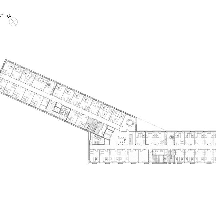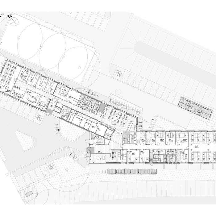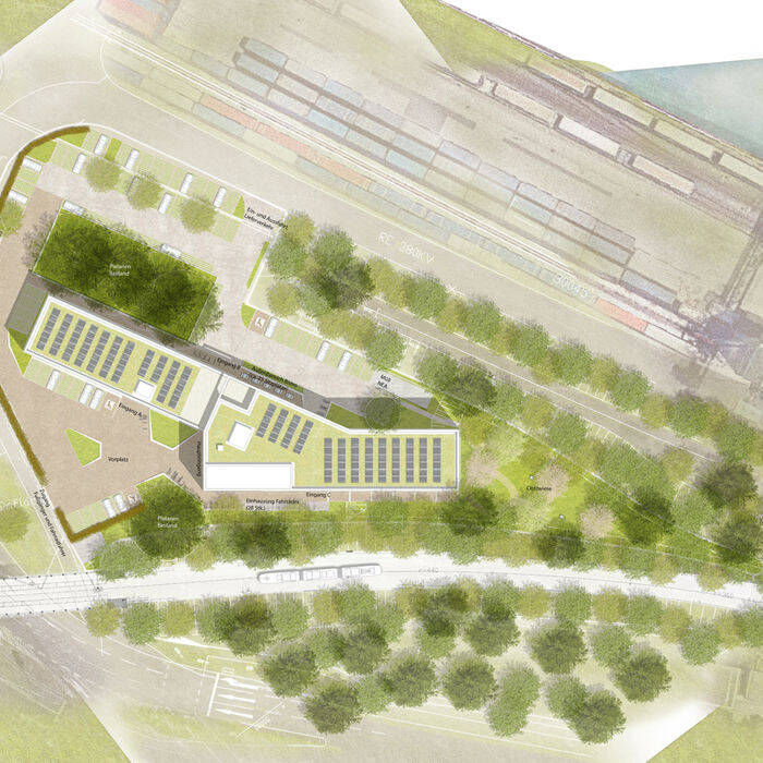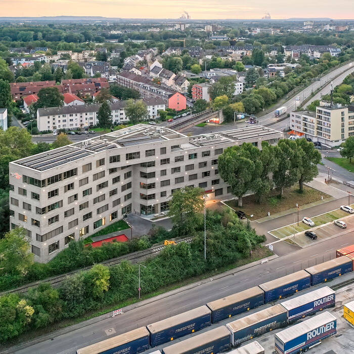 Mit seinem charakteristisch geknickten Gebäudeverlauf orientiert sich der fünfgeschossige Baukörper sowohl an der Ausrichtung des höher liegenden Bahndamms als auch an der Achse des Niehler Damms. Dabei wird sein südöstlicher Teil in seiner annähernden Parallelität zum Bahndamm mit einem zusätzlichen Staffelgeschoss betont. Auf insgesamt 8.500 m² Bruttogeschossfläche wurden Arbeitsplätze für bis zu 270 Mitarbeiter:innen geschaffen. Zusätzlich zu den Büro-, Besprechungs- und Konferenzräumen befinden sich in dem Gebäudebereich Sonderbereiche wie etwa eine Akademienutzung sowie ein Bistro. Das Verwaltungsgebäude wird dabei aus zwei Bauteilen gebildet, in denen sich jeweils zwei Einheiten mit etwa 400 m² Nutzfläche befinden. Dabei wurde einer der Bauteile autark mit eigenem Zugang und WC-Kern geplant, so dass die Bereiche flexibel und separat gegebenenfalls auch an weitere unternehmensfremde Nutzer vermietet werden können. Die monolithische Fassade wurde als eine zweischalige Konstruktion aus Stahlbeton und Vormauerziegeln gestaltet. Vor allem durch die geschossweise Verschiebung der Fensteröffnungen im Raster der Ausbauachsen ergibt sich ein dynamisches Erscheinungsbild, das die Unternehmenstätigkeit auch ästhetisch anklingen lässt: rangieren, verschieben, bewegen. Ein Relief in der Ziegellage, bestehend aus versetzt gemauerten Steinen, bildet zudem eine horizontale Bänderung. Diese erstreckt sich um beide Bauteile herum und wird schließlich im Bereich der Haupteingangsfassade an einer flächigen Giebelwand gefangen. Im Dachaufbau wurden Retentionsspeicher zur Regenrückhaltung berücksichtigt; alle Dachflächen wurden extensiv begrünt. Auf dem Staffelgeschoss befindet sich schließlich eine Dachterrasse, die barrierefrei erschlossen ist und einen Panoramaausblick über das Hafengebiet, den Rhein und die City eröffnet.