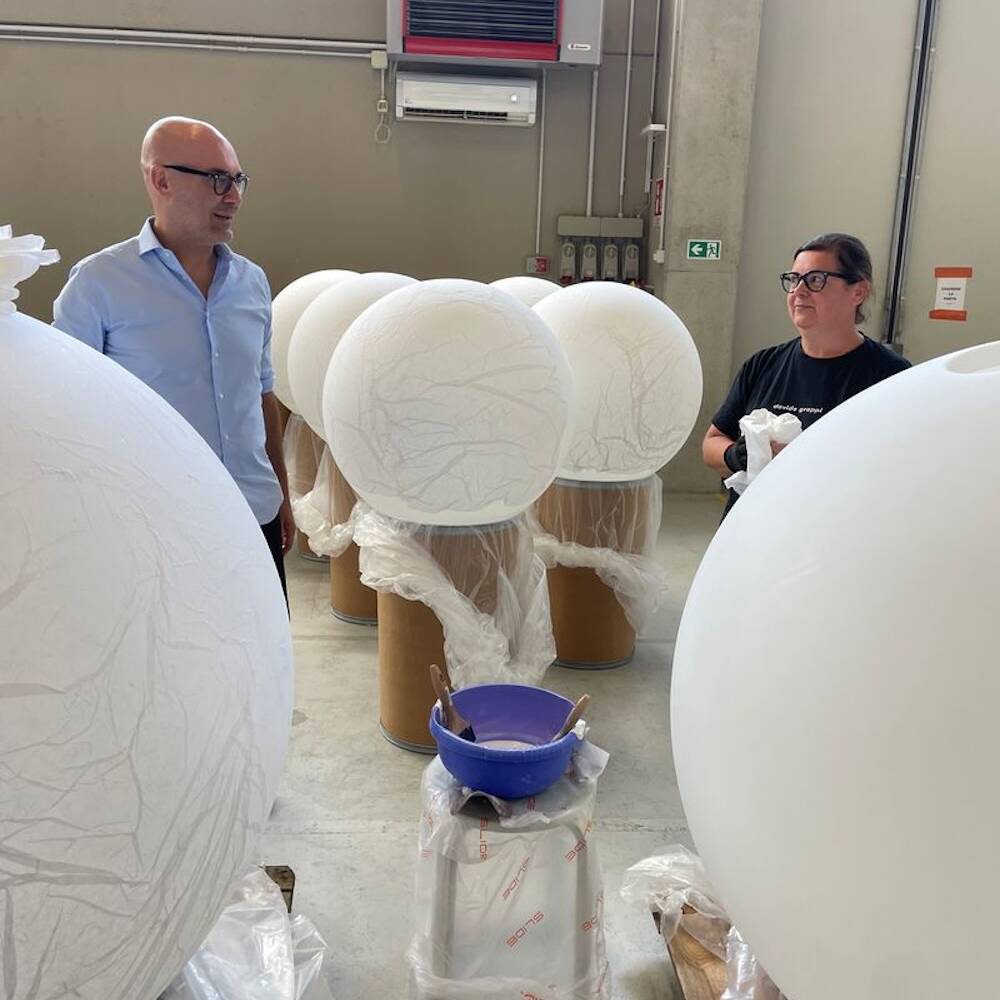 Bei manchen Leuchten kommt auch der verspielte, witzige Davide Groppi durch: Zum Beispiel bei seiner Race Of Lights Wandleuchte, eine elektrifizierte Carrerabahn, auf der Leuchtbirnen wie Autos beliebig platziert werden können. Und mit einer weiteren hat er den Traum der Menschen, den Mond ins Haus zu holen, erfüllt: Die Moon – eine einfache und zugleich geniale Idee, die im Jahr 2005 Gestalt angenommen hat und 20 Jahre später noch immer reine Magie ist. In seiner Manufaktur in Piacenza – die inklusive Lichterlebnis-Showroom zwei große Hallen im Industriegebiet füllt – wird sie zusammengefügt: In sorgfältiger Handarbeit wird auf die in Italien gefertigten Kunststoffkugeln – mit Durchmessern von 60 Zentimetern bis zu imposanten zwei Metern – japanisches Washi-Papier aufgebracht. Beleuchtet erinnert die strukturierte Oberfläche an die Kraterlandschaft des Mondes.