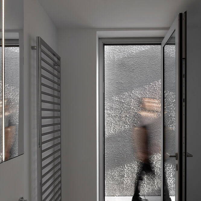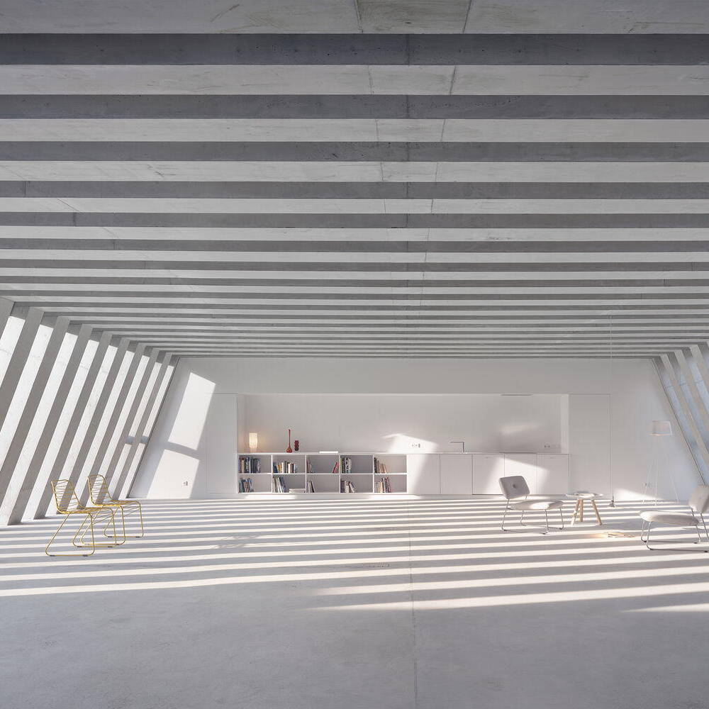 Das gesamte alte Dach wurde abgetragen und durch einen kompletten Neubau ersetzt. Das innovative Projekt kombiniert die rohe Ästhetik des industriellen Erbes mit zeitgenössischer Eleganz und Präzision. Der Kern des Architektenentwurfs für die Aufstockung basiert auf einer Reihe von 20 Stahlbetonrippen, die das Dach tragen und eine Seitenwand bilden. Eine mit einer Glashaube überdachte riesige Terrasse könnte man zunächst meinen. Es handelt sich jedoch um einen grundrissfreien 120 m² großen Raum, der beliebig nutzbar ist. Die Betonrippen mit der Breite von 30 Zentimetern sind in gleichmäßigen Abständen angeordnet. Sie trotzen der Schwere des Materials und schaffen stattdessen erstaunlicherweise Leichtigkeit. Die Umsetzung dieser Grundidee erforderte eine zusätzliche statische Ertüchtigung der bestehenden Bausubstanz, um die Lasten der neuen Struktur sicher aufzunehmen. Die Stahlbetonrippen wurden vor Ort betoniert, die Schalung jedoch vorgefertigt und auf der Baustelle millimetergenau angepasst. Die Verwendung von Sichtbeton unterstreicht die industrielle Ästhetik. Der neue Dachraum bietet flexible Nutzungsmöglicheiten. Erschlossen wird das neue Geschoss durch zwei Treppenhäuser und barrierefrei durch einen aussenliegenden Aufzug. Ein schmaler, 15 Meter langer außenliegender Korridor, begrenzt durch die Brandwand auf der einen und den Neubau auf der anderen Seite, führt von einer der beiden Treppenhäuser zum eigentlichen mittigen Eingangsbereich und weiter über eine Treppe auf die Dachterasse. Im Eingangsbereich gehen links und rechts zwei Räume mit einem kleinen Bad ab, bevor man den Hauptraum betritt. Die akkurate Anordnung der Rippen mit den ausgesparten Zwischenräumen schafft ein faszinierendes Wechselspiel von Licht und Schattenflächen – je nach Witterung und Lichteinfall unterschiedlich. Die Rippen werfen Schatten auf dem feingeschliffenen Estrich, sodass ein Strahlenmuster am Boden entsteht. Auch von aussen gesehen bietet das „Gebäude“ auf dem Dach einen frappierenden Anblick – es wirkt wie die moderne Interpretation einer Säulenhalle.