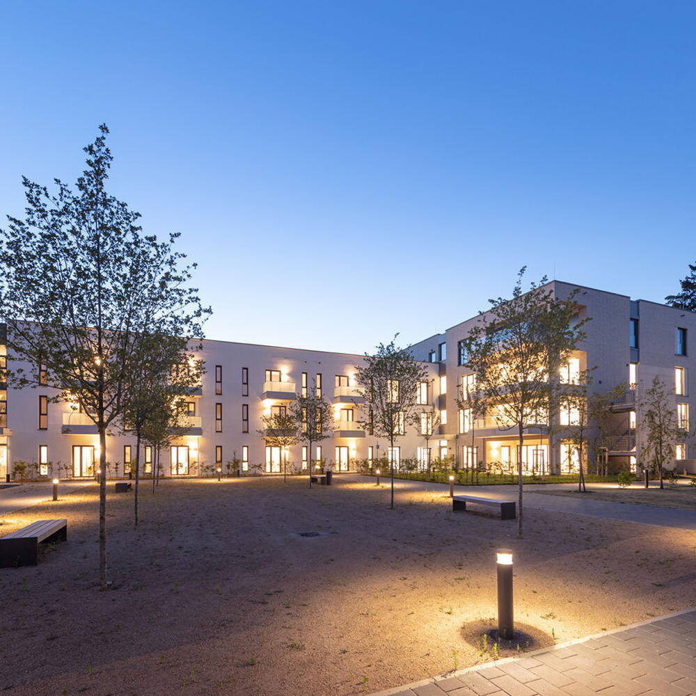 Der Neubau reagiert sensibel auf das benachbarte, denkmalgeschützte Schumannhaus: So wurden sowohl die Fassadengestaltung als auch die Außenräume in enger Abstimmung mit der Denkmalschutzbehörde entwickelt. Die Anbindung an den Platzraum des Schumannhauses musste ermöglicht und denkmalgeschützte Durchwegungen wie der historische „Schumann-Spazierweg“ erhalten werden. Die Müllentsorgung erfolgt weitgehend unsichtbar über eine Unter-Flur-Lösung. Der Neubau, ein dreigeschossiger Baukörper, präsentiert sich mit einer zurückhaltenden weißen WDVS-Fassade. Der quer dazu angegliederte Gebäudekörper ist dagegen viergeschossig ausgebildet und mit hellen beigefarbenen Klinkerriemchen im Dünn- und Langformat verkleidet, wie sie auch die Neubauten der benachbarten „Schumann Höhe“ prägen. Die vielfältigen Nutzungen des Gebäudes sind dabei nach außen nicht ablesbar: Mit seinen durchgängig bodentiefen Fenstern, den Glasbrüstungen und hochwertig gestalteten Freisitzen fügt sich das Wohngebäude einheitlich elegant in den heterogenen Kontext ein. Ein besonderes Highlight ist der mediterrane Dachgarten mit einem aufgeständerten Außenpool, der ausschließlich den Bewohner:innen der Eigentumswohnungen vorbehalten ist. Die naturnah bepflanzten Außenanlagen sowie die Begrünung des Quartiers tragen zudem zur Verbesserung des urbanen Mikroklimas bei und schaffen eine grüne Oase im urbanen Raum.