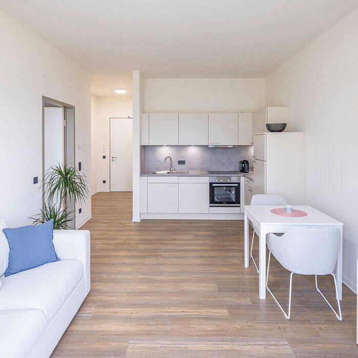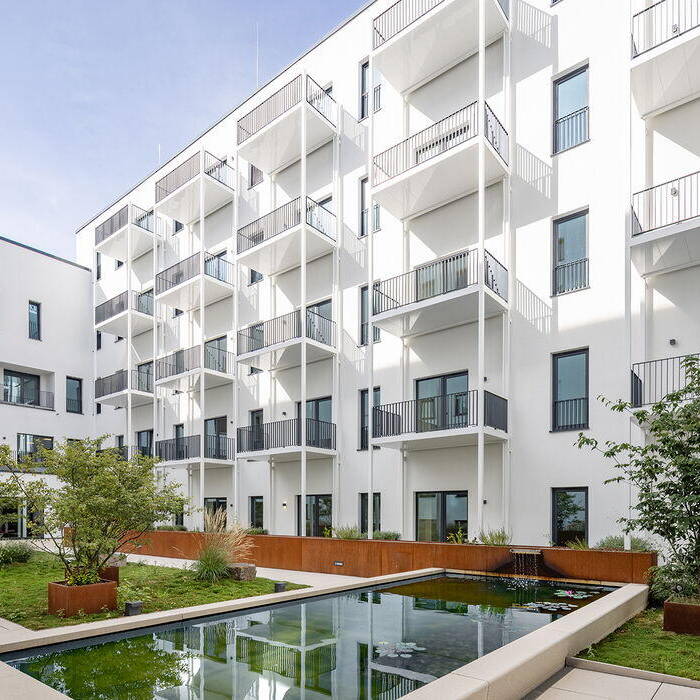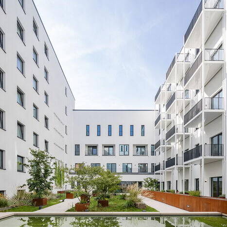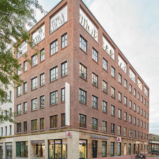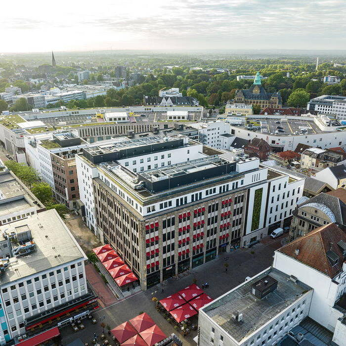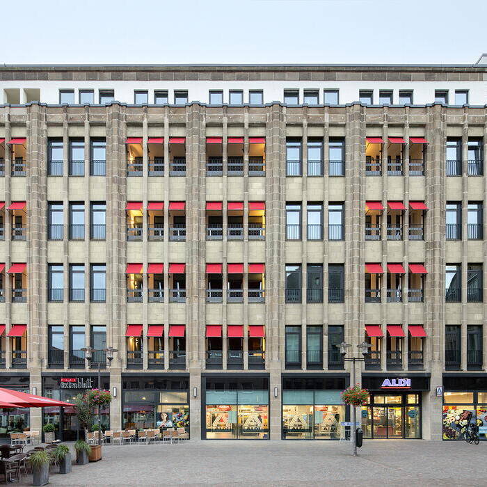 Die Ausgangslage war geprägt von den Folgen des Bergbaus. Seit 1892 wurde in Recklinghausen eine Bergsenkung von rund sechs Metern verzeichnet. Im einstigen Karstadt-Gebäude schlug sich dies mit teilweise bis zu 80 Zentimetern Schieflage nieder. Auch die Höhen im Bestand und die Geschossdeckenstärken stimmten nicht mit den Planunterlagen überein. Die Folge: Ein Gebäudeteil musste abgerissen, Gebäudeübergänge auf die Neigung abgestimmt, die Horizontallasten der Stützen berechnet und Leichtbaufassaden geplant werden. Durch den Teilabriss ergab sich jedoch auch die Möglichkeit eines Hotel-Neubaus mit zusätzlichen Geschossen. Die historische Fassade zur Marktseite wurde weitestgehend erhalten und in den oberen Geschossen geöffnet, so dass hier Betreutes Wohnen mit Loggien und roten Markisen entstehen konnte. Zudem wurde der in den 70er-Jahren geschlossene Lichthof wieder geöffnet. Hier findet man nun einen attraktiven Innenhof mit viel Grün und einer großen Wasserfläche, der der Immobilie zusätzlichen Lichteinfall beschert. Das Gebäude neben dem Haupthaus, das ehemalige Bettenhaus, wurde um zwei Geschosse erhöht, in denen sich heute eine Kita befindet. Der Clou ist der Außenbereich mit Spielgeräten auf der Dachfläche.