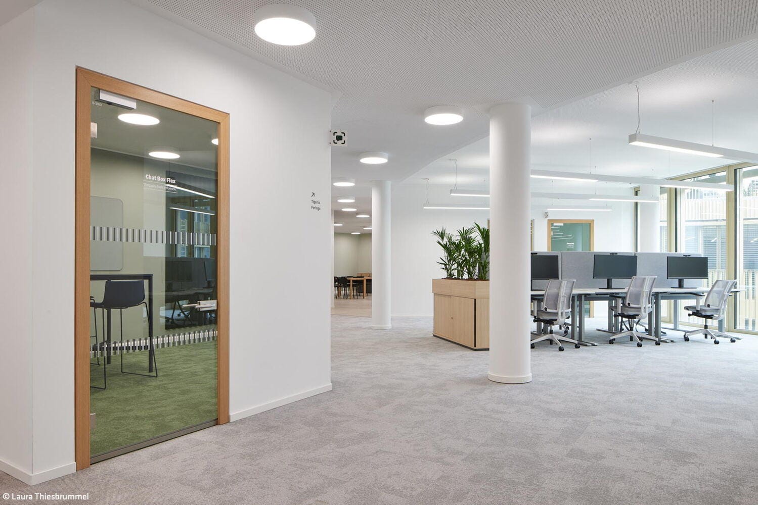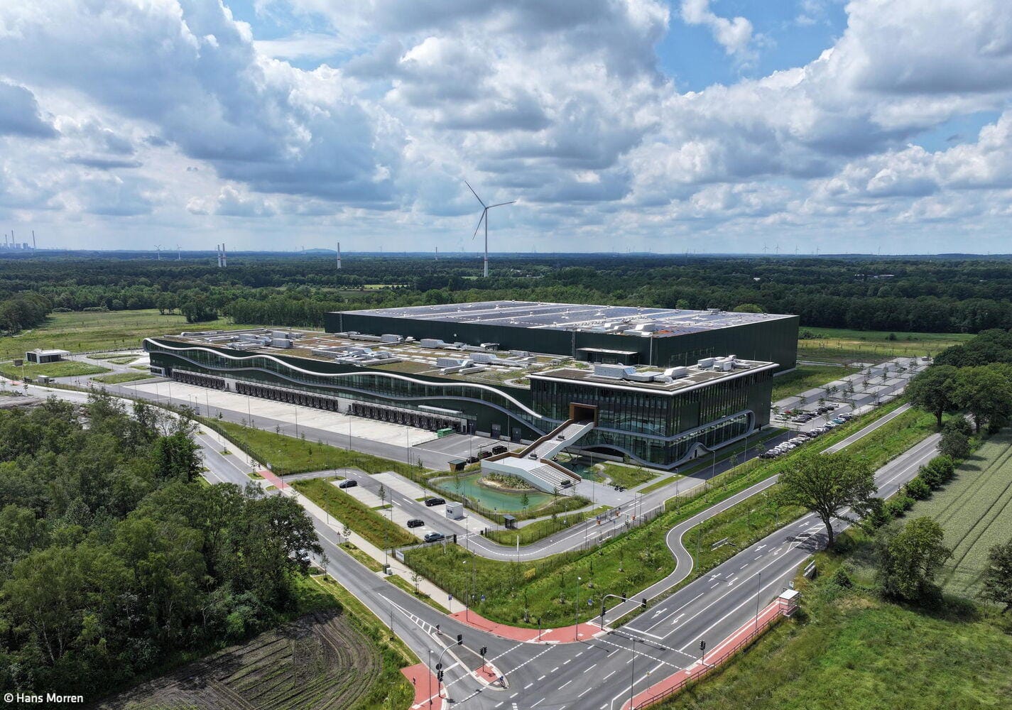 Vis-à-vis des denkmalgeschützten Gebäudes des Drahtherstellers Felten & Guilleaume liegen die zwei ersten Gebäude des I/D Cologne an einem neuen Quartiersplatz. Die industriell geprägte Nachbarschaft – auch Carlswerk, E-Werk und Palladium liegen nicht weit entfernt – wurde dabei zur Inspiration für eine zeitlose Architektursprache. Beide Häuser bilden eine gemeinsame städtebauliche Blockrandbebauung mit gleicher Geschosshöhe aus und sind real doch klar voneinander getrennt. Die Klinkerfassaden lassen sie einerseits ähnlich erscheinen, andererseits werden sie durch die unterschiedliche Gliederung – horizontal bei dem einen, vertikal bei dem anderen – voneinander differenziert. Auch sticht das nördliche Haus durch expressive Vor- und Rücksprünge und erhabene Ziegelreihen besonders ins Auge, während das südliche Gebäude optisch reduzierter und eher nüchtern-elegant auftritt. „Die Wahl des Materials Klinker war dabei nicht nur eine Referenz an die Umgebung. Es ging uns auch darum, Wertigkeit und Langlebigkeit mithilfe von sauberen Details und klaren Strukturen zu transportieren“, erläutert Christian Hein, Projektleiter bei RKW Architektur +. Ähnlich industriell wie die Fassaden sind auch die Innenräume gestaltet: Sichtbarer, unbehandelter rauer Beton, offene Installationen, verzinkter Stahl und Stirnholzparkett sind die prägenden Bestandteile beider Häuser. Ebenfalls durch die benachbarten historischen Drahtwerke inspiriert wurde auch die Gebäudebeschriftung in einer Drahtschrift ausgebildet. So wird die industrielle Tradition der Schanzenstraße stimmig in die Zukunft geführt. Erst kürzlich wurden die beiden Gebäude für ihren nachhaltigen Bau und Betrieb mit LEED Gold zertifiziert.