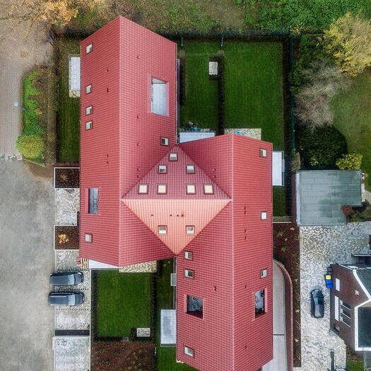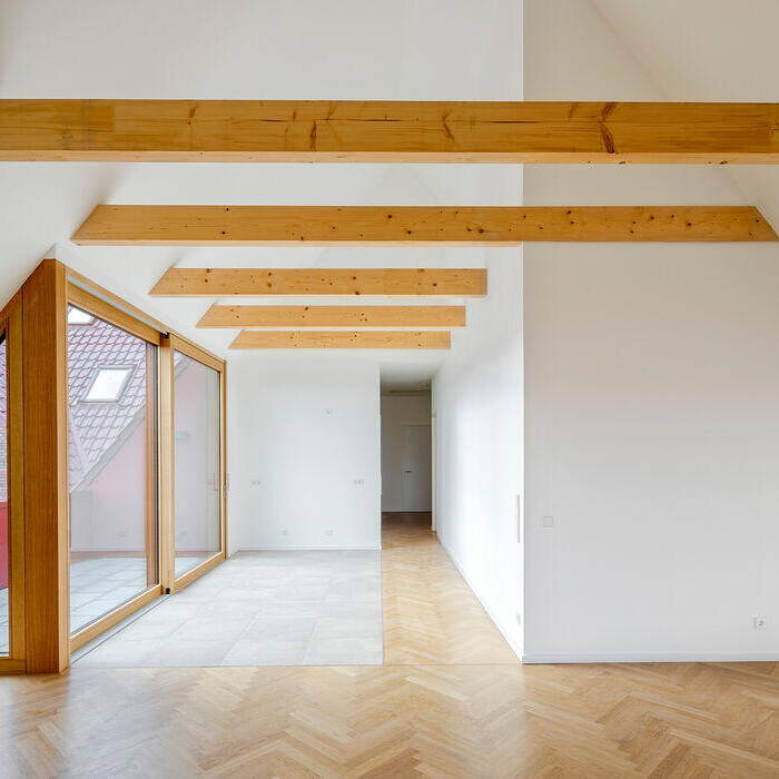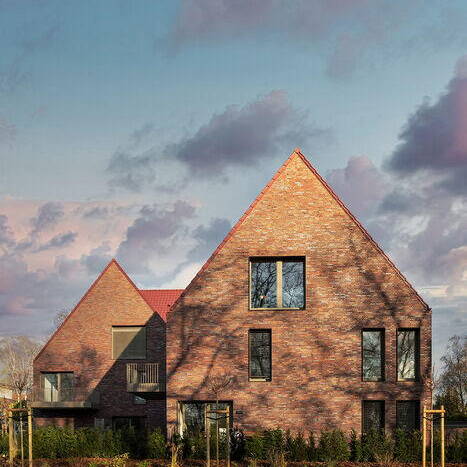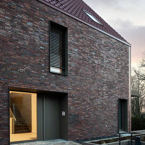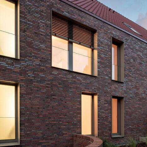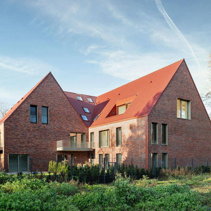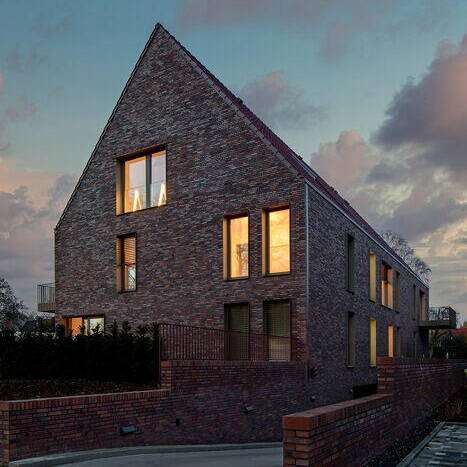 Das Mehrfamilienhaus befindet sich in einem Wohngebiet in unmittelbarer Nähe zum Stadtzentrum und der anliegenden Parkanlage mit dem Stadtsee. Die neuen Gebäude mit Giebeldach stehen auf einem 1.700 m² großen Eckgrundstück und gliedern sich durch ihre Anordnung in die kleinteilige Bebauung der Umgebung ein. Das Dach und die Fassade sollten, so der Wunsch der Bauherren, farblich einheitlich sein und sich, modern interpretiert, an der Nachbarbebauung orientieren. Bei der Lage des Gebäudes war ortstypischer roter und lebendig wirkender Klinker das Material der Wahl für die Fassade. Das Dach passt mit seinem warmen Rotton harmonisch dazu. Einzig die Holz-Aluminium-Fenster durchbrechen mit ihren herausstehenden Faschen das strenge Farbkonzept. In dem Mehrfamilienhaus sind 13 Zwei-bis Vierzimmerwohnungen in Größen zwischen 50 bis 130 m² entstanden. Jede Wohnung verfügt entweder über eine Dachterrasse, einen Balkon oder einen kleinen Garten. Insbesondere die offenen Wohn-Ess-Bereiche, die teilweise durch Herausschneiden der Geschossdecken Höhen von bis zu fünf Meter erreichen und dort durch viele, großzügige Dachflächenfenster lichtdurchflutete Räume bilden, tragen zu einem Gefühl der Großzügigkeit bei und sorgen für viel natürlichen Lichteinfall. In den weiß gestrichenen Wohnungen wurde passend zu den Fensterrahmen aus geölter Eiche auch Eichenparkett verlegt, im Dachgeschoss macht es als Fischgrät auf sich aufmerksam. Mit seinen natürlichen Materialien – weißer Werkstein und grüner Anröchter – sowie einem farblich angepassten Treppengeländer wird im gemeinschaftlich genutzten Flur eine angenehme und einladende Atmosphäre geschaffen. Jede Etage verfügt zudem über einen gemeinschaftlichen Waschraum. Das Gebäude ist mit einem bivalenten Heizsystem ausgestattet, das zu 50 Prozent mit einer Sole-Wärmepumpe in Verbindung mit Erdwärme heizt. Die anderen 50 Prozent werden über eine Gasheizung gedeckt. Der sommerliche Wärmeschutz erfolgt über außenliegende Raffstoren. In der Tiefgarage befinden sich 13 Pkw-Stellplätze sowie 30 Fahrradstellplätze im Fahrradkeller. Im Außenraum kommen weitere Besucherstellplätze hinzu.