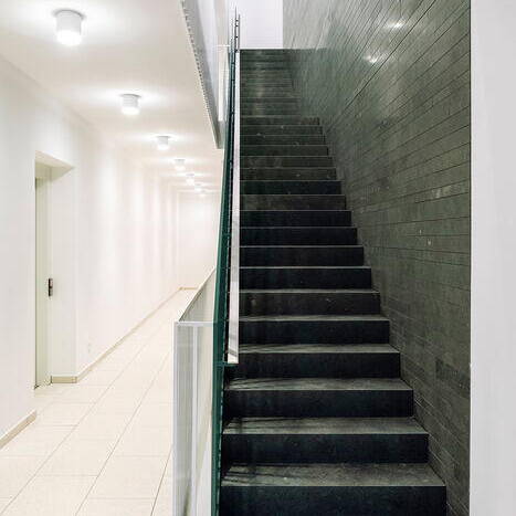 Zwei Baukörper bilden mit einem gemeinsamen Treppenhaus eine Einheit