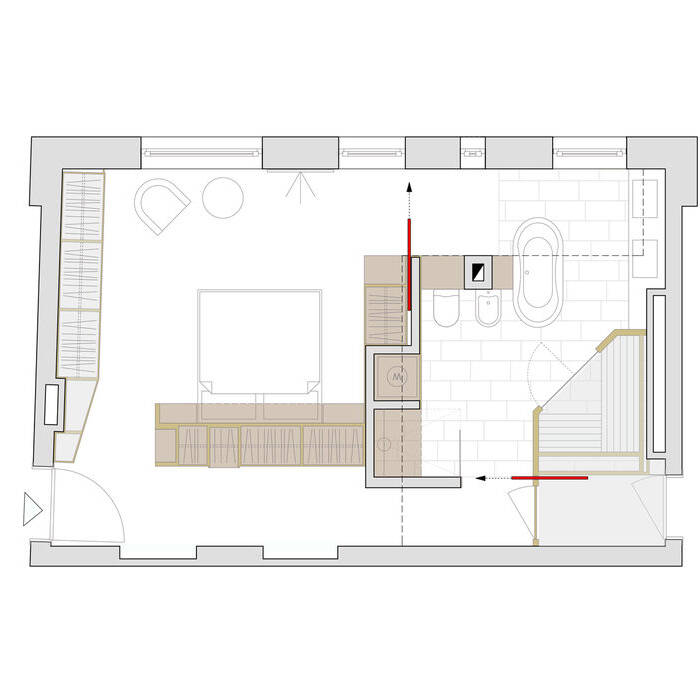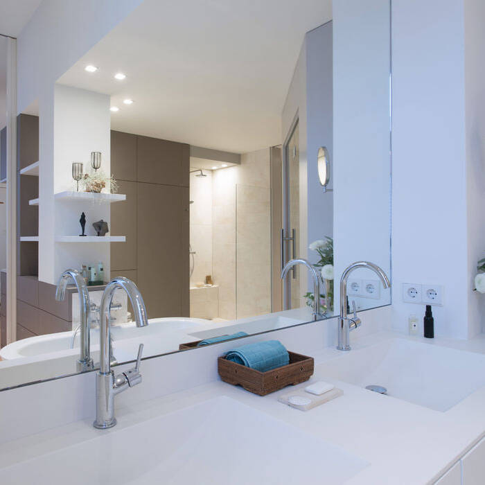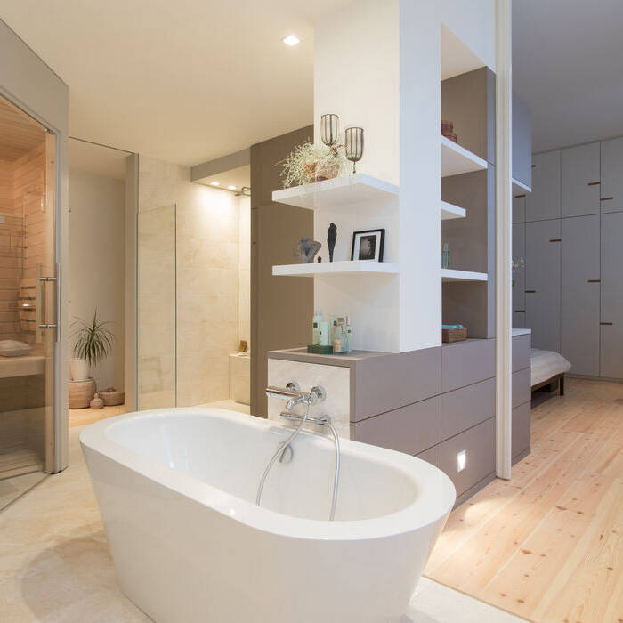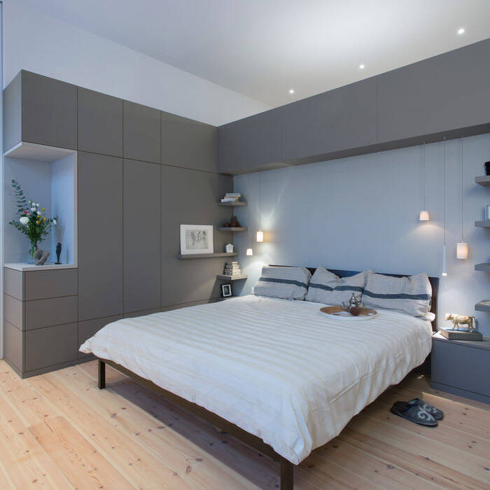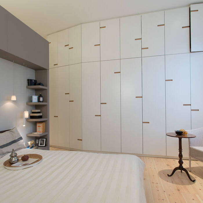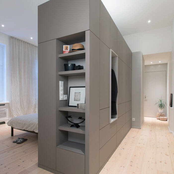 Das Schicksal vieler großer Wohnungen ist: Die Kinder sind aus dem Haus und für die Eltern beginnt der dritte Lebensabschnitt auf viel zu großer Fläche. Der Seitenflügel der 220 m² großen Altbauwohnung in Schöneberg, der bislang drei Kinderzimmer und zwei Bäder beherbergte, sollte komplett entkernt und saniert werden. Für die Neuorganisation der 52 m² großen Fläche wurde das Innenarchitekturbüro von Elisabeth Müller beauftragt. Das Ehepaar, das im vorderen „offiziellen“ Teil weiterhin ein reges gesellschaftliches und familiäres Leben pflegt, wünschte sich im Seitenflügel einen ganz privaten Rückzugsbereich. Das vorgegebene Raumprogramm beinhaltete im Wesentlichen einen Schlafbereich mit hoher Wohnqualität, ein komfortables Badezimmer inklusive einer kleinen Sauna, einen großzügigen Storagebereich mit raumhohen Schrankflächen, in den auch ein Hauswirtschaftsbereich integriert werden sollte und speziell für die Bauherrin einen kleinen Bibliotheksbereich. Die bestehende kleine Abstellkammer und der zweite Fluchtweg ins Seitenflügel-Treppenhaus sollten erhalten bleiben. Neben der Umsetzung des komplexen Anforderungsprofils gehörte zu der Umbaumaßnahme eine komplette haustechnische Sanierung – Elektro, Sanitär und Heizung – wie auch neue Holzfenster, Bodenbeläge, abgehängte Decken, Putz sowie Trockenbau- und Malerarbeiten. Lediglich zwei Altbautüren und eine historische Heizkörperverkleidung konnten dabei erhalten werden. Nur ein mittig gelegener zentraler Versorgungspunkt für Zu-und Abwasser war die Restriktion des Altbaus und eine große Herausforderung für die Planung der insgesamt sechs Sanitärobjekte, die dort angeschlossen werden mussten. Um das umfangreiche Raumprogramm auf der begrenzten Fläche unterzubringen und dennoch einen großzügigen offenen und ablesbaren Gesamtraum zu erhalten, entwarf die Innenarchitektin einen flügelartigen Raumteiler als zentrales Element. Hier wurden Dusche, WC, Bidet und eine freistehende Badewanne sowie der maßgeschneiderte Waschtisch an der Wand über einen Kniff angeschlossen. Neben großzügigen Schrankelementen konnten zudem Waschmaschine und Trockner integriert werden. Durch diese Maßnahme entstanden drei räumliche Zonen, die durch zwei raumhohe Flügeltüren temporär und flexibel miteinander verbunden werden können: Ein Schlafbereich mit Sitzecke, ein Wellnessbad mit Sauna und ein Ankleidebereich mit Bibliothek. Um das minimalistische Ambiente zu unterstreichen, kamen neben lackierten Oberflächen vor allem authentische Materialen wie regionale Kieferndielen, Travertin und Leinen zum Einsatz. Die Farbauswahl ist auf beruhigende warme Naturtöne ohne starke Kontraste reduziert. Ein differenziertes Lichtkonzept sorgt für sinnliche Atmosphäre in dieser ganz privaten Ruheoase.