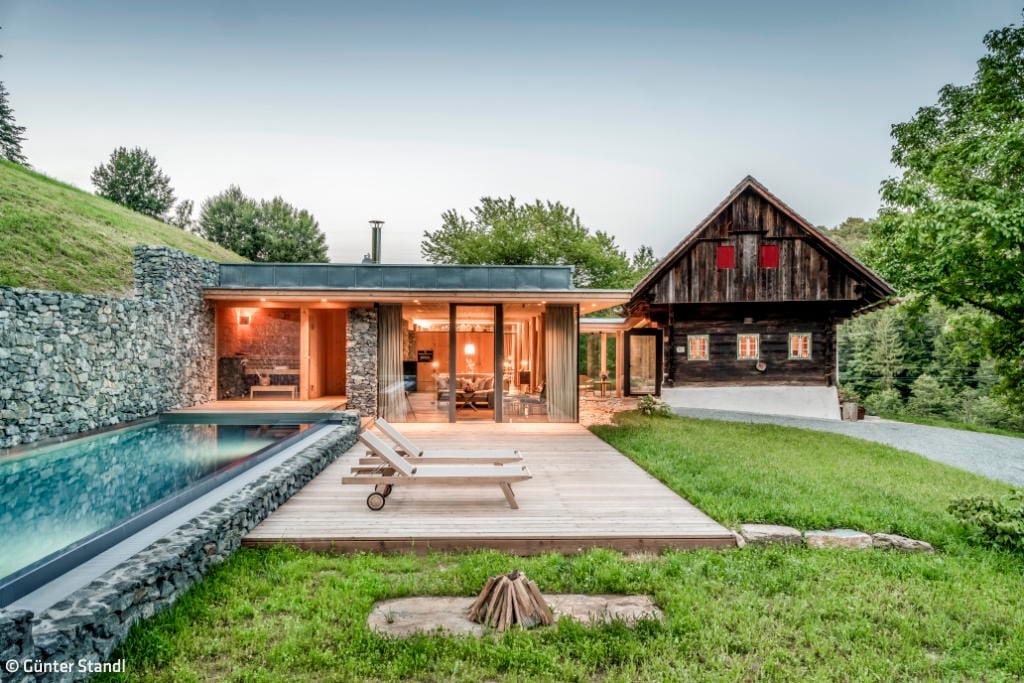 Ein zehn Meter langer, ganzjährig beheizter Pool und eine Panorama-Sauna mit Außendusche setzen das i-Tüpfelchen mit einer modernen Definition von Luxus, ohne das Ensemble zu dominieren. Entworfen wurde das Haus Grabenschake vom steirischen Gastgeber Dietmar Silly gemeinsam mit Johann Heil und der Neuen Wiener Werkstätte. Eine ihrer spektakulärsten Design-Ideen ist sicherlich die puristische, insgesamt 40 Meter lange Wand aus lokalem grauen Stein, die den Neubau durchzieht und die Rückwand des luxuriösen Außenpools zum Berg abgrenzt. Und: Wer hierherkommt, erhält nicht nur ein Ferienhaus, sondern die Leistungen eines Luxushotels: Morgens wird das Frühstück ins Haus geliefert, abends gibt es entweder ein feines Fleisch- oder Fischpaket zum Selbstzubereiten auf dem Grill oder dem eigens entworfenen Slow-Griller der Sillys. Oder man wählt den „Genuss im Glas“, der wie das Frühstück in Kühlboxen direkt vor die Tür platziert wird. Die Speisekarte enthält unter anderem Hirschragout mit Spätzle, Tafelspitz mit Cremespinat und Röstkartoffel, Knödel in Schwammerlsauce, Apfelstrudel mit Vanillesauce und vieles mehr. Die Gerichte sind bereits fertig zubereitet und werden vor dem Verzehr lediglich im Kochtopf oder Backofen erhitzt. In jedem Ferienhaus wartet zudem ein gut gefüllter Kühlschrank mit ausgewählten Silly-Weinen zum Verkosten und Genießen. Wer mag, leiht sich zum Zeitvertreib tagsüber ein E-Bike, genießt die zahlreichen Wander- und Radwege entlang der Weinstraßen oder den 18-Loch-Golfplatz in Murstätten/Lebring. Doch das ist den allermeisten gar nicht so wichtig, wie Gastgeberin Anna Silly, die Tochter von Dietmar Silly, erzählt: „Die wenigsten Gäste wollen, nachdem sie angekommen sind, nochmal raus – sie genießen einfach nur ihr Haus.“