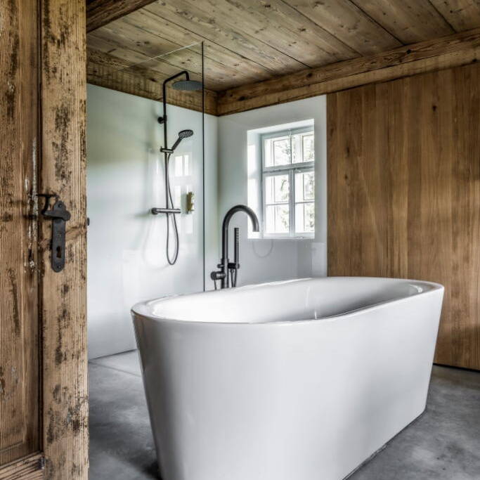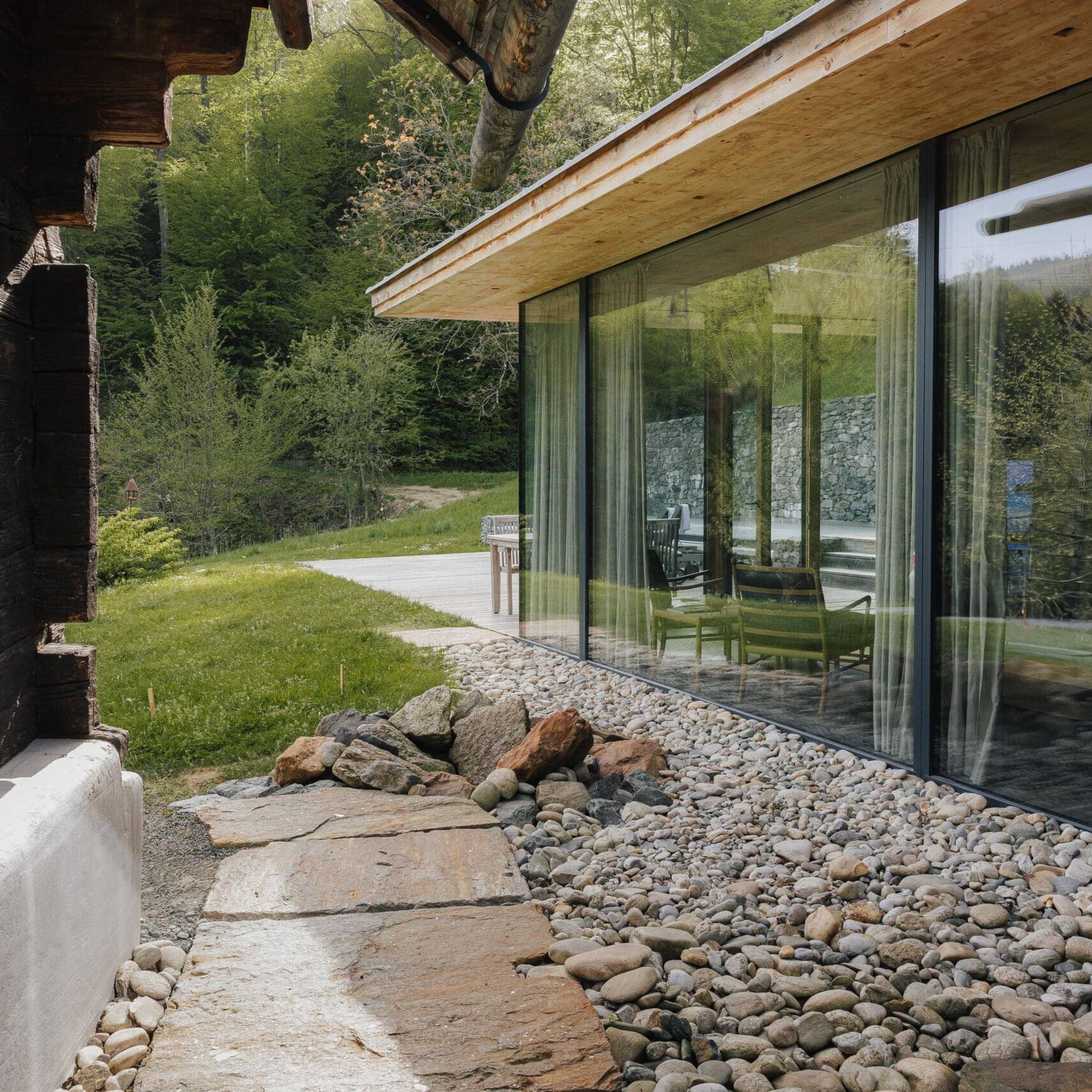Im Neubau warten ein großzügiger Wohn- und Essbereich mit Holzfeuerkamin und einer schwarzen Designerküche, sofort in Beschlag genommen zu werden. Dazu gibt es ein großes Bad und ein zweites Schlafzimmer. Kombiniert mit puristischen Designermöbeln im Scandi-Style ergibt sich daraus das perfekte Bergrefugium. Durch die bodentiefen Glasfronten wird die Landschaft überall Teil des Interieurs: morgens der Nebel, der sich über die Wiesen legt, mittags das satte Grün der Hügel, abends das Glühen der Sonne hinter den Baumwipfeln. Das 55.000 Quadratmeter große Grundstück rundherum verstärkt dieses Gefühl der Weite. Das Haus ist eine Welt für sich, ein Rückzugsort, der die Sinne auf das Wesentliche reduziert. Die Materialwahl folgt einem klaren Konzept: Eichenholz, Leinen, Naturstein. Farben, die aus der Erde kommen – warm, erdig, unaufdringlich.