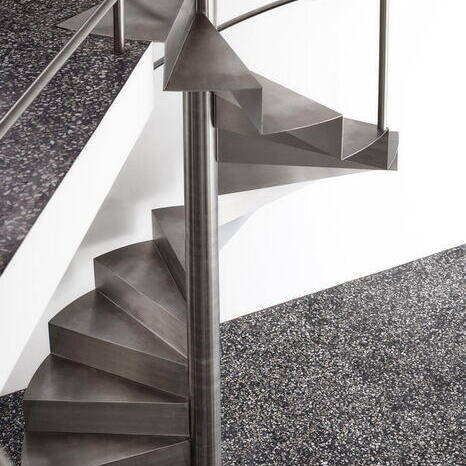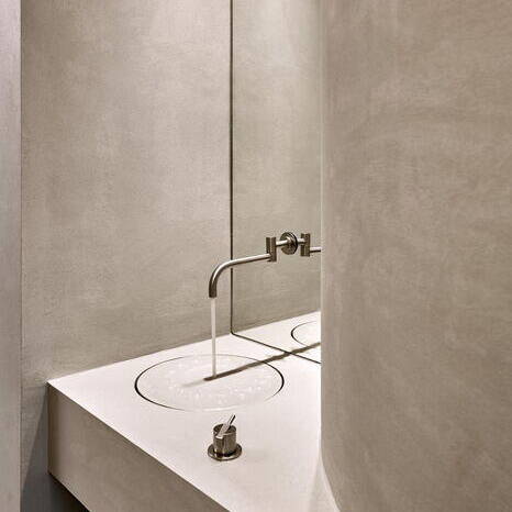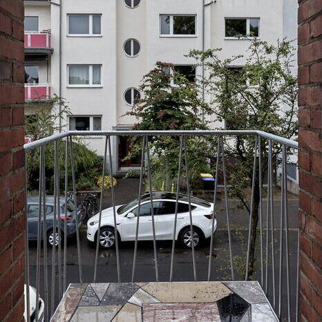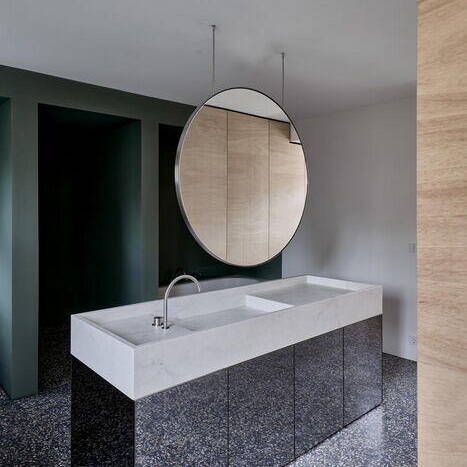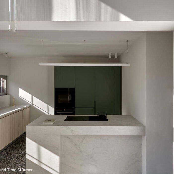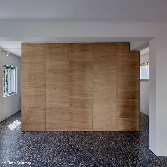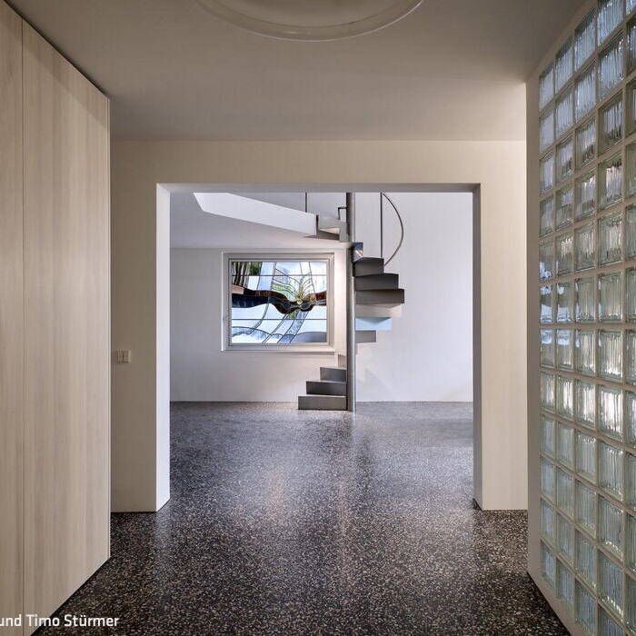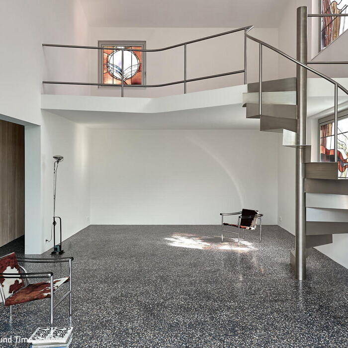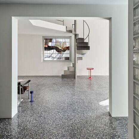 Die Bauherrin, die selbst in dem Haus aufgewachsen ist, verbindet eine tiefe Beziehung zu den Räumlichkeiten, der Geschichte des Bauwerkes und den wertvollen architektonischen Details. Besonders schützenswert sind die vor Ort angefertigten Glaselemente des Kürtener Künstlers und Glasmalers Friedrich Hans „Fritz“ Lauten (1935–1989), der während eines temporären Aufenthaltes im Wohnhaus eine Reihe einzigartiger Kunstwerke schuf. Der Wunsch nach einem behutsamen Eingriff, der den Charakter des Hauses bewahrt, war entsprechend für beide Seiten von höchster Bedeutung. Durch den Rückbau bis zur statisch notwendigen Struktur konnte ein großzügiger, fließender und offener Grundriss erzielt werden, der den Wunsch nach maximaler Freiheit und Flexibilität zulässt. Das Ergebnis ist ein großer, langgestreckter Raum, der durch mit Bedacht platzierte Inseln in Form von Möbelelementen ergänzt wird. Im Eingangsbereich findet man sich am Kreuzungspunkt der Längs- und Querachse wieder, an dem das Wohnhaus erstmalig in seiner vollen Länge und Breite wahrgenommen werden kann. Während sich im hinteren Bereich der Wohnung die privaten Räume wie etwa das Schlaf- und Badezimmer befinden, wird man im vorderen Teil der Wohnung von einem sechs Meter hohen Raum mit einer Zwischengalerie empfangen. Der sakral anmutende Wohnraum erfährt durch das Licht- und Farbspektakel der Glasmalerei von Fritz Lauten eine je nach Lichteinfall dynamische Belebung. Die Glaskunstwerke werden dabei durch ein neu hinzugefügtes Highlight ergänzt: Eine filigrane Edelstahltreppe erschließt die Galerie und positioniert sich als sanft das Tagelicht reflektierende Skulptur im Raum. Die Materialität des neu verlegten Bodens ist vor allem dem Wunsch entsprungen, den fließenden Grundriss zu stärken. Der Belag aus ökologischem, wiederverwendbarem Gussterrazzo kommt in der gesamten Wohneinheit durchgängig bis in die Duschbereiche des Badezimmers zum Einsatz. Er ersetzt den früheren Natursteinboden, der aufgrund der gewünschten Installation einer Fußbodenheizung, aber auch wegen des neuen großzügigen Grundrisses nicht gänzlich erhalten werden konnte. Auf dem straßenseitigen Balkon, der im Zuge des Umbaus auch erneuert werden sollte, ist heute noch ein Teil des Bodenbelags in wiederverwendeter Form zu finden. Im direkten Vergleich wird deutlich, wie sich der neue Belag sowohl in der Farbigkeit als auch in punkto Materialität und Wertigkeit an seinen Vorgänger interpretativ annähert.