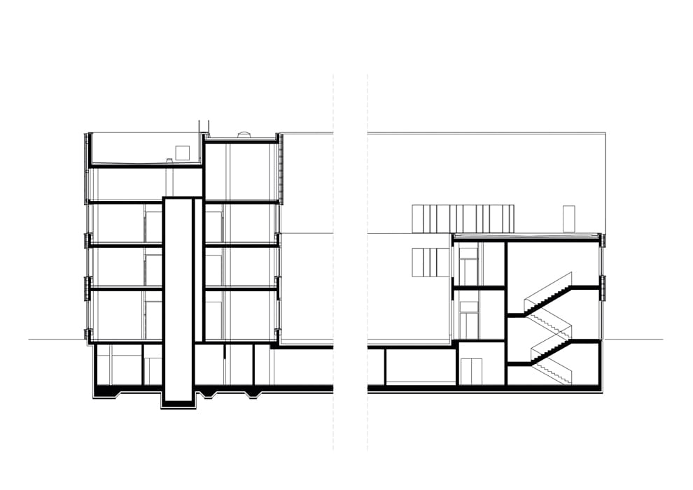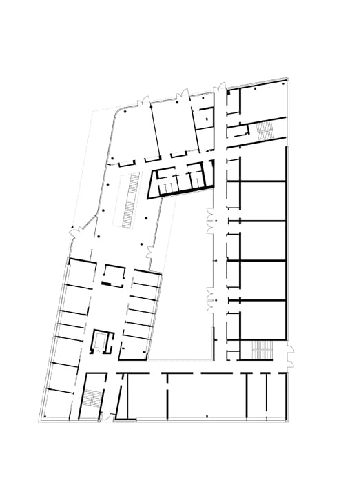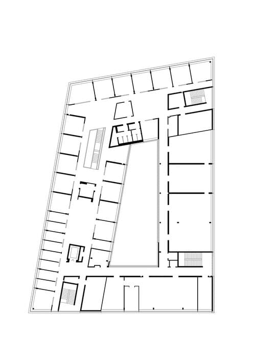 Das Raumprogramm besteht zu großen Teilen aus fensterlosen Laboren und Technikflächen. Um es gemäß der Zielvorgabe von Offenheit und Transparenz umzusetzen, gliederte das Büro das Volumen in zwei ineinandergreifende L-Formen, die einen Innenhof umschließen. Zum Platz hin sind auf drei Geschossen die Büro- und Besprechungsflächen angeordnet. Der zweite Gebäuderiegel nimmt sämtliche Laborbereiche auf: Öffentlichkeitsnahes Arbeiten und Diskutieren nach außen – zurückgezogenes Messen und Forschen nach innen. Das gläserne Foyer im Erdgeschoss erlaubt Einblicke über den Innenhof bis hin zu den Forschungsbereichen. Der ebenfalls gläserne Konferenz- und Seminarraum, prominent an der Ecke positioniert, wird zum Schaukasten des Gebäudes. Eine schlanke Freitreppe führt vom Foyer über die Büroebenen bis zur Dachterrasse, ein halböffentlicher Raum mit Blick über den Ringboulevard. Die Fassadenverkleidung aus stranggepresster Keramik stellt eine interessante Lösung dar. Die kleinteilige, vertikale Struktur der Platten schafft aus der Ferne ein homogenes Fassadenbild und belebt in der Nähe die großen, opaken Flächen im Bereich der physikalischen Labore und der Technikräume. Rostpigmente in der Glasur erzeugen eine besondere Tiefe und schillernde Vielfalt. Die langgezogenen Fensterbänder setzen sich vor diesem Hintergrund als helle, klare Einschnitte ab. Einen besonderen Akzent zum Platz hin setzt der Ausschnitt der Dachterrasse.