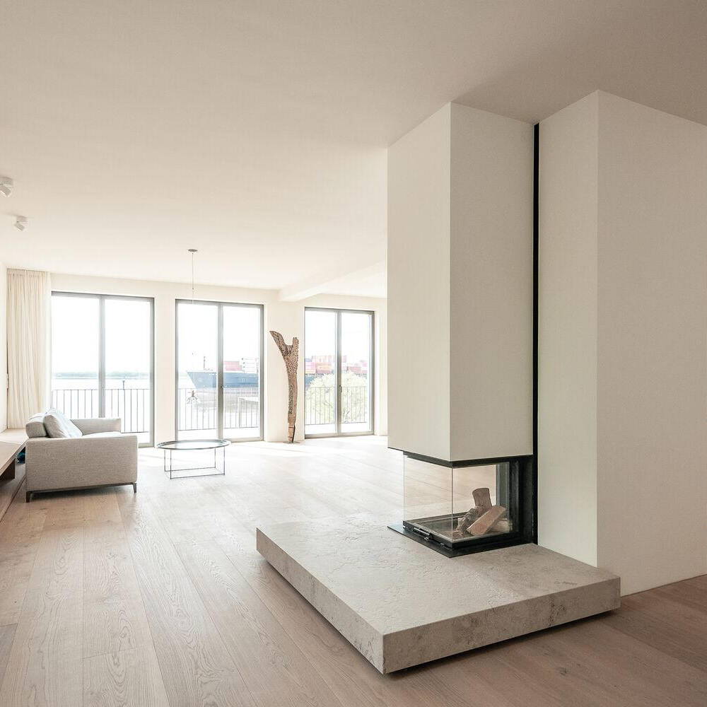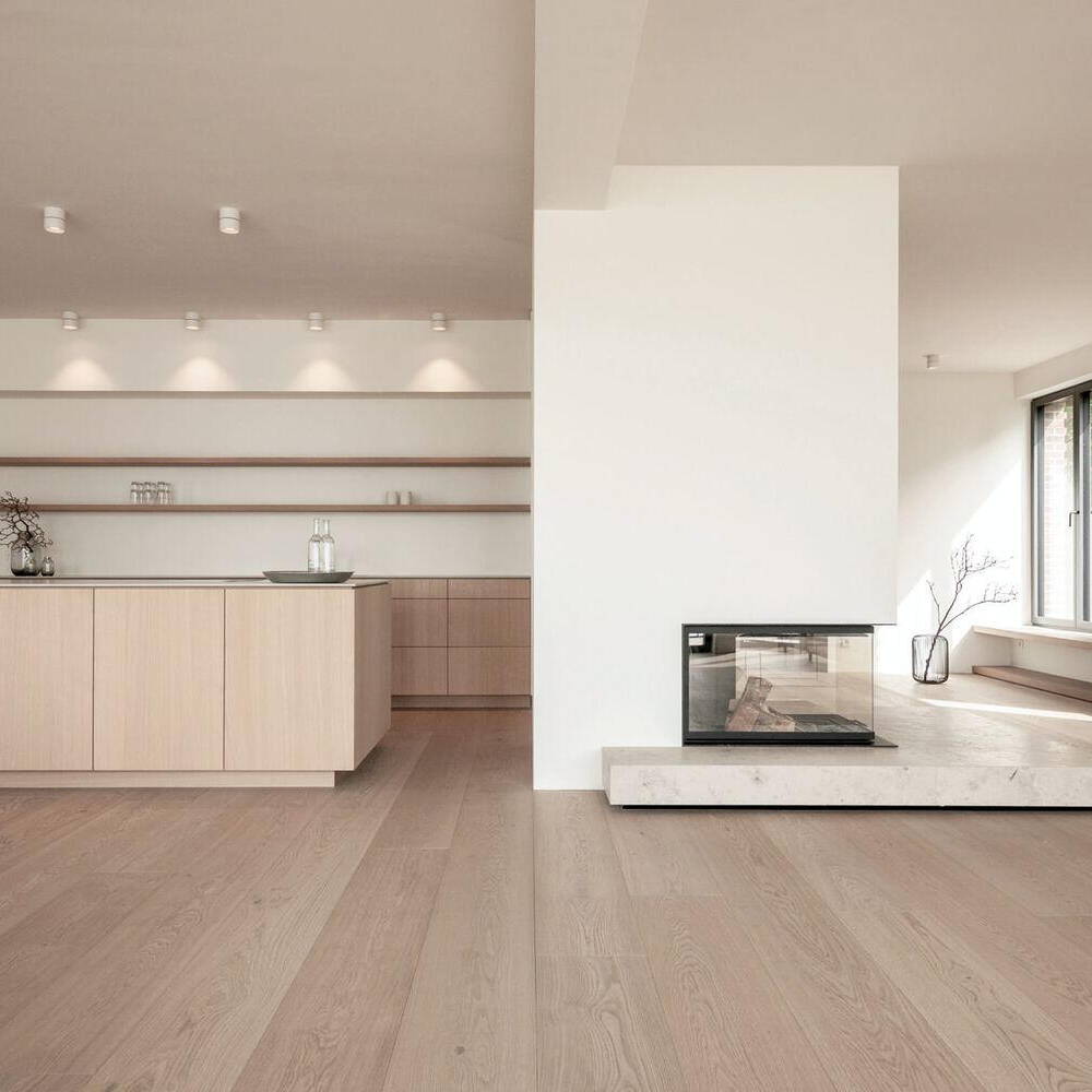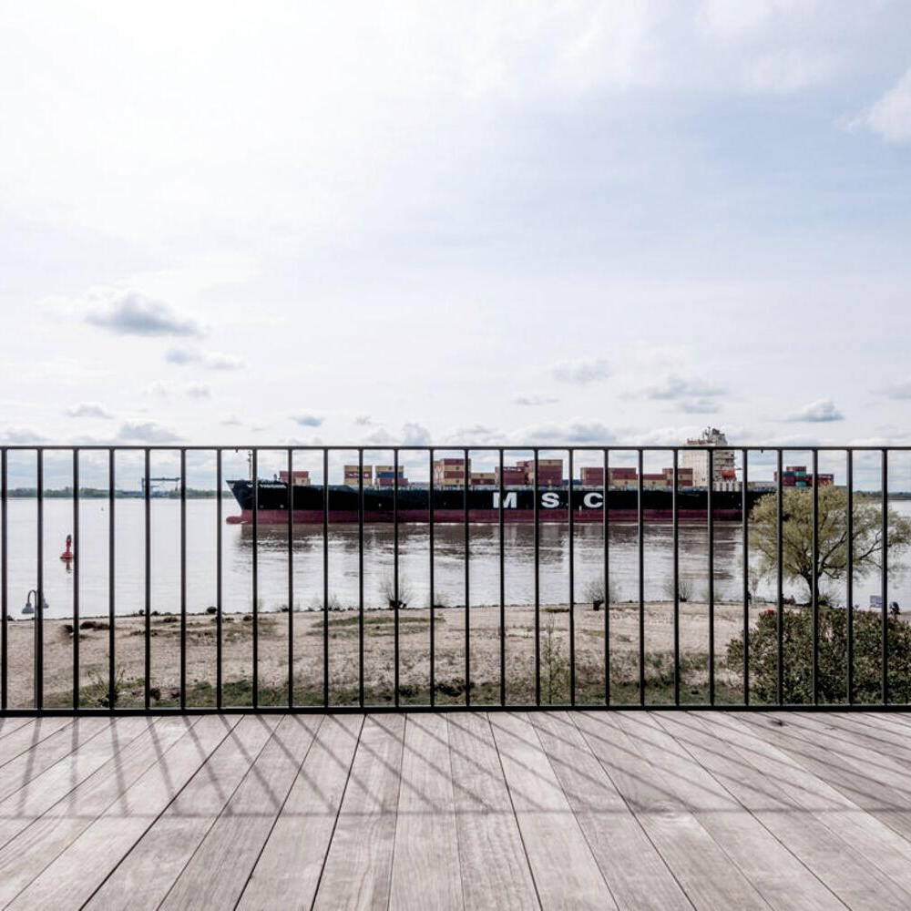 Im Inneren schaffen hochwertige, natürliche Materialien in hellen, warmen Tönen eine ruhige und entspannende Atmosphäre, sie greifen die Farbwelt des Strandes auf und versetzen nahezu in Urlaubsstimmung. Der Blick über die Elbe verändert sich ständig und zeigt bei Sonne, Nebel, Sturm oder in der Dämmerung ein faszinierendes Schauspiel der Natur, aus nächster Nähe durchkreuzt von haushohen Containerschiffen. Das Raumprogramm enthielt einige besondere Wünsche: So sollte es ein Atelier für kreatives Arbeiten sowie eine großzügige Werkstatt mit Hebebühne geben, da die ganze Familie in ihrer Freizeit gerne künstlerisch und handwerklich tätig ist. Um maximal von dem grandiosen Ausblick über die Elbe zu profitieren, befindet sich die Wohnetage im Obergeschoss, erweitert um einen vorgelagerten, in filigraner Stahlkonstruktion ausgebildeten Balkon. Atelier, Büro sowie ein Kinder- und Gästebereich liegen im Erdgeschoss. Der private Rückzugsbereich mit Schlaf- und Enkelzimmer, Ankleide und großzügigem Bad befindet sich im Dachgeschoss. Die Werkstatt ist im Sockelgeschoss untergebracht und hat direkten Anschluss an den sonnigen und geschützten Hof vor dem Gebäude, so dass bei gutem Wetter auch draußen geschraubt und gebaut werden kann. Zur Freude der Familie, die sich ein belebtes Haus gewünscht hat, wird diese Möglichkeit mittlerweile auch von Freunden gerne genutzt. Hof und Sockelgeschoss sind in Hang und Freianlagen einmodelliert.