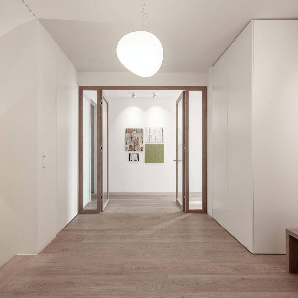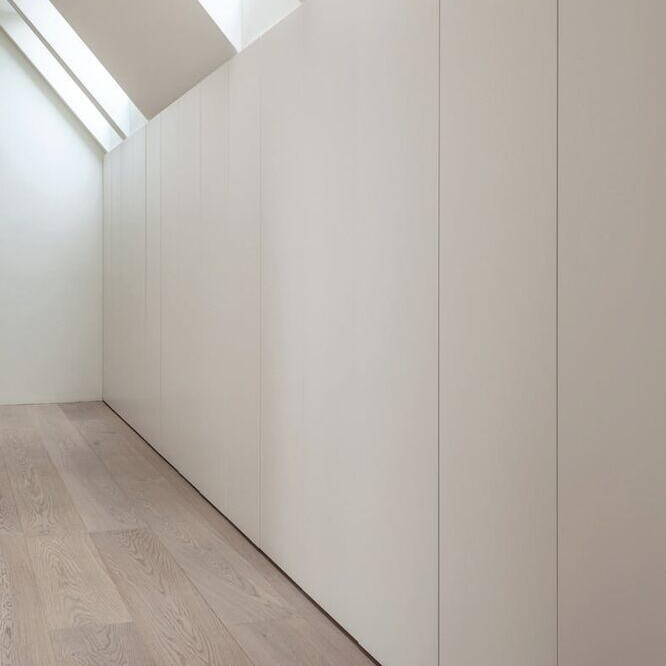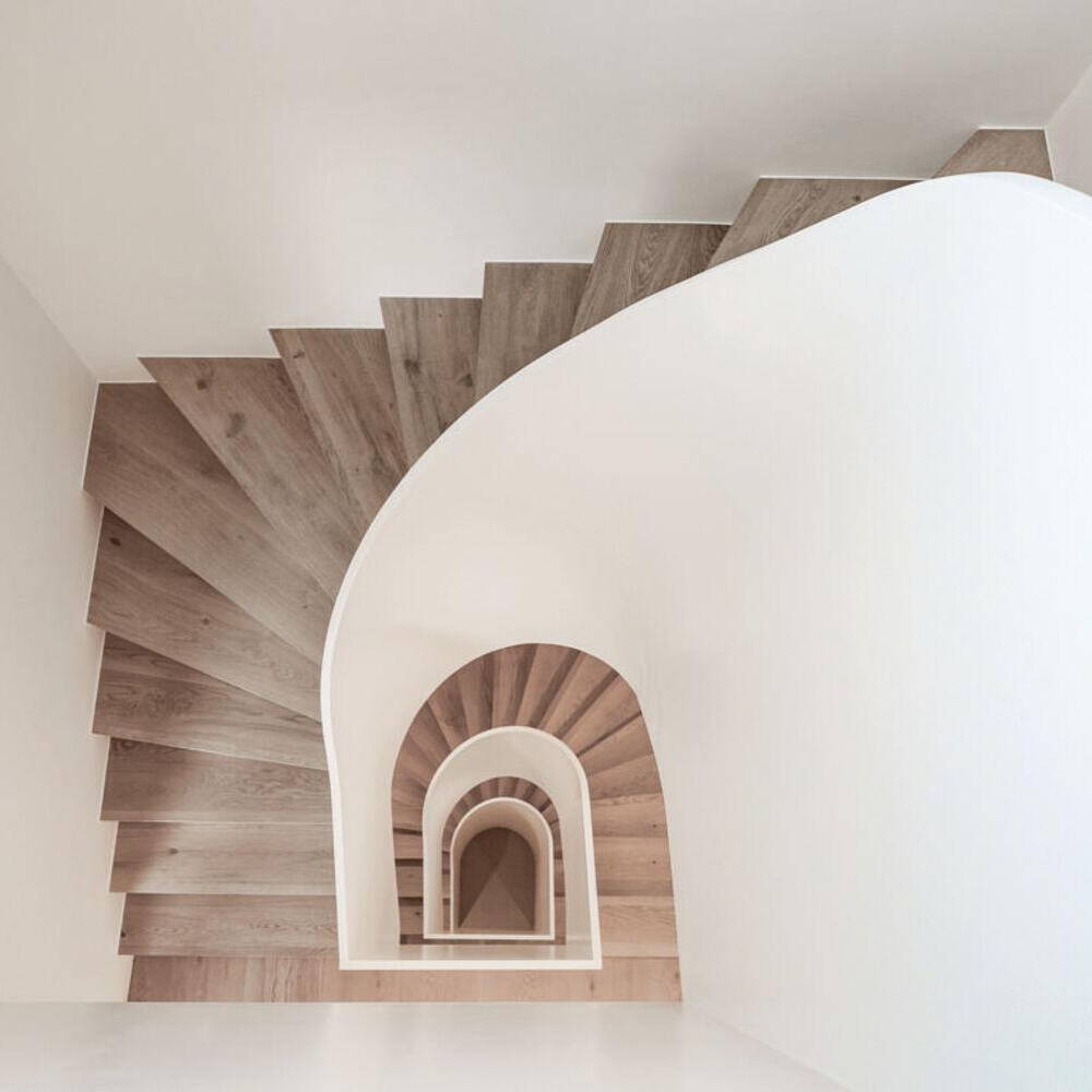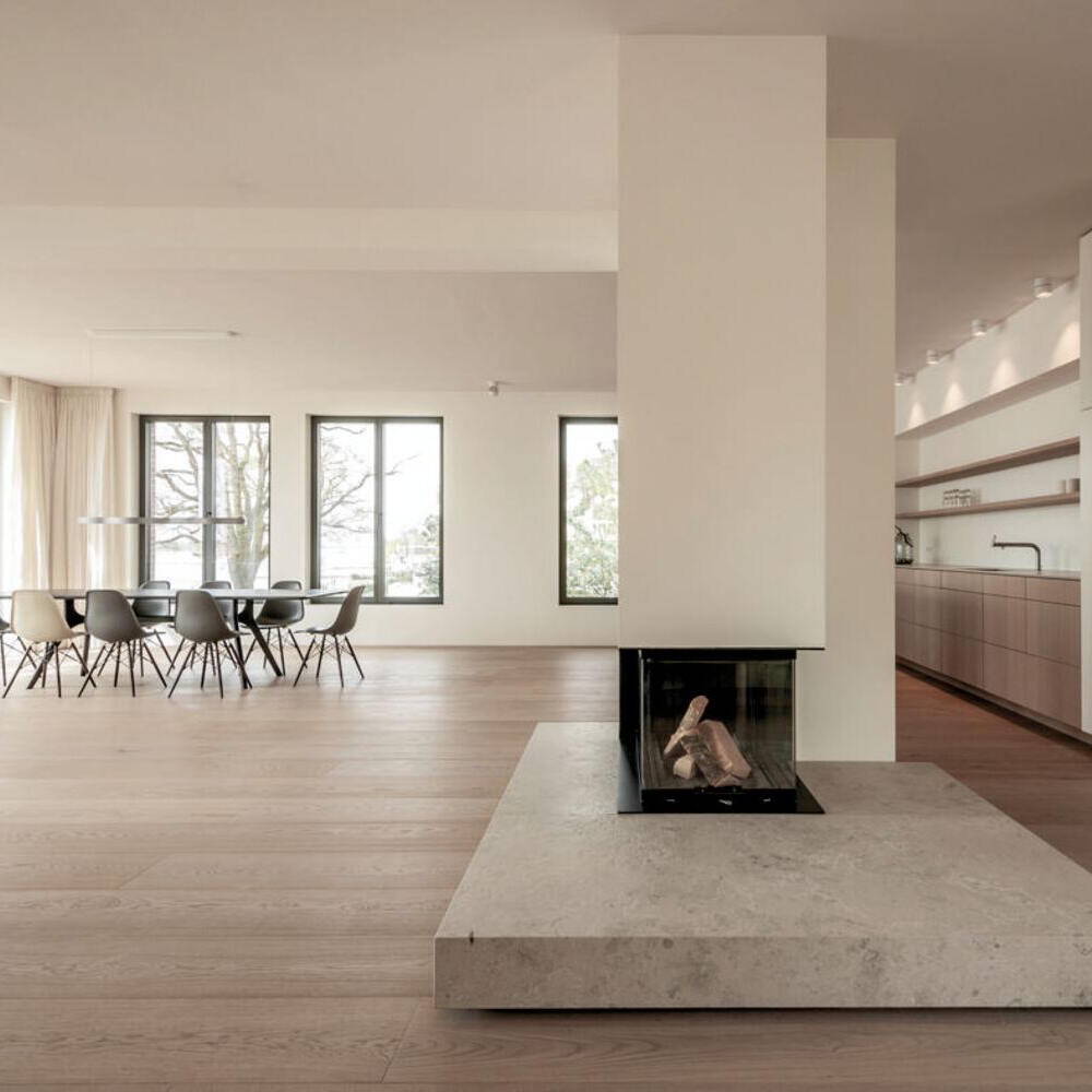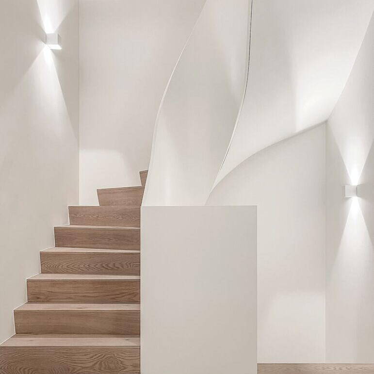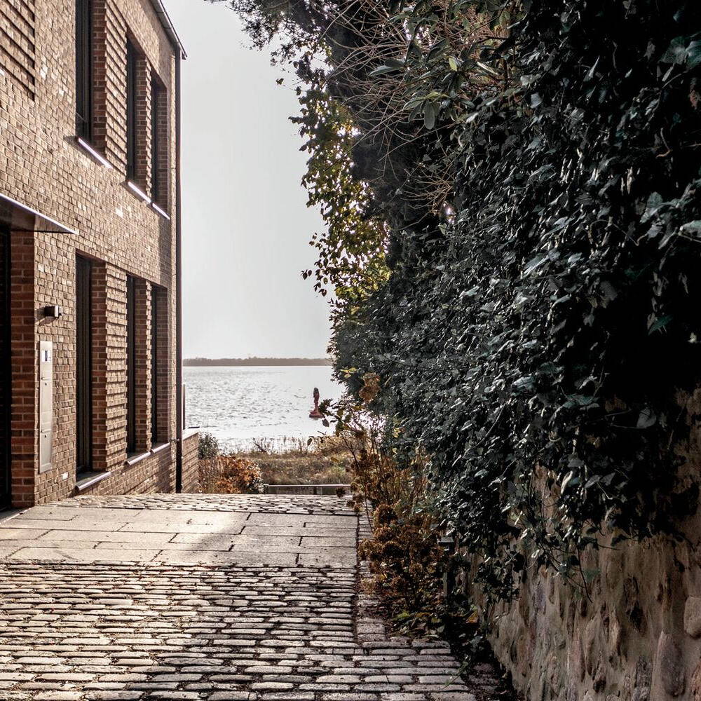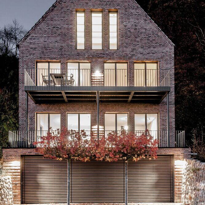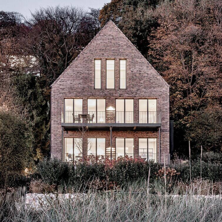 Die Grundrisse sind vorausschauend geplant: Eine zukünftige Teilung in bis zu drei separate Einheiten ist bereits mitgedacht. Jedes Geschoss kann unkompliziert zu einer eigenständigen Wohnung umgenutzt werden, Kombinationen sind ebenfalls möglich. Auch ein später gewünschter Raumverbund wurde konstruktiv berücksichtigt und Anschlüsse vorgelegt. Damit das Gebäude auch in fortgeschrittenem Alter noch uneingeschränkt nutzbar ist, verbindet ein Aufzug alle Geschosse. Die Architektur fügt sich sensibel in diesen besonderen Ort ein und ist dabei robust, zeitlos und flexibel.