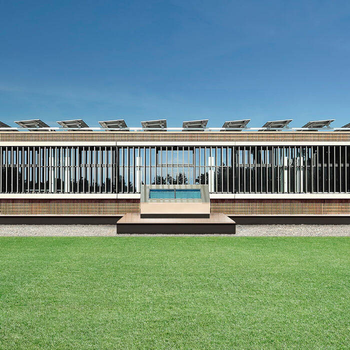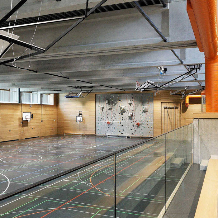 Die Aufgabenbeschreibung lautete: Generalsanierung der Dreifachsporthalle des Gymnasiums Neubiberg und Erweiterung um eine vierte Turnhalle. Neubiberg liegt im Südosten der Landeshauptstadt und gehört zum Landkreis München. Die Aufgabe wurde dem Münchner Architekturbüro Peck.Daam aufgetragen. Während das Bestandsgebäude des Gymnasiums, das aus den 1970er-Jahren stammt, schon 2013 saniert wurde und bereits 2003 wegen des höheren Schüleraufkommens einen Anbau erhalten hatte, blieb die Sporthalle bislang im ursprünglichen Zustand. Sie stammt aus derselben Zeit und schließt an den Anbau an. Sie war mittlerweile aufgrund baulicher und technischer Mängel ebenfalls sanierungsbedürftig und war wie das Schulgebäude an die Grenzen ihrer Kapazität gelangt, was eine weitere Turnhalle erforderlich machte. 2003 wurde dem Gebäudeensemble ein Bibliotheksanbau – ebenfalls von Peck.Daam – hinzugefügt, sodass nachgerade ein Patchwork-Ensemble entstanden war. Dies zu vereinheitlichen, gehörte sicherlich auch zu den aktuellen Aufgaben der Architekten. Was die Sanierung der bestehenden Sporthalle anbelangt, setzten sie sich zum Ziel, die Vorzüge der Architektur der 70er-Jahre herauszuarbeiten um insgesamt ein modernes, an den Bestand angepasstes Erscheinungsbild zu schaffen. Die Innenräume sollten mehr Helligkeit und Blickbezüge nach außen erhalten. Nachdem die Halle bis auf den Rohbau zurückgebaut worden war, wurde eine moderne, großzügige Pfosten-Riegel-Fassade eingebaut, sodass der Lichteinfall nun deutlich verbessert ist. Ergänzt durch eine moderne Innenausstattung und eine neue Holzfassade, hat die Halle eine neue einladende Wirkung erhalten. Die neue Sporthalle wurde an der Südseite der bestehenden Halle angebaut. Sie wurde so konstruiert, dass das Dach begehbar ist. Breite Stufen führen hier nach oben, wo auch Sitzgelegenheiten geschaffen wurden. Rundum ist eine verglaste Balustrade als Absturzsicherung angebracht. Seitlich ist die Treppe durch eine Boulderwand begrenzt. In das Dach sind begehbare Oberlichter mit umlaufenden Sitzbänken eingebaut, die einerseits zum Verweilen einladen und andererseits in der darunter liegenden Halle für Helligkeit sorgen.