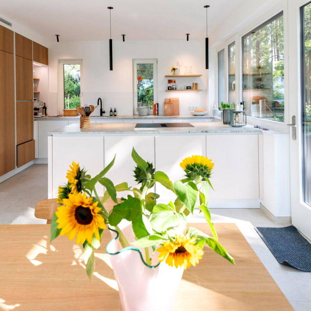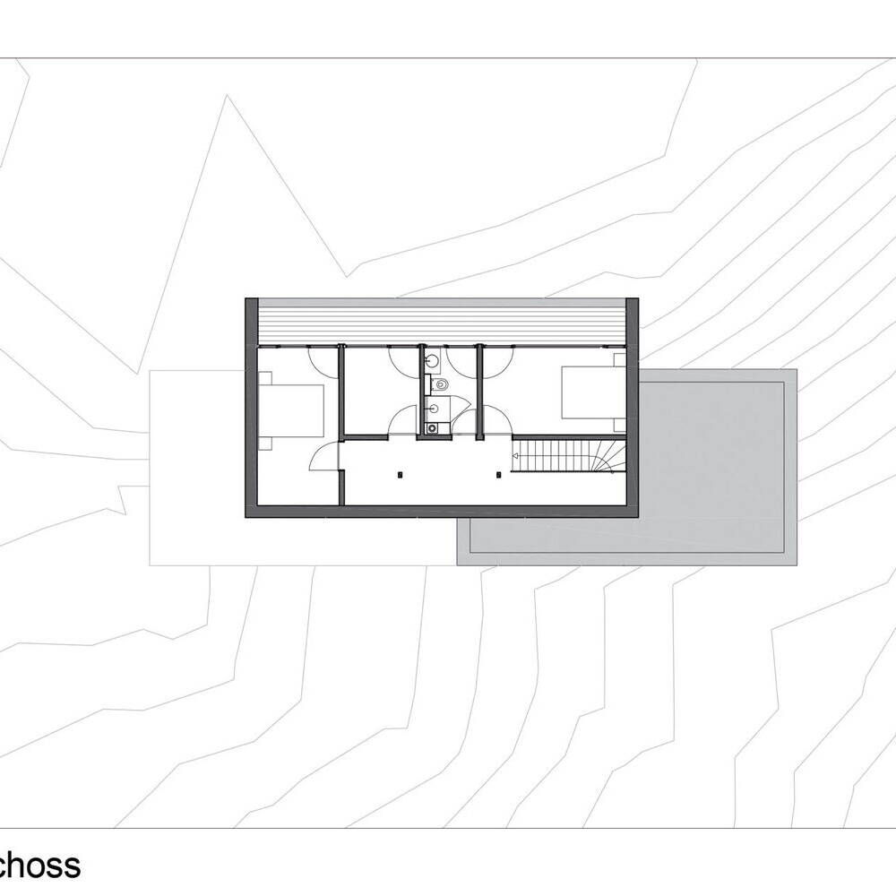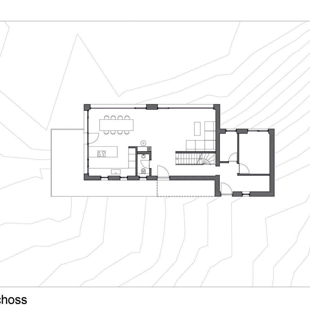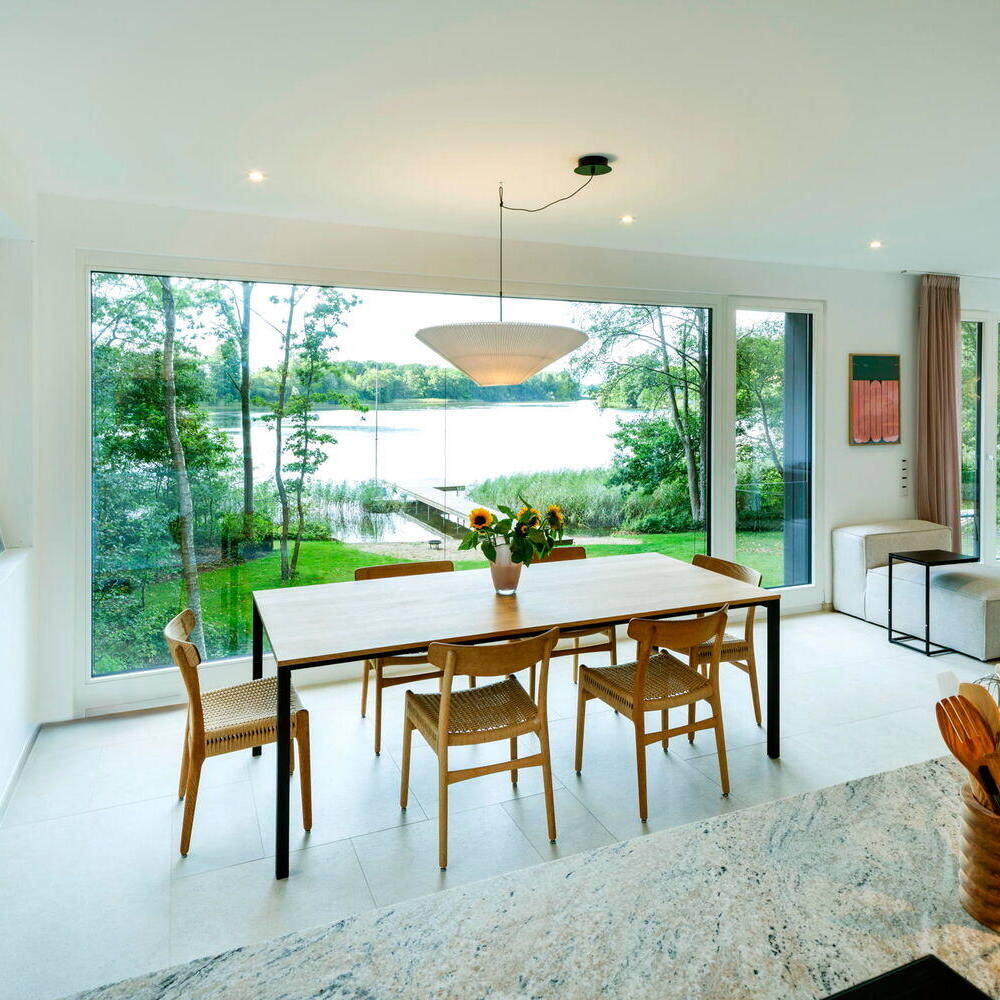 Im Inneren des Hauses setzt sich die klare Struktur fort. Das Erdgeschoss ist als offener Raum konzipiert. Ein weiteres Highlight ist die Küche, deren horizontal angeordnete Fenster einen Blick in den Wald freigeben. Hier dominieren schlanke Birken und hohe Nadelbäume, die der Umgebung eine ruhige, fast meditative Atmosphäre verleihen. Das Obergeschoss beherbergt drei Schlafräume und ein Badezimmer, die allesamt mit bodentiefen Fenstern ausgestattet sind. Der Schnitt des Satteldachs und die integrierte Loggia sorgen dafür, dass jedes Zimmer seinen eigenen Zugang zur Dachterrasse hat – ein privater Rückzugsort mit freiem Blick auf den See. Die Hanglage ermöglicht auch im Untergeschoss große Fensterflächen, die nicht nur Tageslicht in den Raum lassen, sondern auch den barrierefreien Zugang zum Garten und dem Seeufer gewährleisten. Der direkte Zugang zum Ufer des Wardersees macht das Haus besonders attraktiv für Naturliebhaber:innen. Die Außenanlagen wurden mit Bedacht und Zurückhaltung gestaltet, sodass der Fokus weiterhin auf die umgebende Natur gerichtet bleibt. Heimische Gewächse und eine minimalistische Gartenplanung schaffen eine naturnahe Atmosphäre, die das Haus ideal ergänzt. Eine geschwungene Auffahrt entlang der Ostseite lässt Besucher:innen sanft in das harmonische Gesamtbild eintauchen. Die konsequente Wahl der natürlichen Materialien, die durchdachte Gestaltung der Räume und die weiten Ausblicke machen dieses Haus zu einem einzigartigen Rückzugsort.
